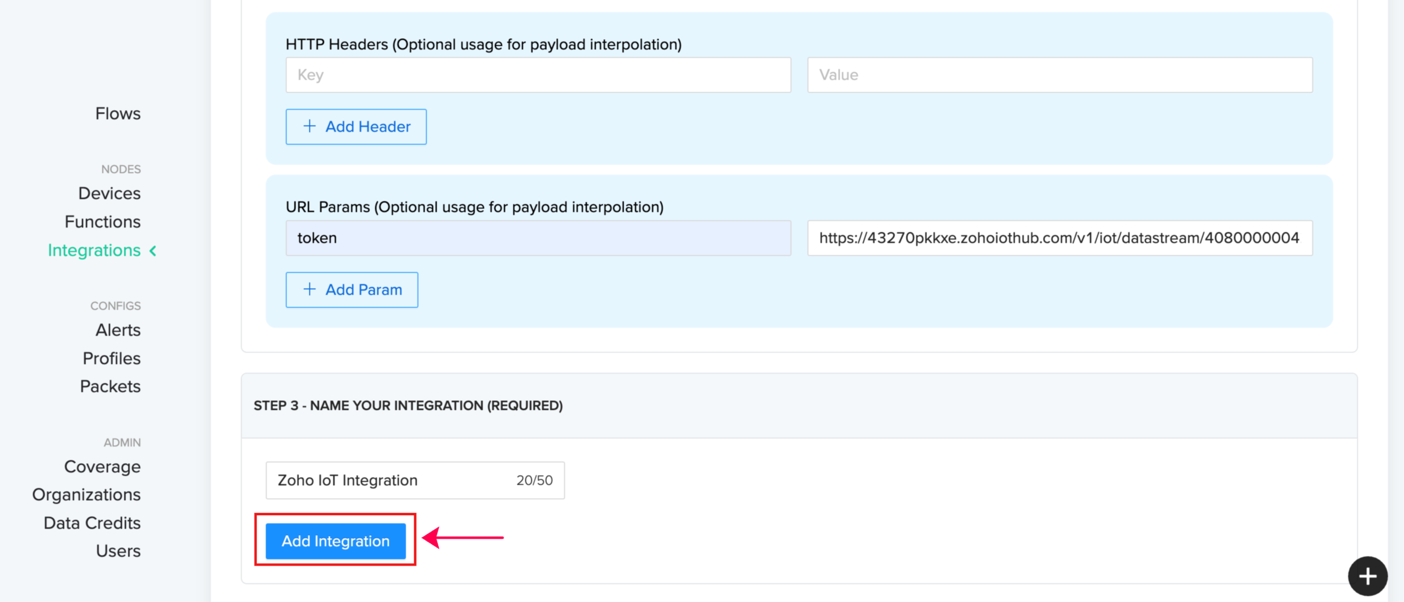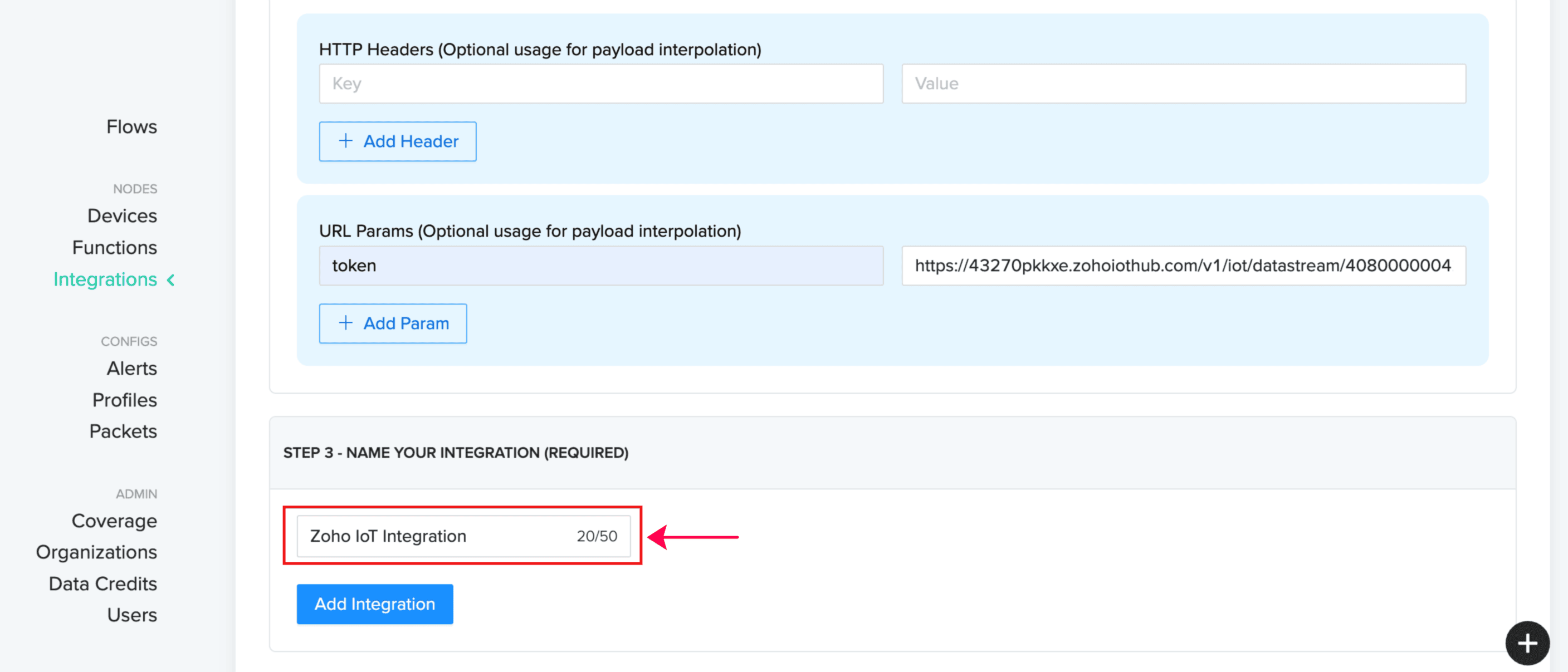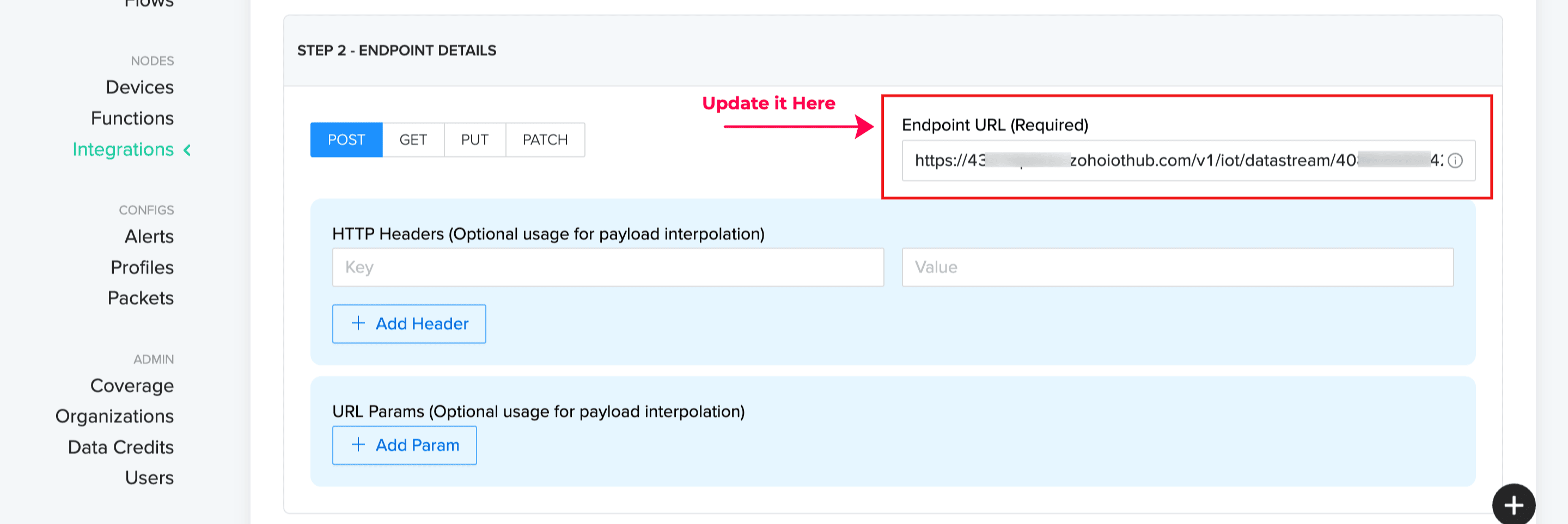 • Endpoint URL: Retrieve the value from the Zoho IoT application's connection credentials.