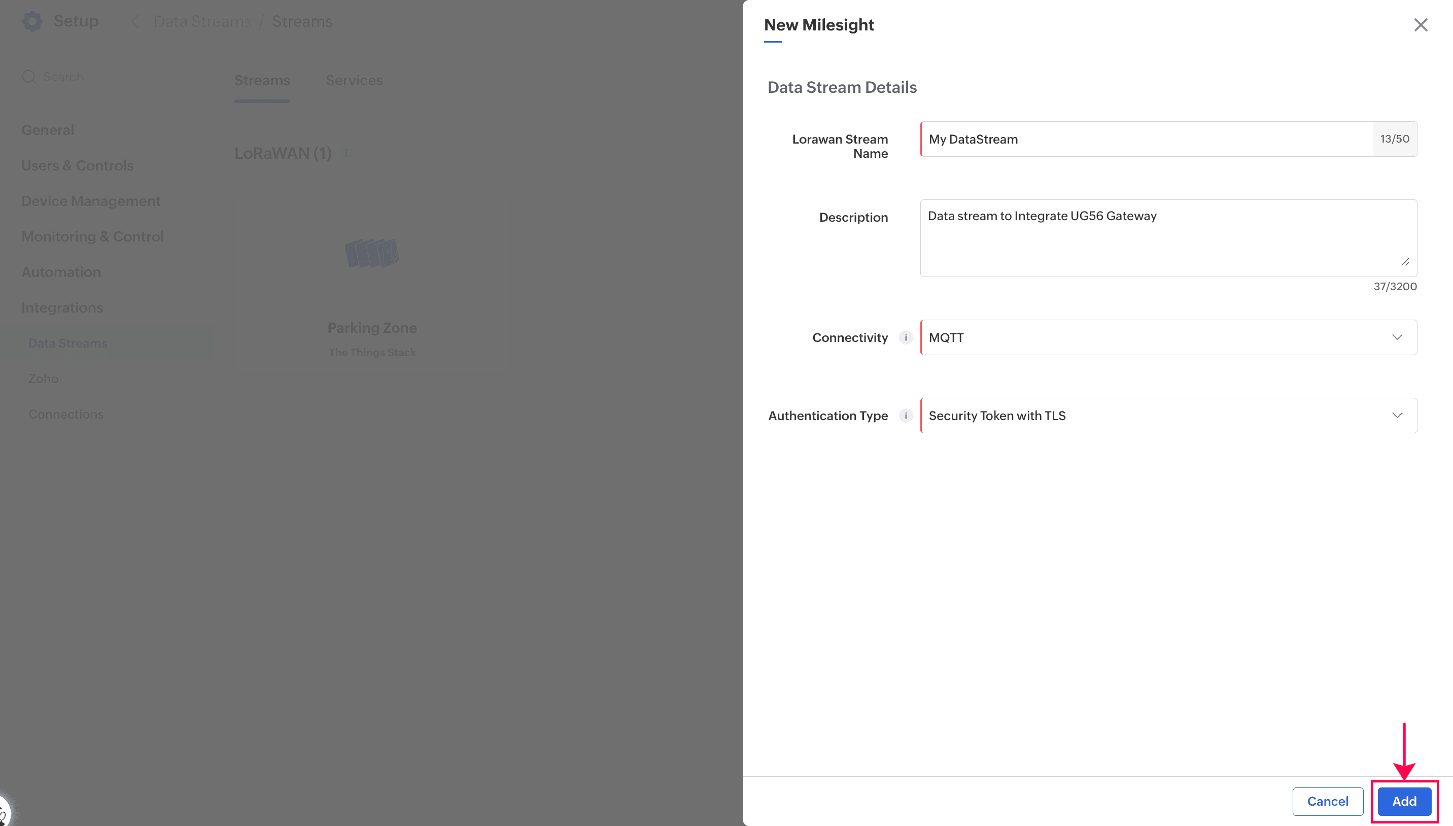Adding a Milesight Data Stream in the Zoho IoT application.