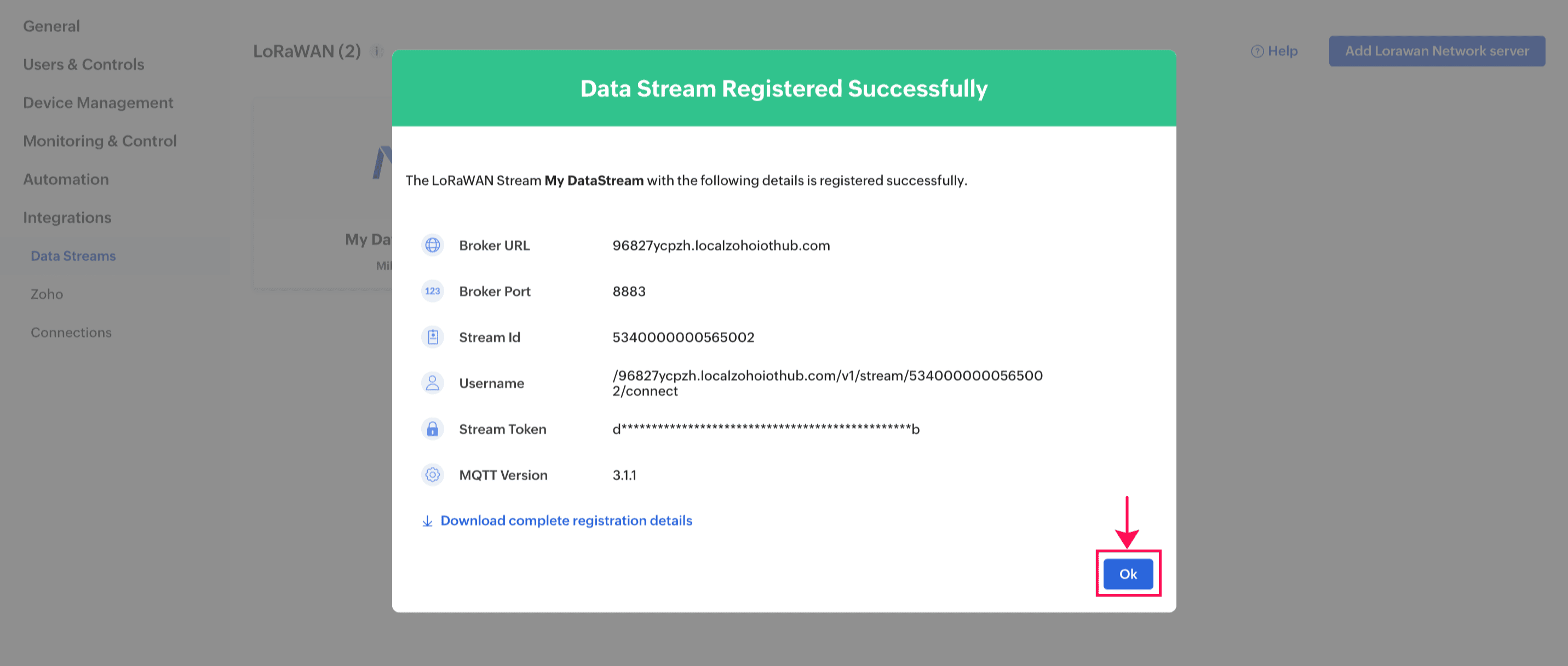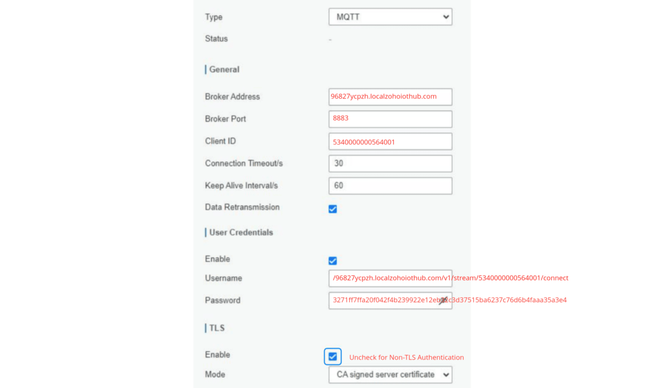 Now that the Data Stream has been created and you have access to its connection details, you can update these details in the Milesight Gateway device to establish a connection with the Zoho IoT application.
