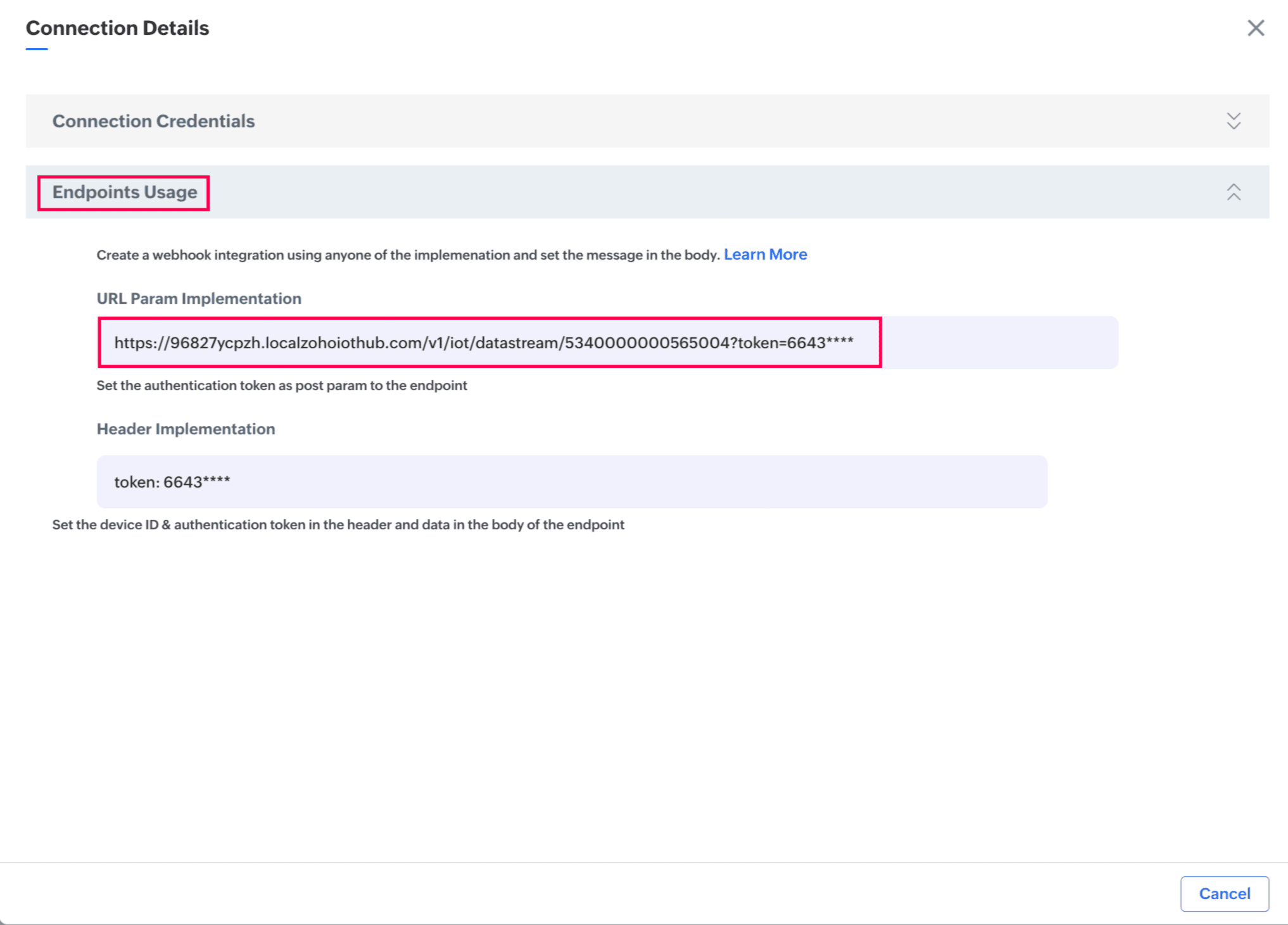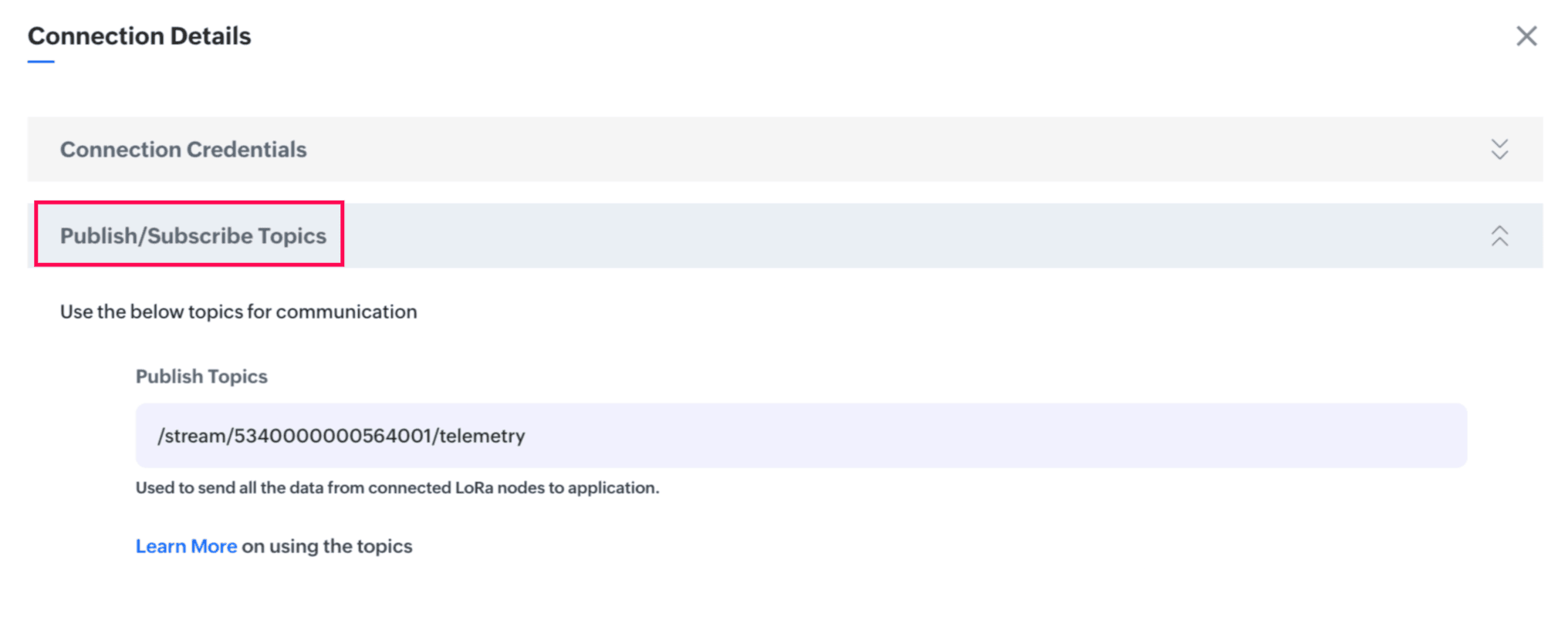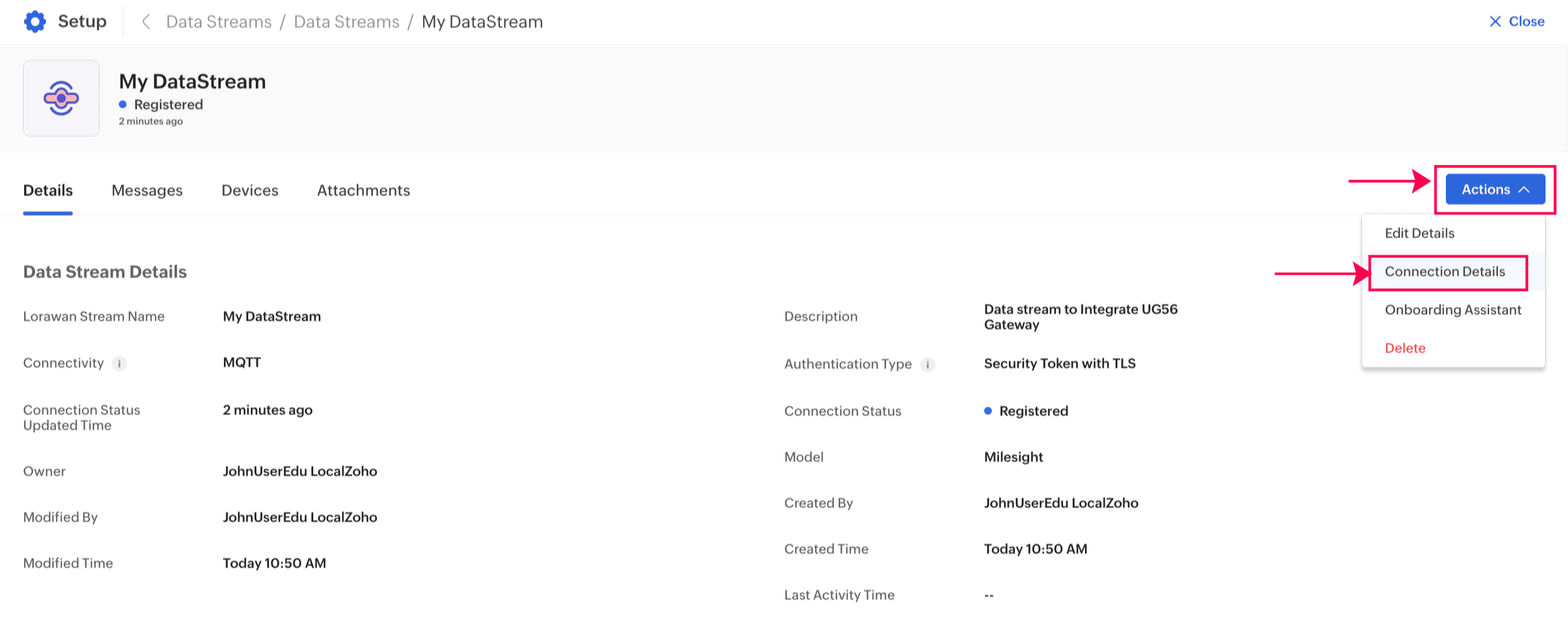 [ Note: You access the connection details anytime by navigating to Settings > Data Stream > Click on the required Data Stream > Actions > Connection Details.]Enabling Data Transmission in the Milesight Gateway