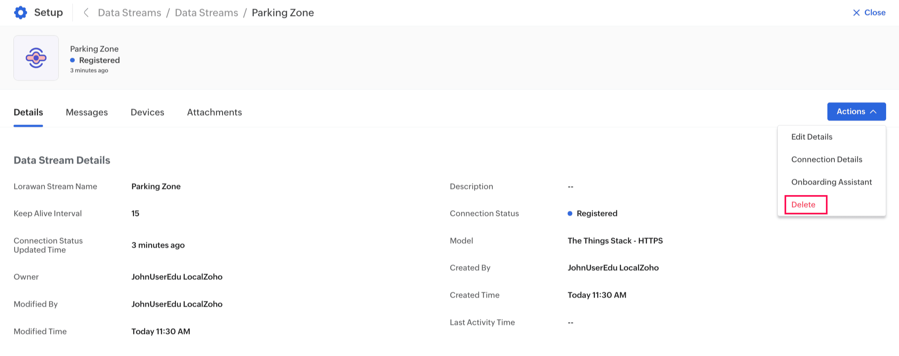 When a data stream is properly integrated to a LoRa Network Server (LNS), messages from LoRa nodes registered in the LNS are automatically forwarded to the Zoho IoT application. You can view all incoming messages in the data stream’s Messages tab. To ...