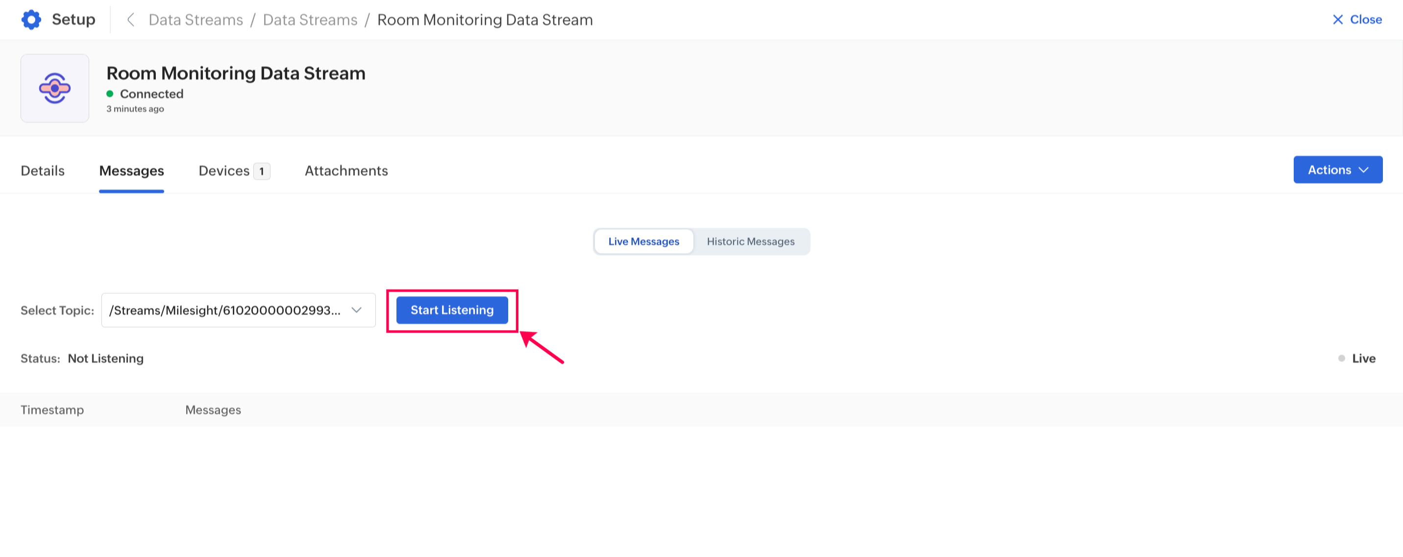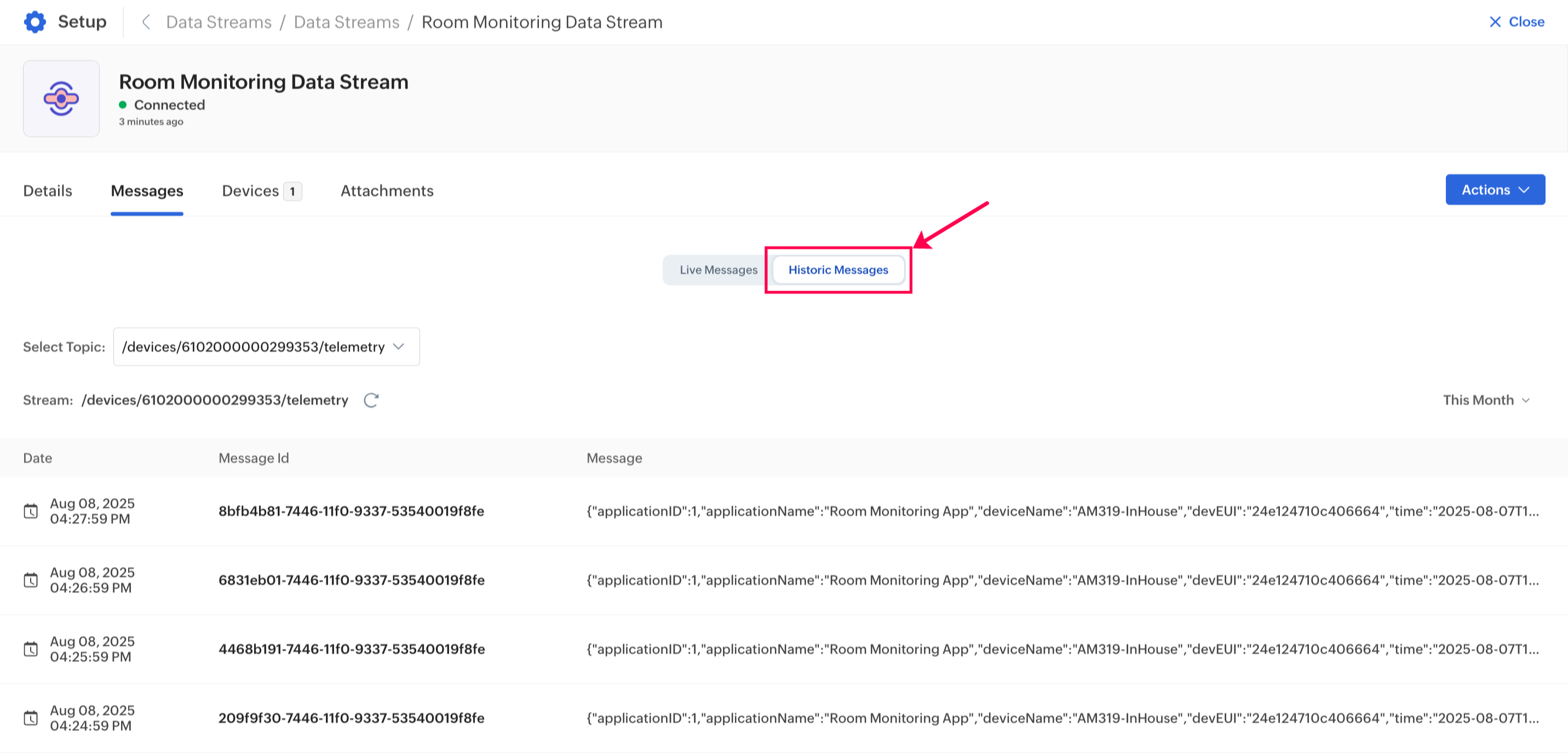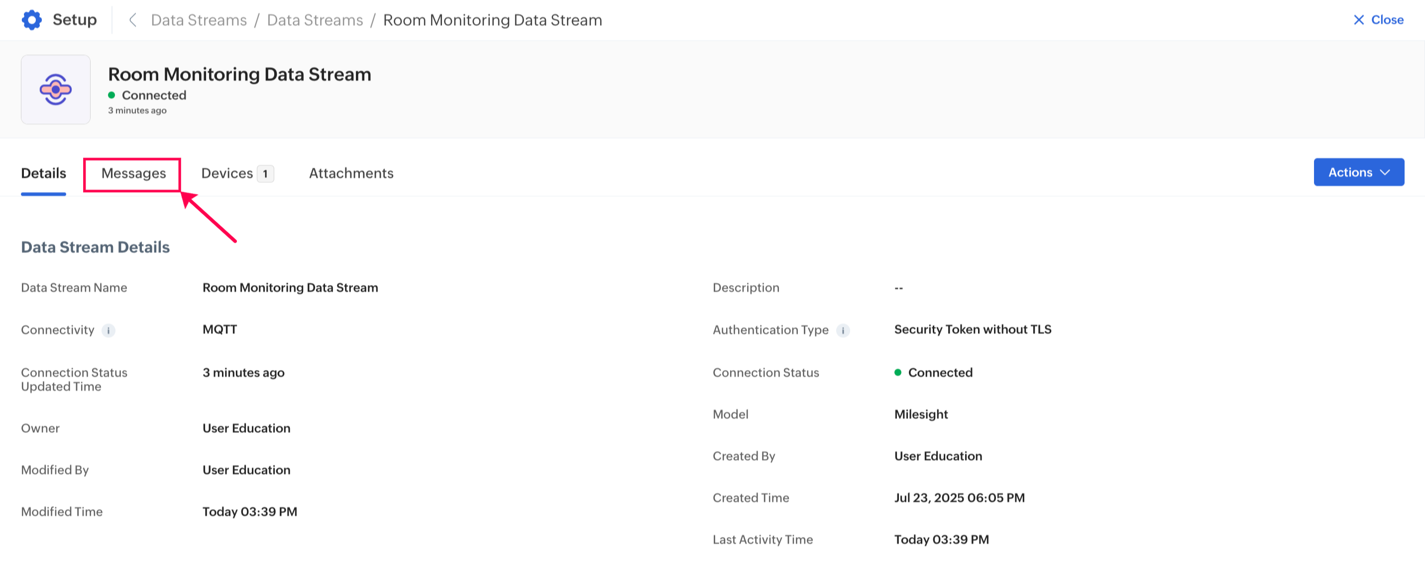 When a data stream is properly integrated to a LoRa Network Server (LNS), messages from LoRa nodes registered in the LNS are automatically forwarded to the Zoho IoT application. You can view all incoming messages in the data stream’s Messages tab.