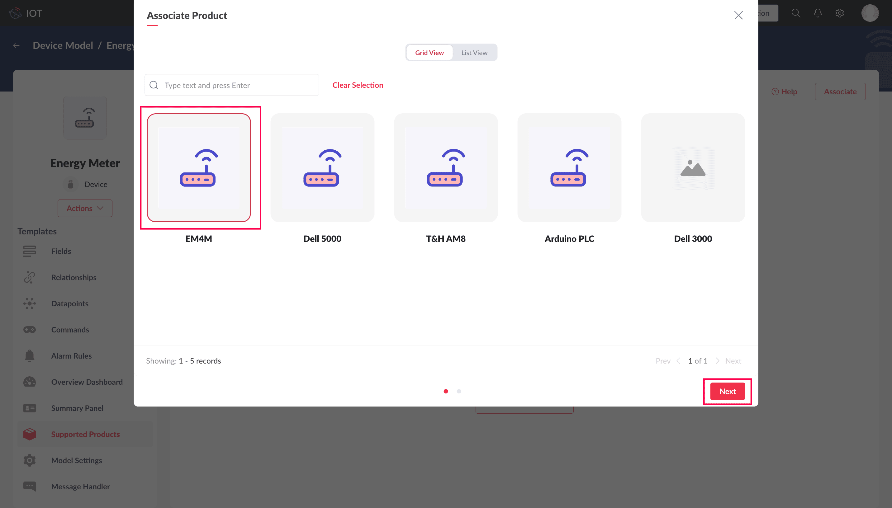6. Select the user defined device product from the drop-down list and click Next. For this illustration, the device product: EM4M is considered.