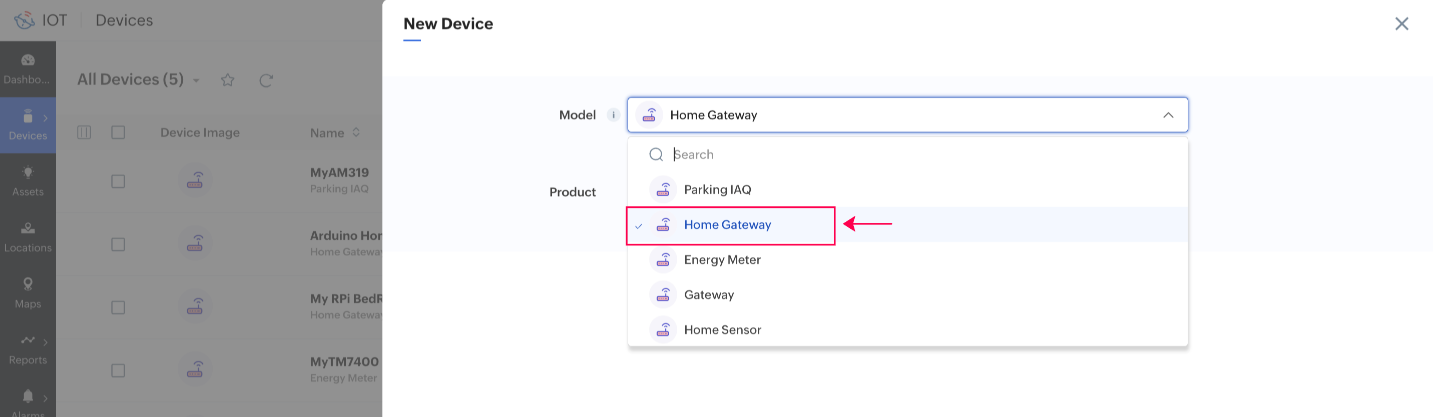 5. Select the device model to which the required device product is associated. For this illustration, Home Gateway device model is selected.