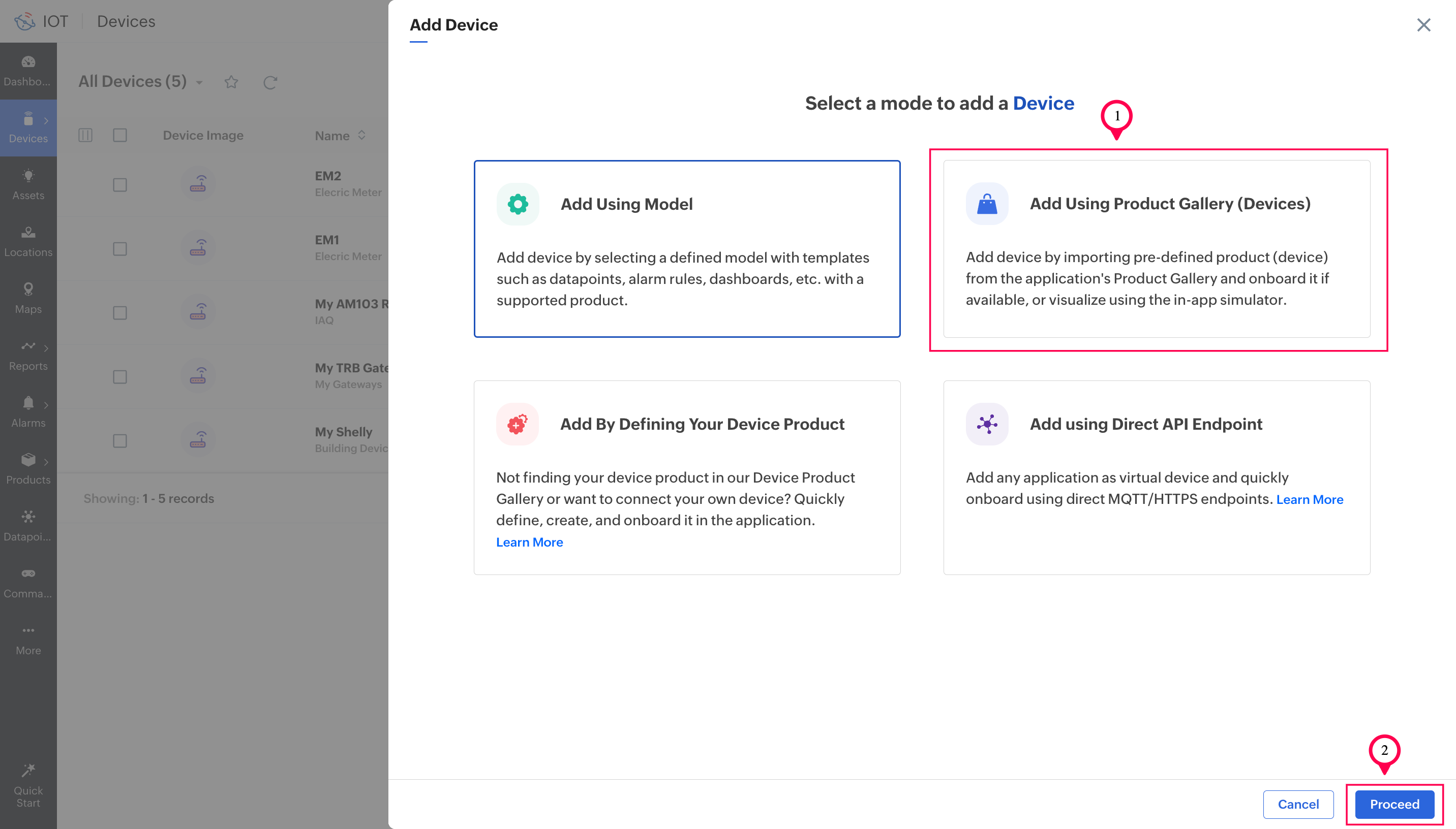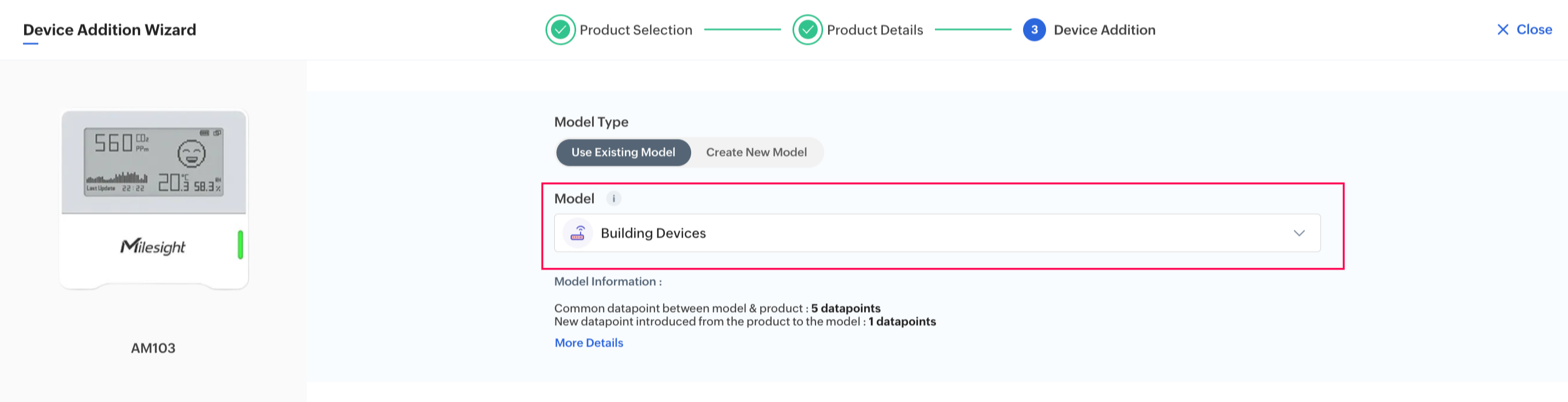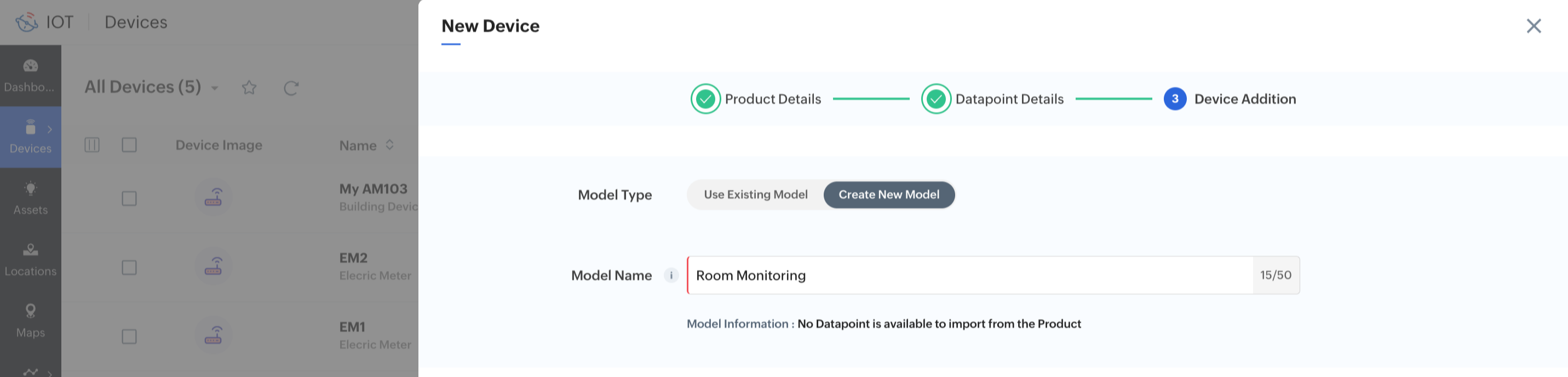 9. Now you can add a device based on the device product. Select an existing device model or create a new device model.