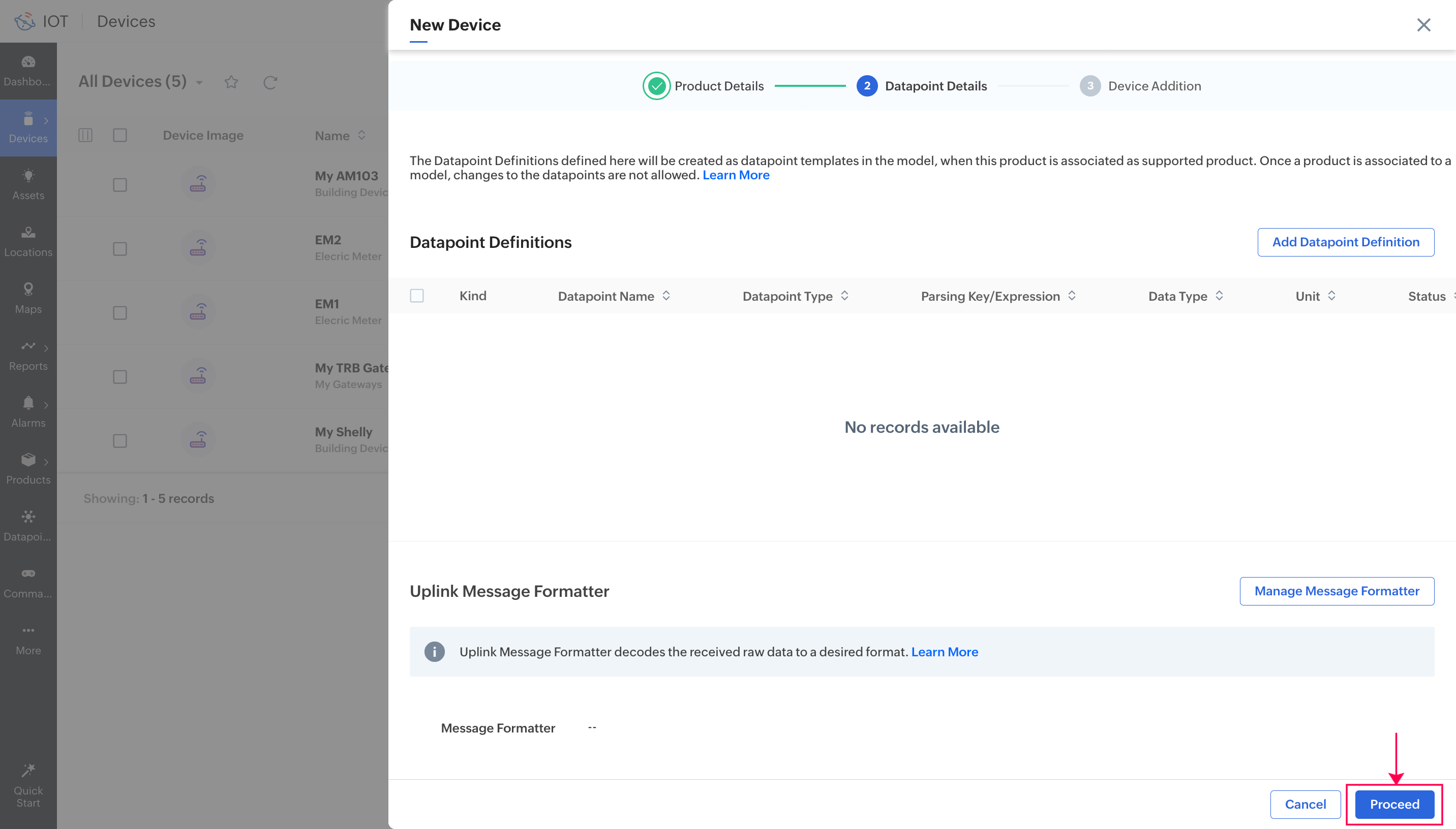 8. Add the datapoint definitions and the uplink message formatter for your device product, then click Proceed. You can also choose to add or edit these later.