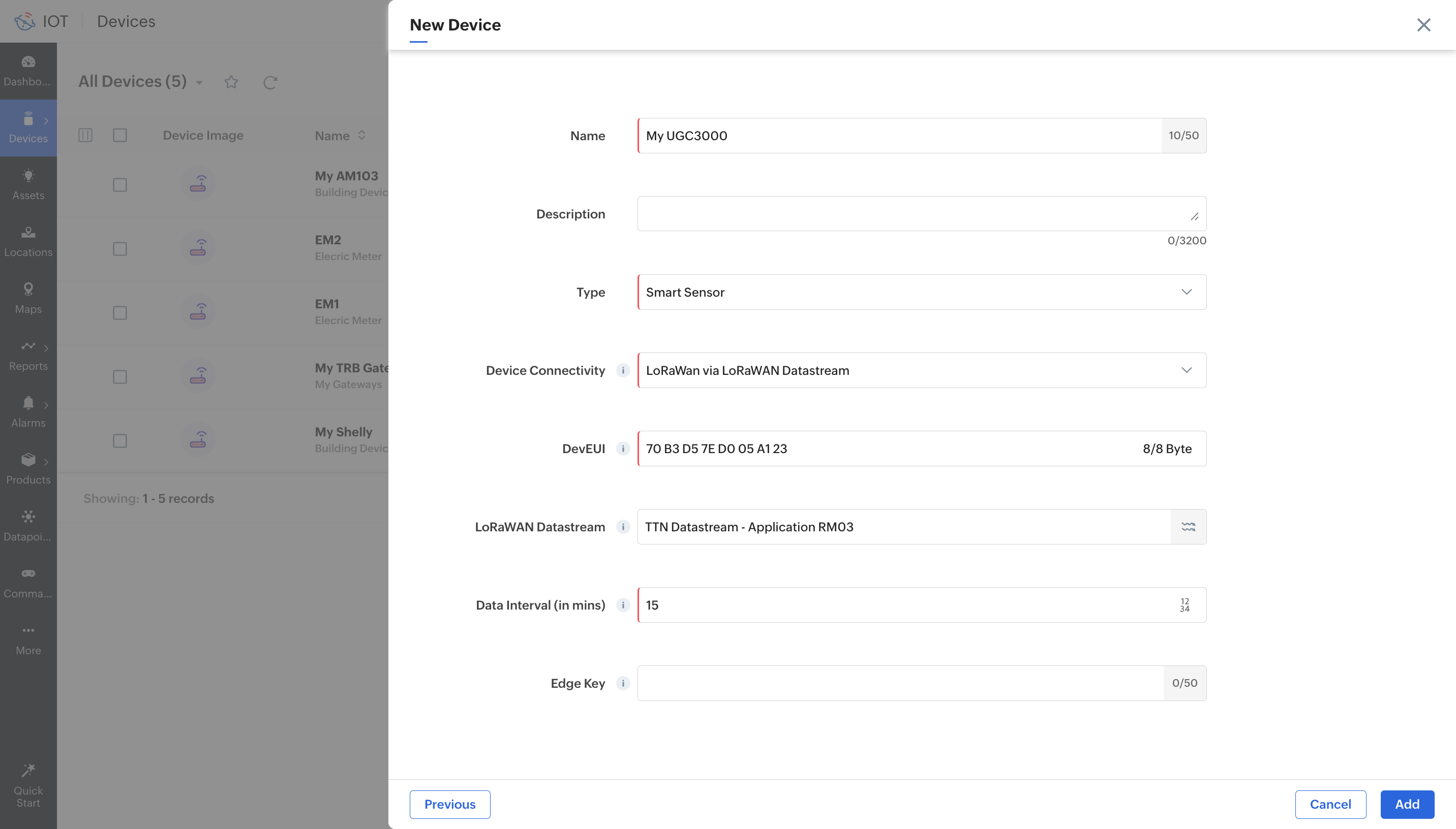 10. For the Datastream field, you can select the Datastream integrated with the required LoRa Network Server (LNS) or leave the field empty and assign a Datastream later.