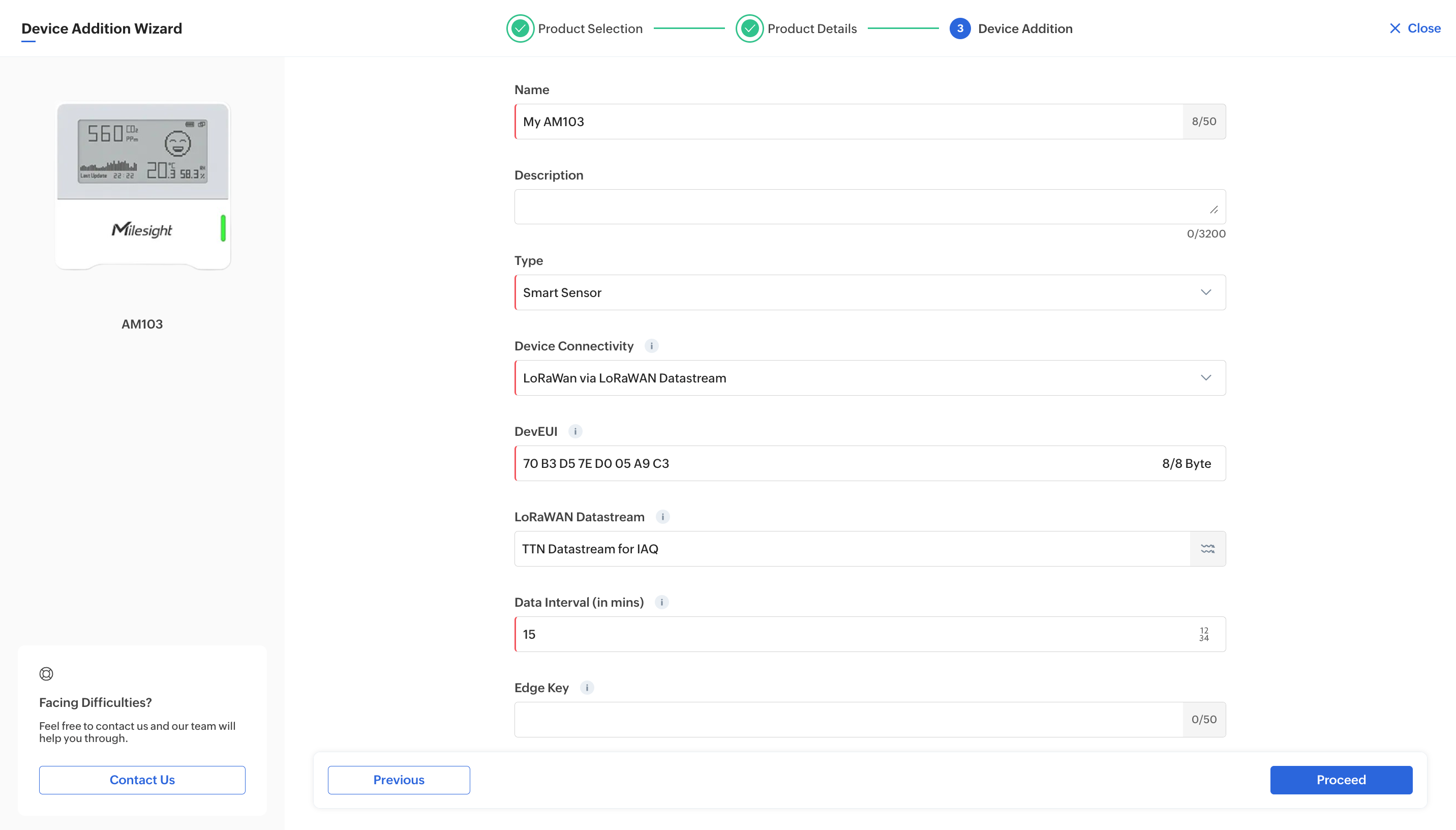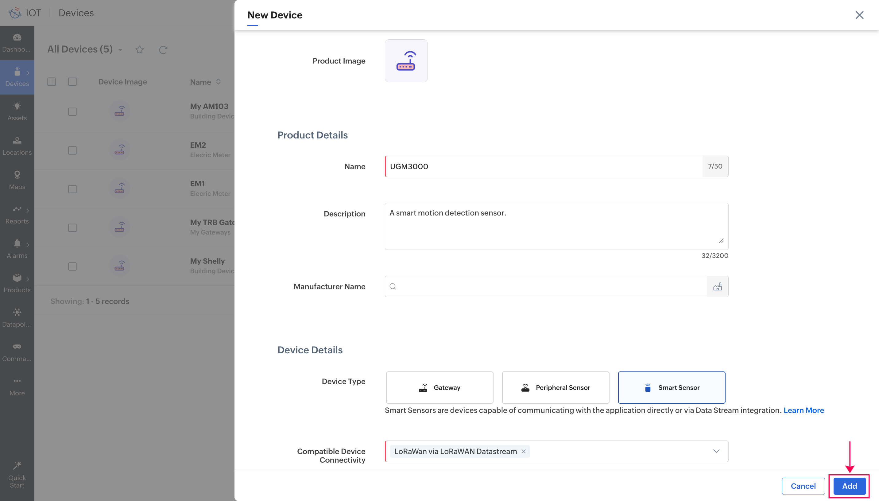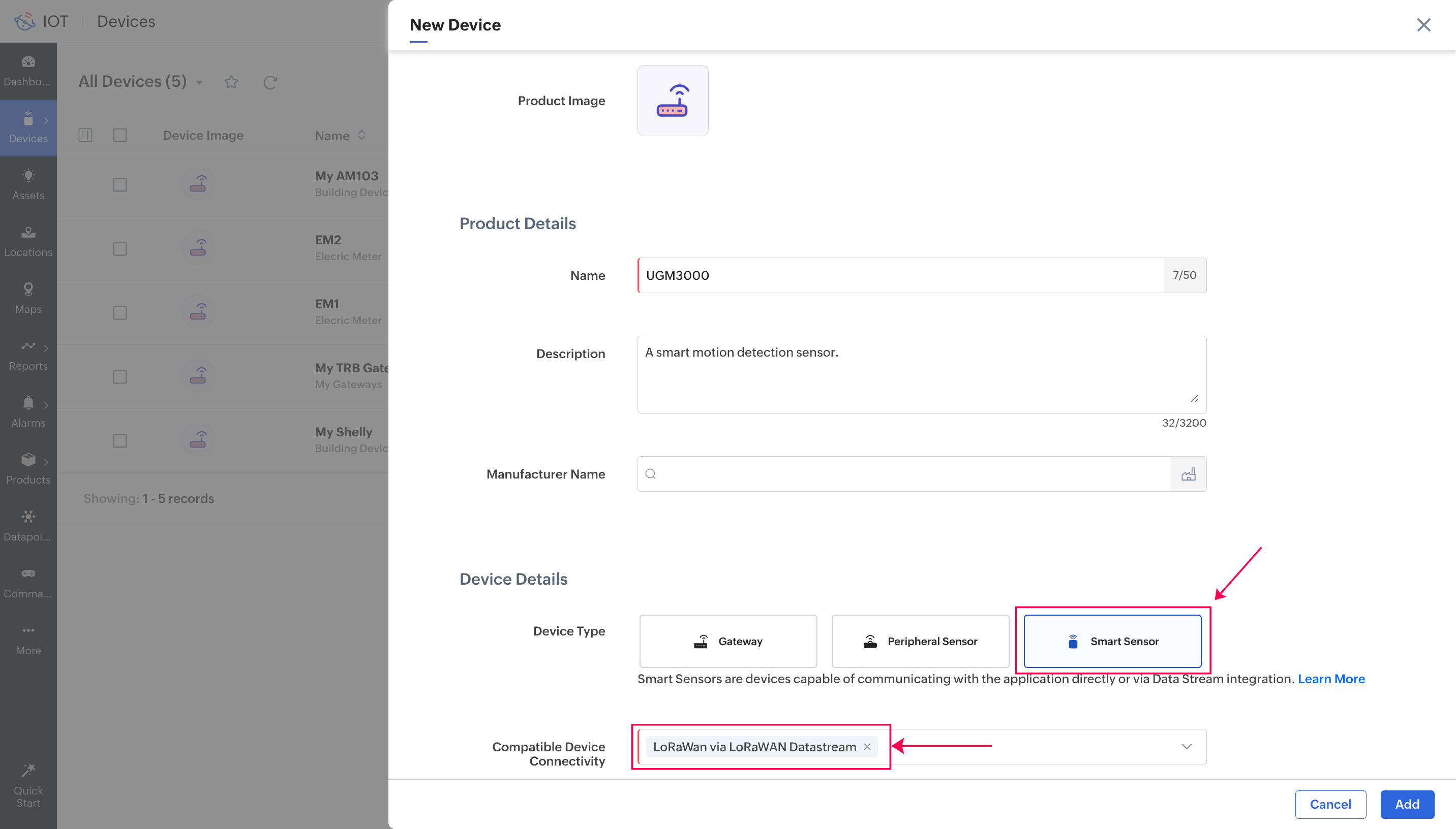 6. Make sure to select Smart Sensor as the Device Type and LoRaWAN via LoRaWAN Datastream as the Compatible Device Connectivity.