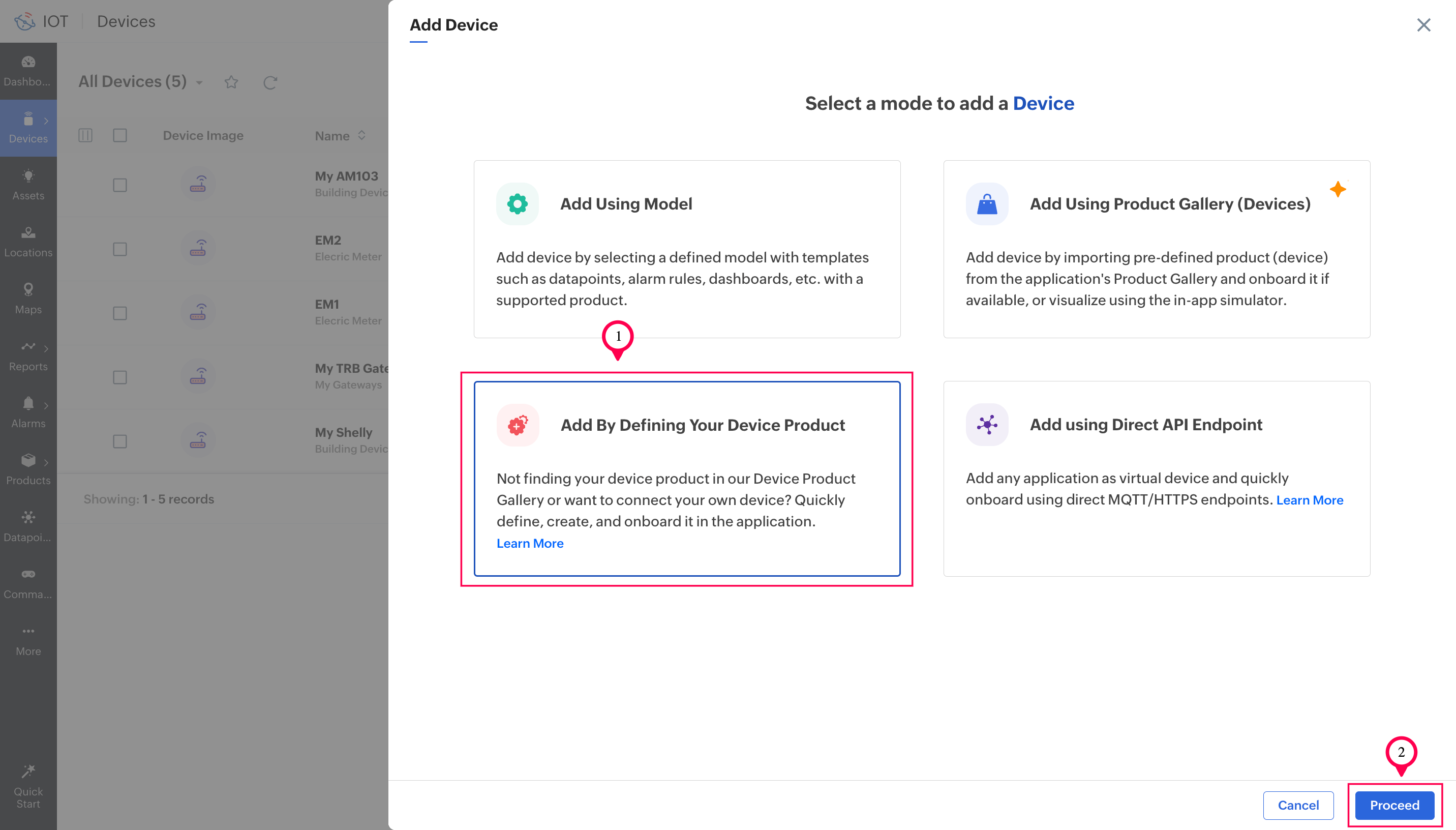 In this approach, you will first create a device product for your LoRa device, and then use it to add a device. Once the device product is created, it will appear in the Device Gallery, allowing you to reuse it to add additional devices as needed.