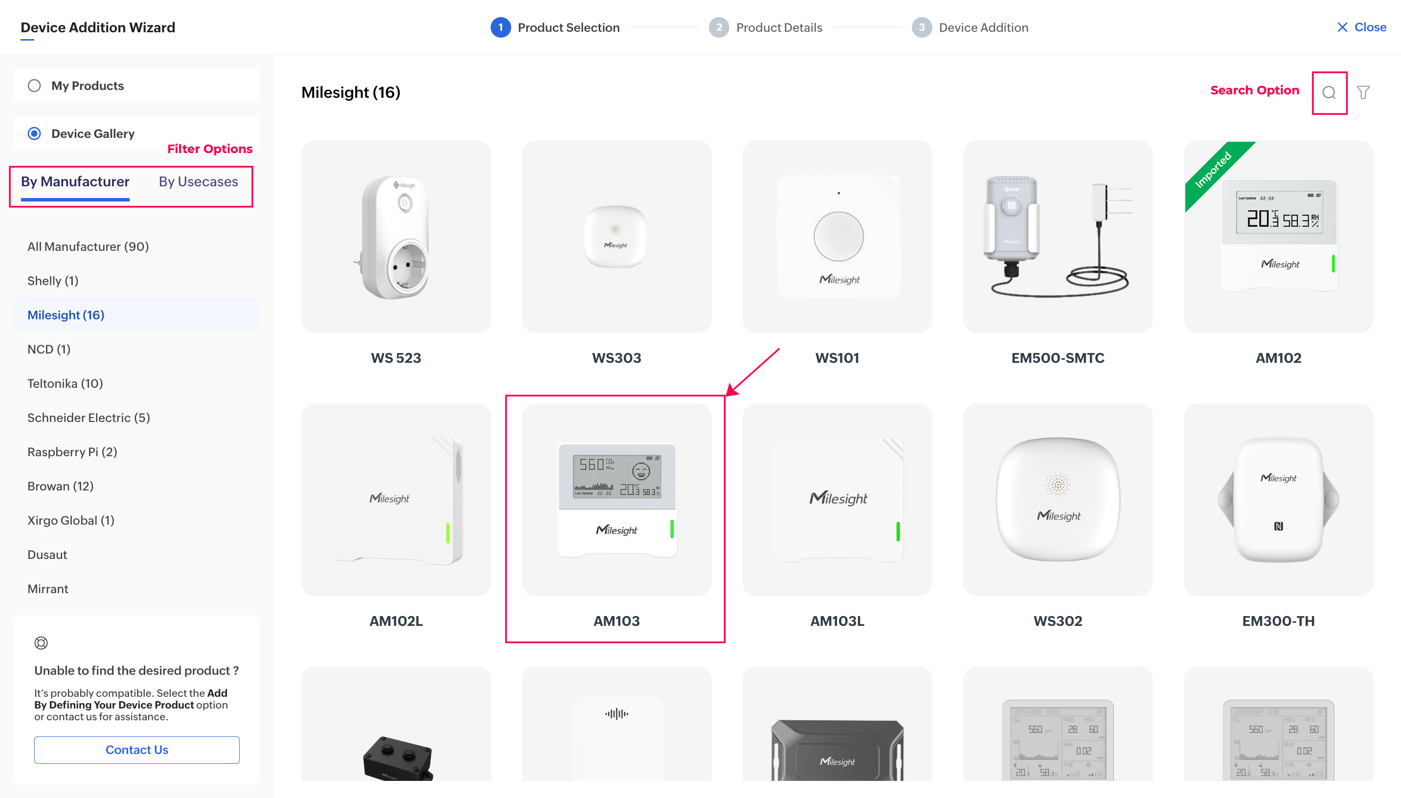 5. Click on the LoRa Device you want to add. Use the By Manufacture filter or search for the required device if required.