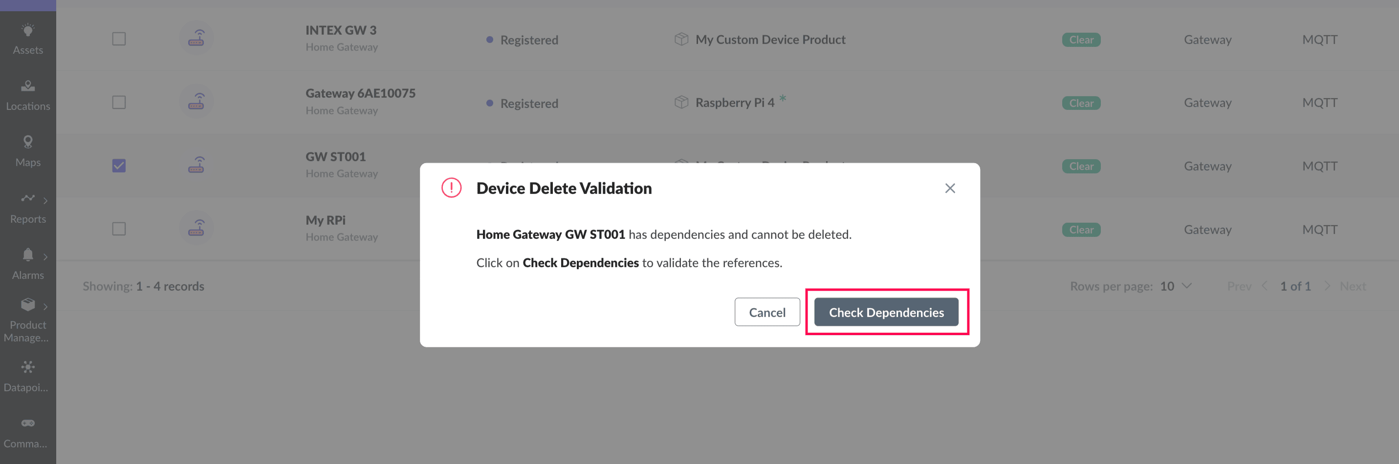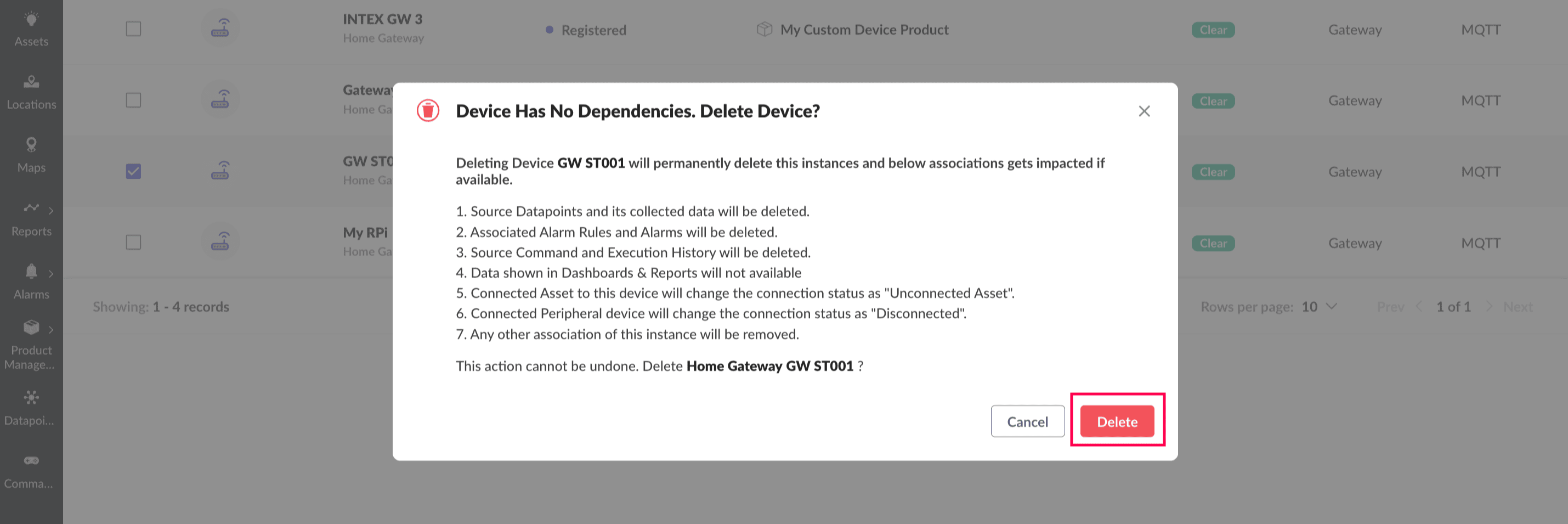 Device Dependencies: When a device is related to other instances, such as assets or devices, through a lookup field, it becomes a dependency for those instances. To delete this device instance, you must first resolve these dependencies by removing the device from the associated instances. Only after these dependencies are addressed can the device instance be removed.