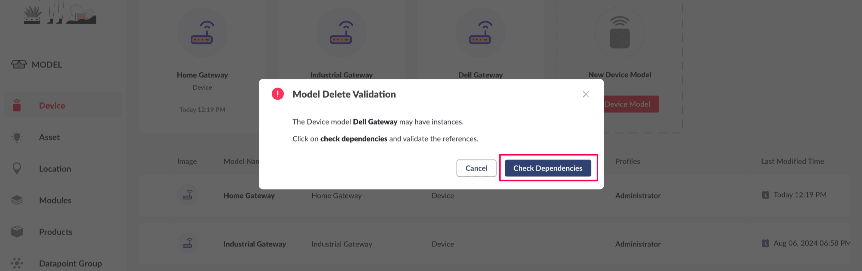 6. Click Check Dependencies in the Model Delete Validation popup.