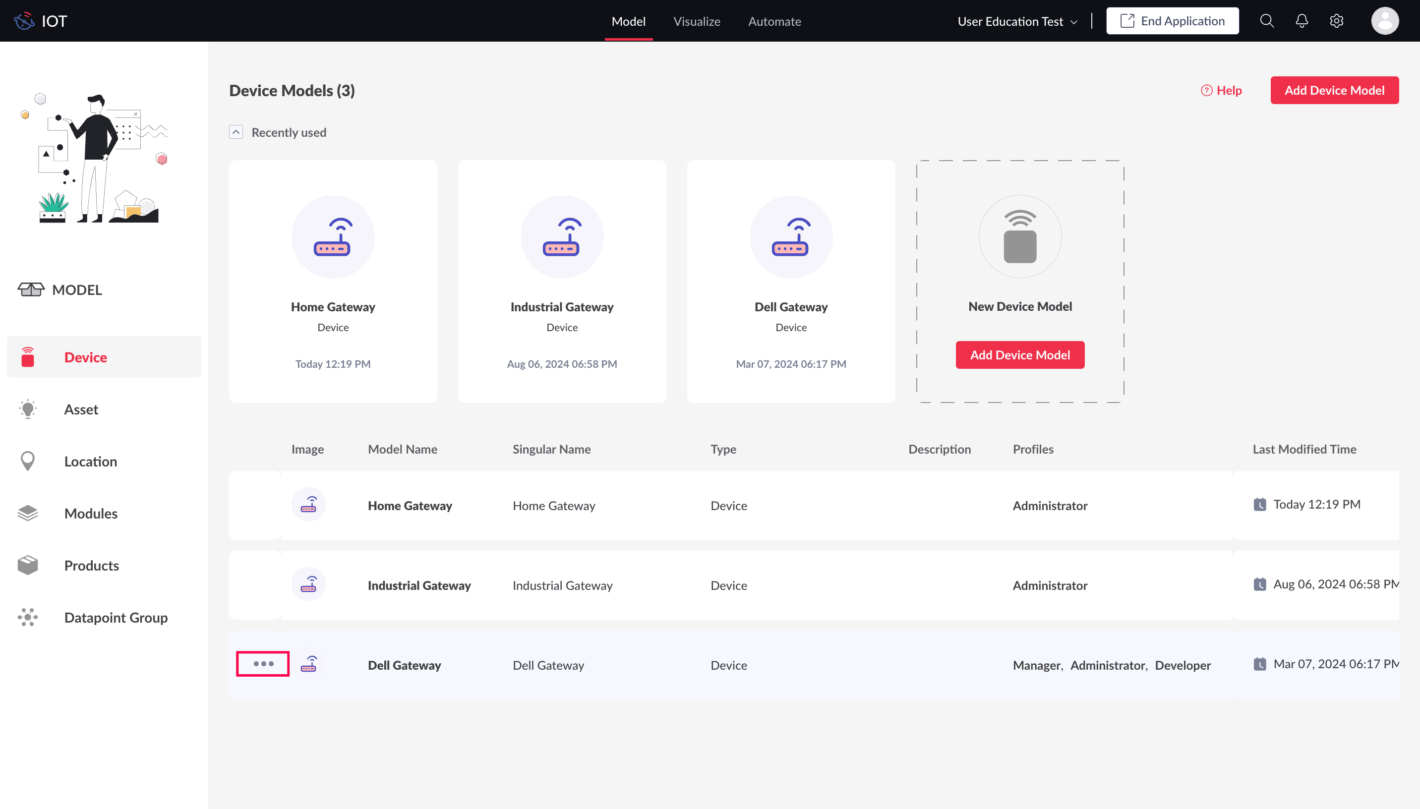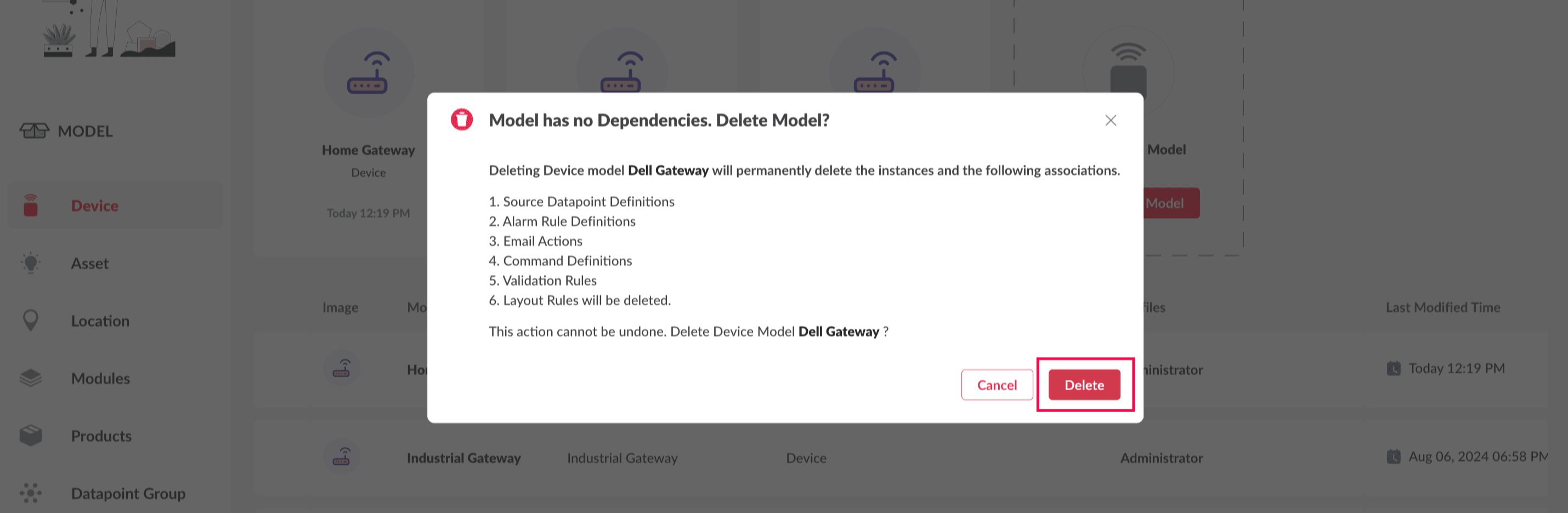 Device Model Dependencies: When a device is created based on a specific device model within the application, that device model becomes a dependency for the device instance. Consequently, the device model cannot be removed while any device instances based on it still exist. Users must delete all device instances associated with the device model before they can delete the device model itself.