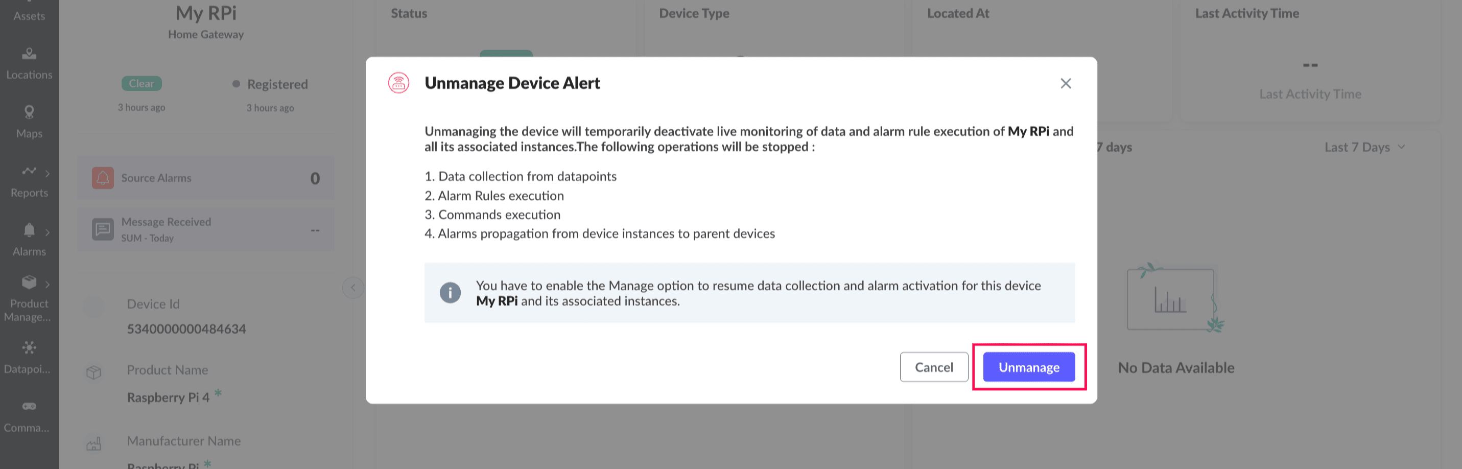 A device can be deactivated by unmanaging it, which terminates the connection, stops data collection, and disables alarm rules.Conversely, managing the device will reactivate these functions.