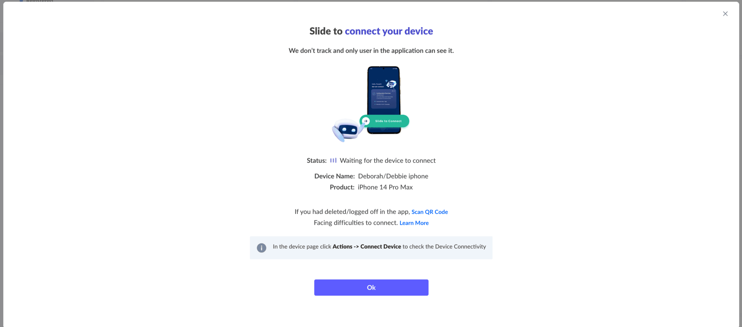 Solution: Refresh the web app and check again if the device is created. If not created, reset the mobile app and try scanning through QR code from web app again to create the device. If the issue persists, please contact support.