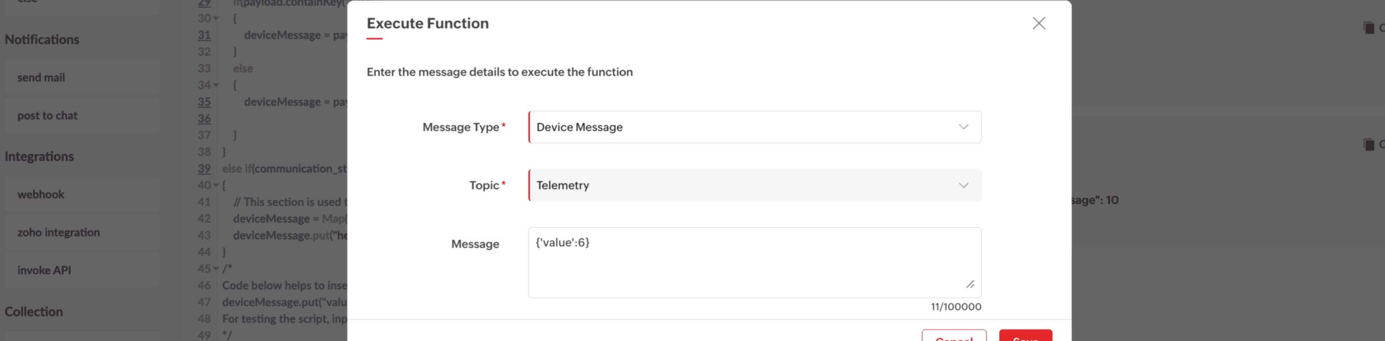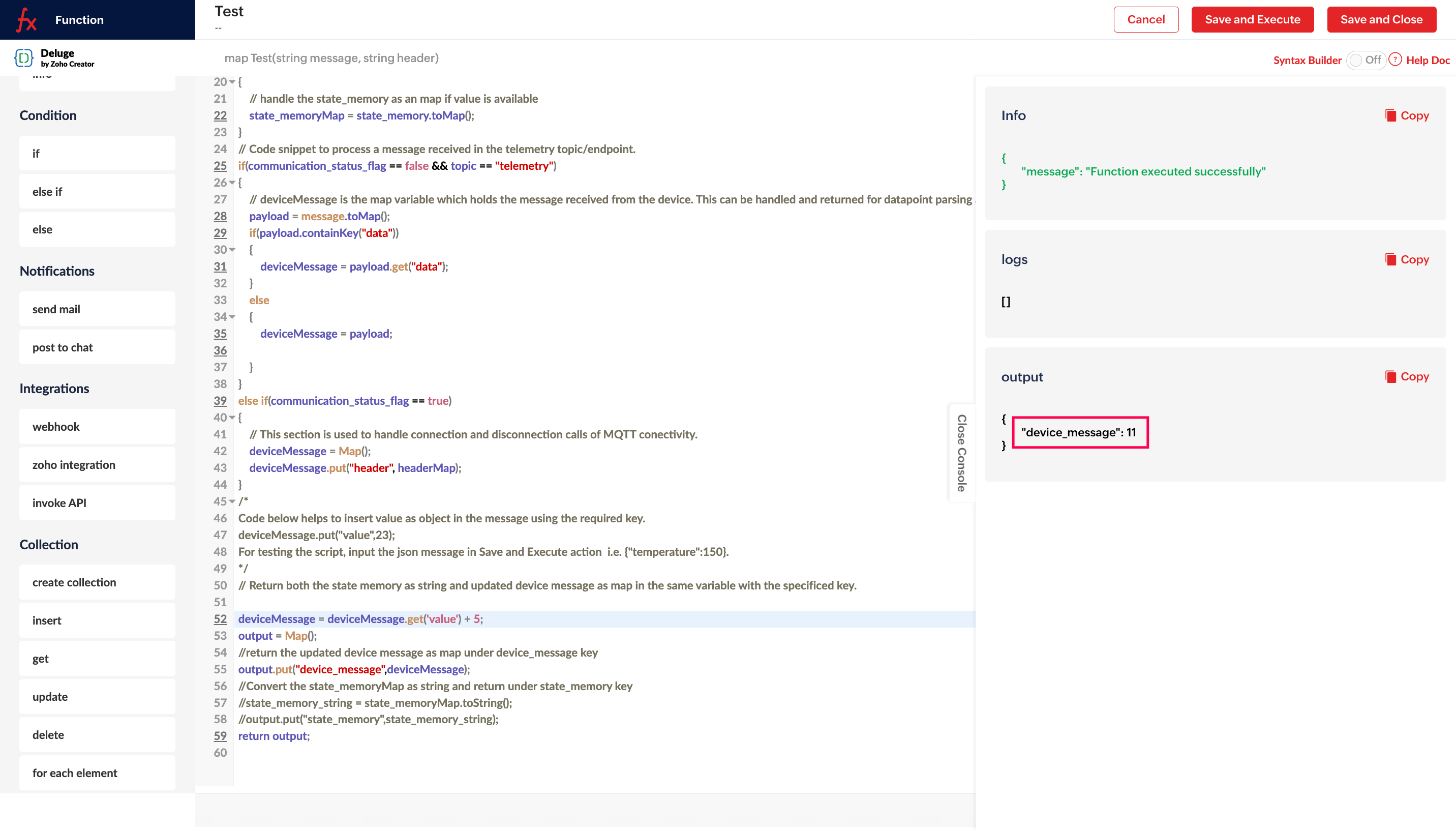 To test this operation, provide the input {'value': 6} in the Messages field when executing the custom function. This will adjust the value in deviceMessage to 11, and will be sent as the output of the message handler function.