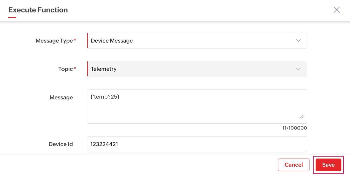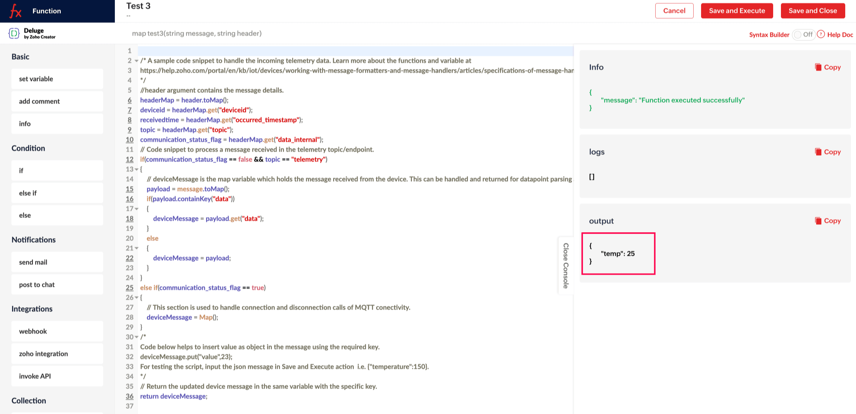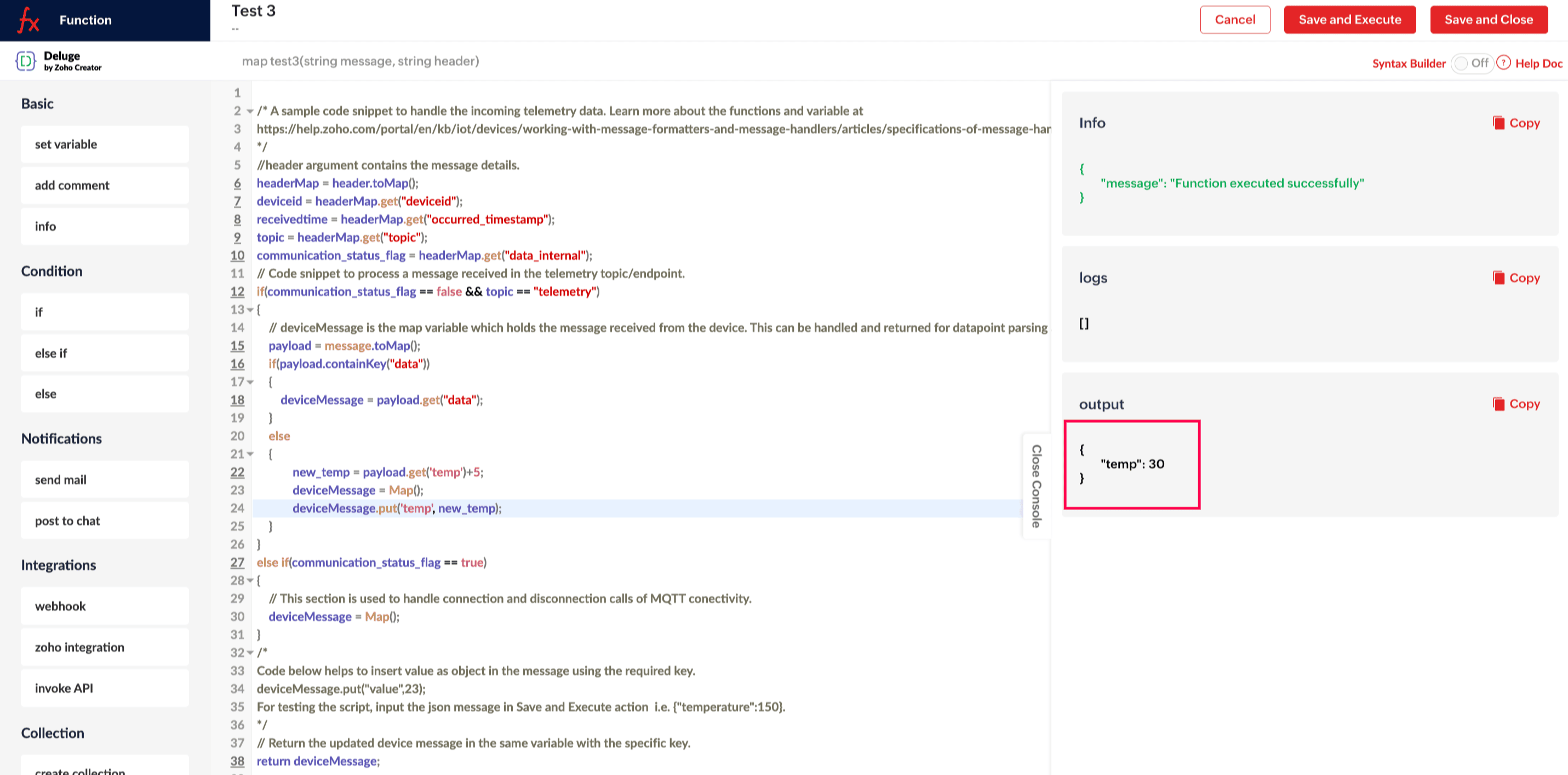 The function will now be executed and the value {'temp':30} will be displayed as the output.