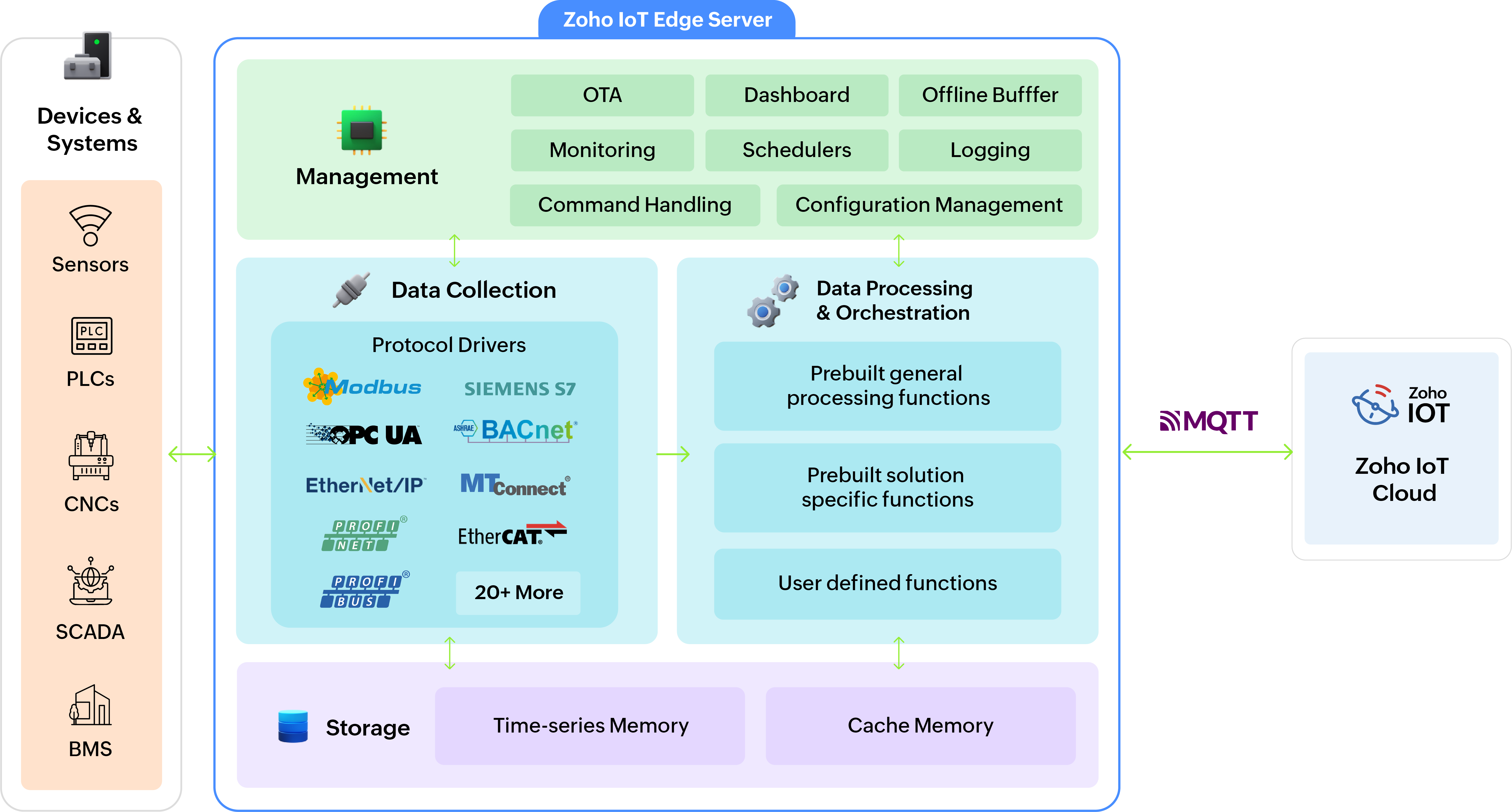The Zoho IoT Edge Server is designed to play a vital role in IoT solutions from medium to large enterprises as it enables seamless data collection from sensors, PLCs, field equipment, and systems. This provides reliable data flow from edge to cloud forming the basis of scalable various IoT solutions such as IIoT, Smart Buildings, etc.