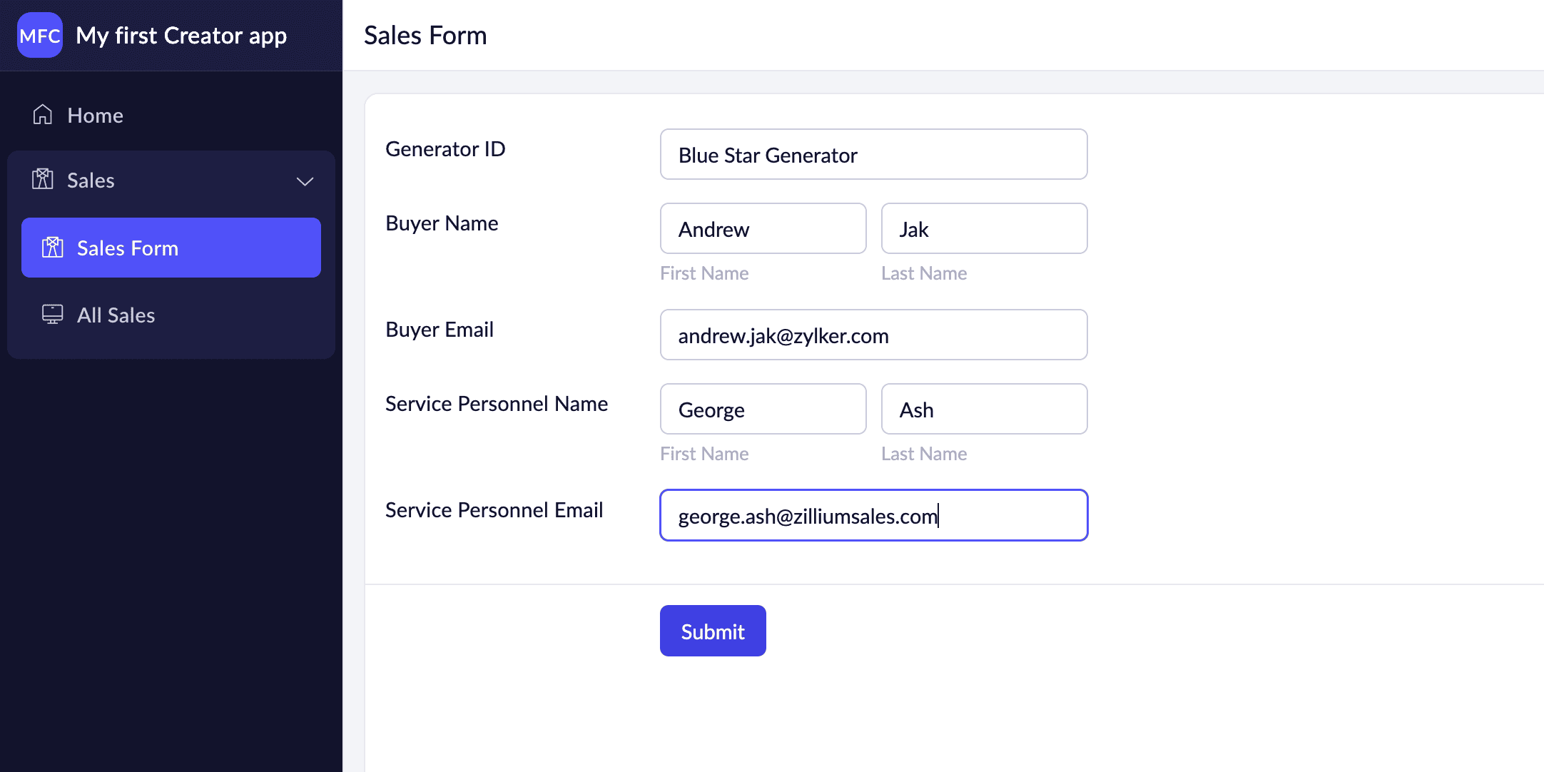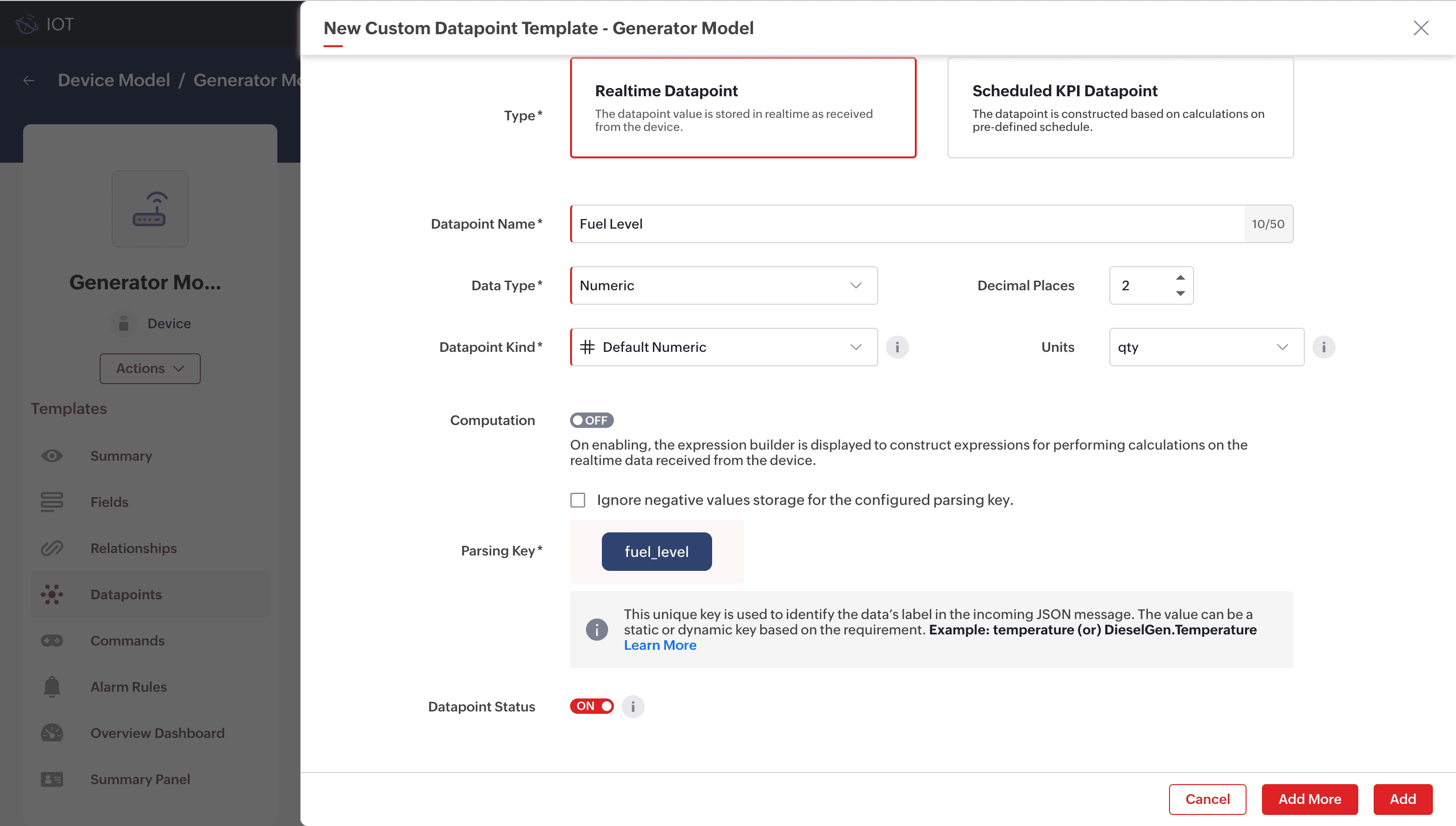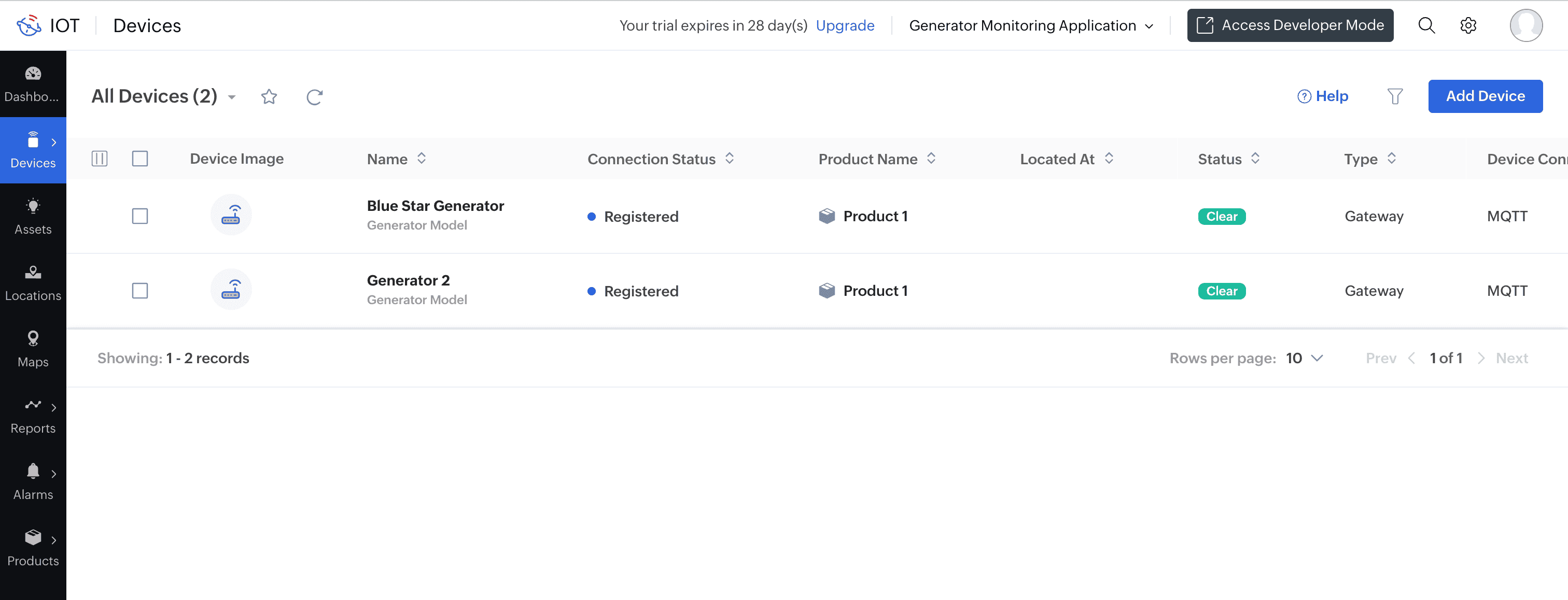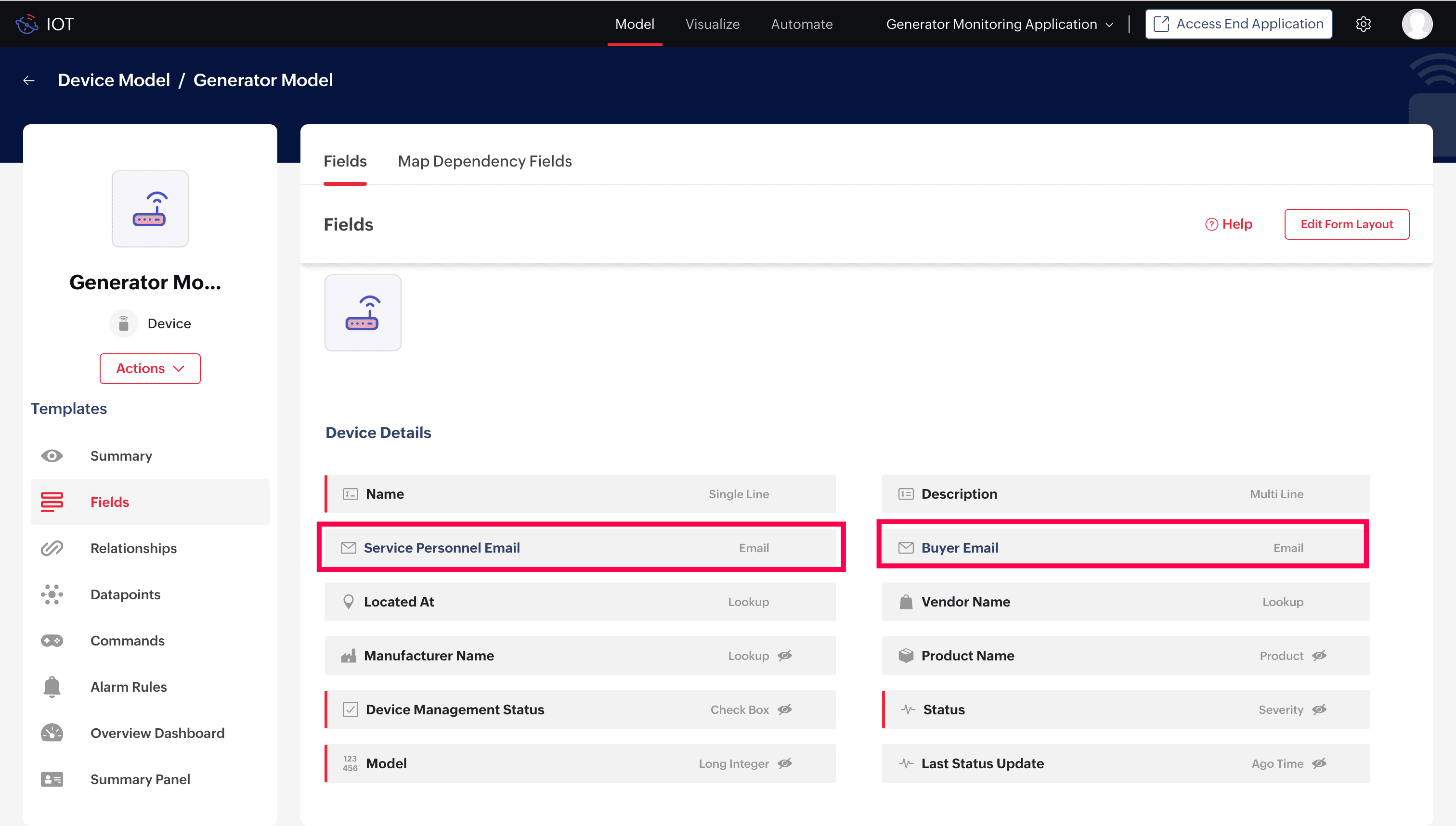 Note: You can also create Endpoint devices in Zoho IoT to receive data from third-party applications. When creating the end point device, you must provide the endpoint URL and authentication details.2. Create Custom Fields to store the buyer and service personnel email ID.Image: Custom Field creation for storing email IDs.On completing the above device creation procedure, the received Diesel Generator data can be stored as a new device record for monitoring.Image: Device List View after adding the "Blue Star Generator".Note: The generator must have the intelligence to send real-time reading of fuel/ temperature/ voltage readings to the Zoho IoT Application for it to monitor the device.