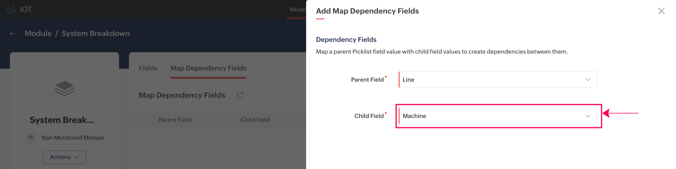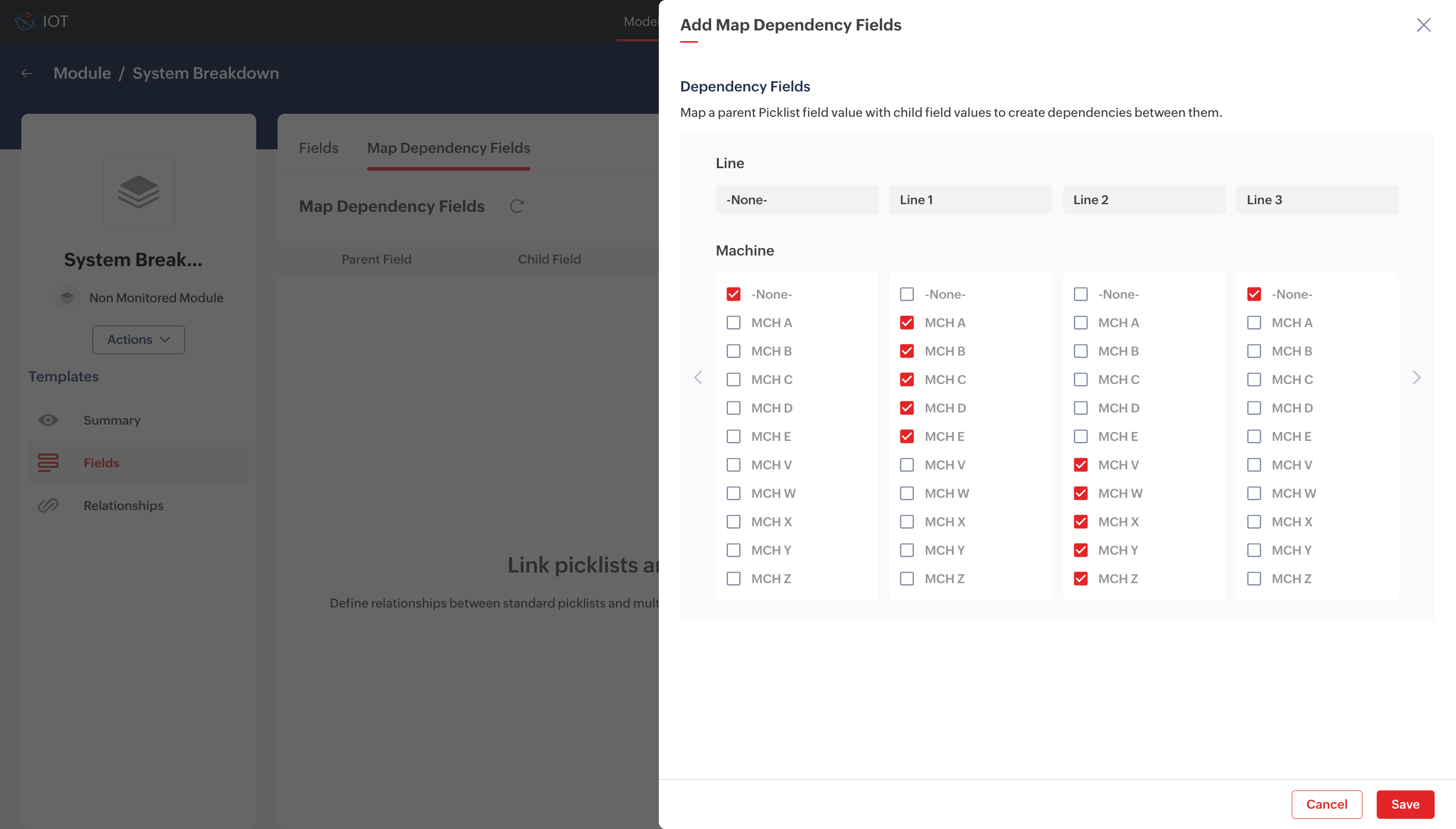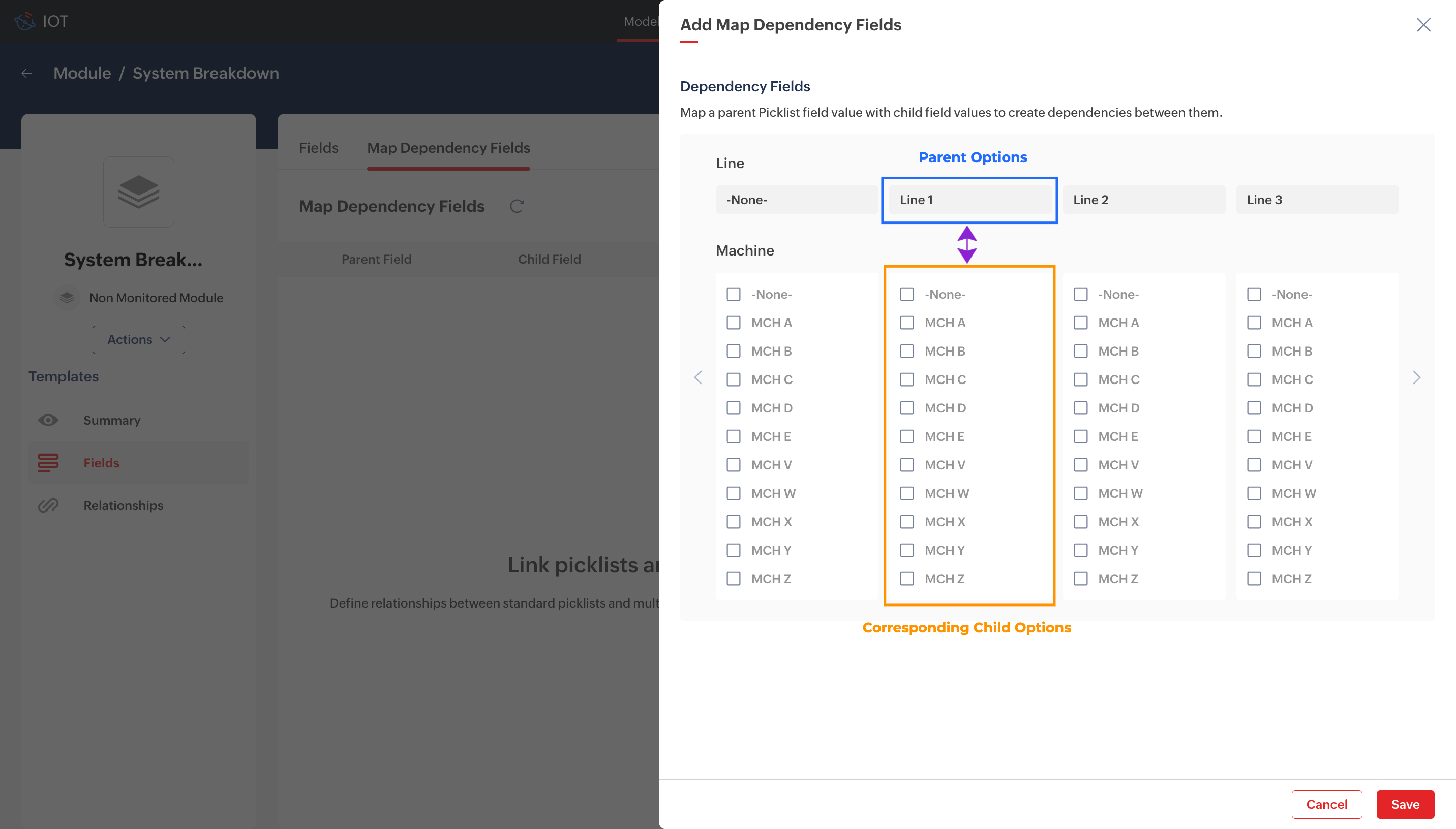 For example, consider two fields: Line and Machine, in a custom module called System Breakdown, where a user needs to report a broken machine. In a complex setup with many lines and machines, a mapped picklist helps avoid confusion. The Line field is mapped to the Machine field so that when a user selects a line, only the machines linked to that line are shown. For instance, selecting Line 1 shows Machines A, B, C, D, and E, while Line 2 shows Machines V, W,  X, Y, and Z.