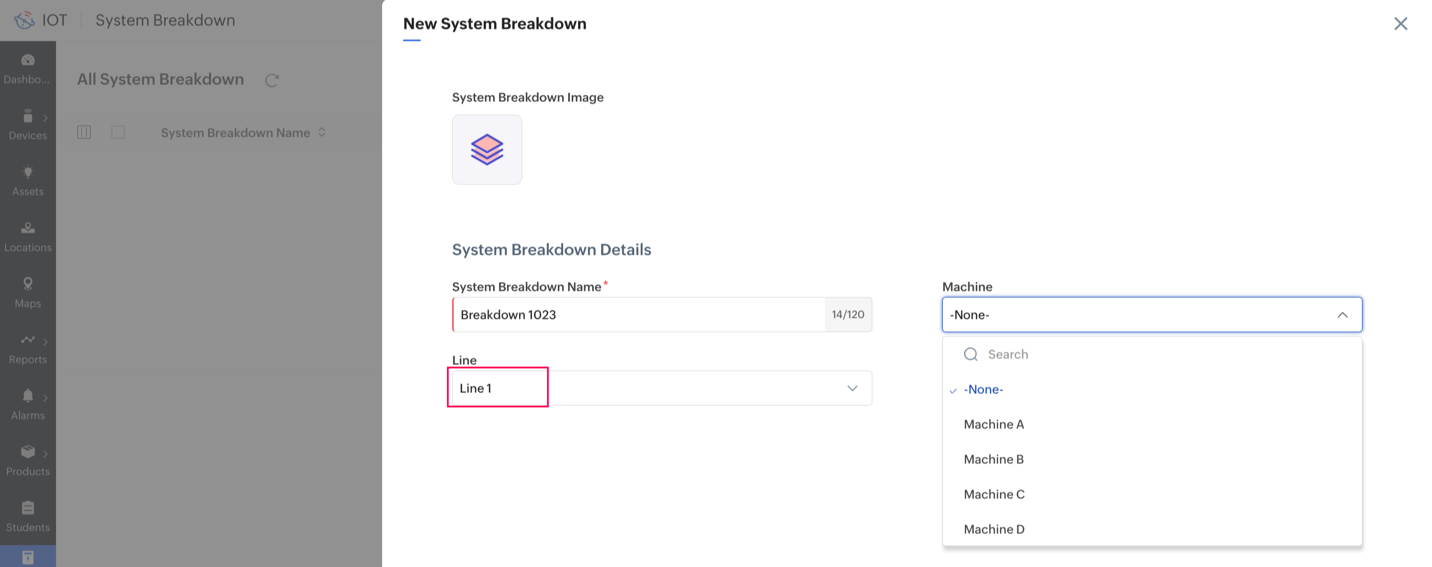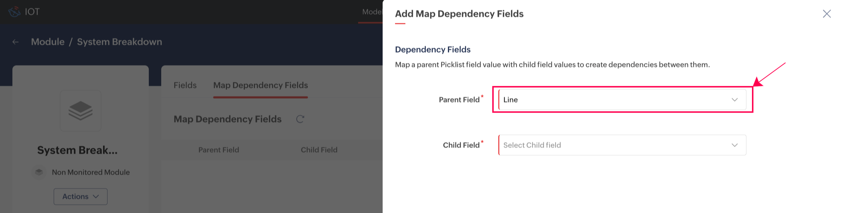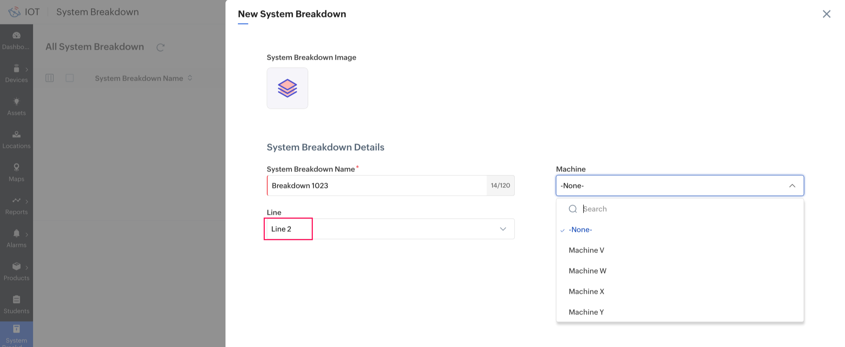 For example, consider two fields: Line and Machine, in a custom module called System Breakdown, where a user needs to report a broken machine. In a complex setup with many lines and machines, a mapped picklist helps avoid confusion. The Line field is mapped to the Machine field so that when a user selects a line, only the machines linked to that line are shown. For instance, selecting Line 1 shows Machines A, B, C, D, and E, while Line 2 shows Machines V, W,  X, Y, and Z.