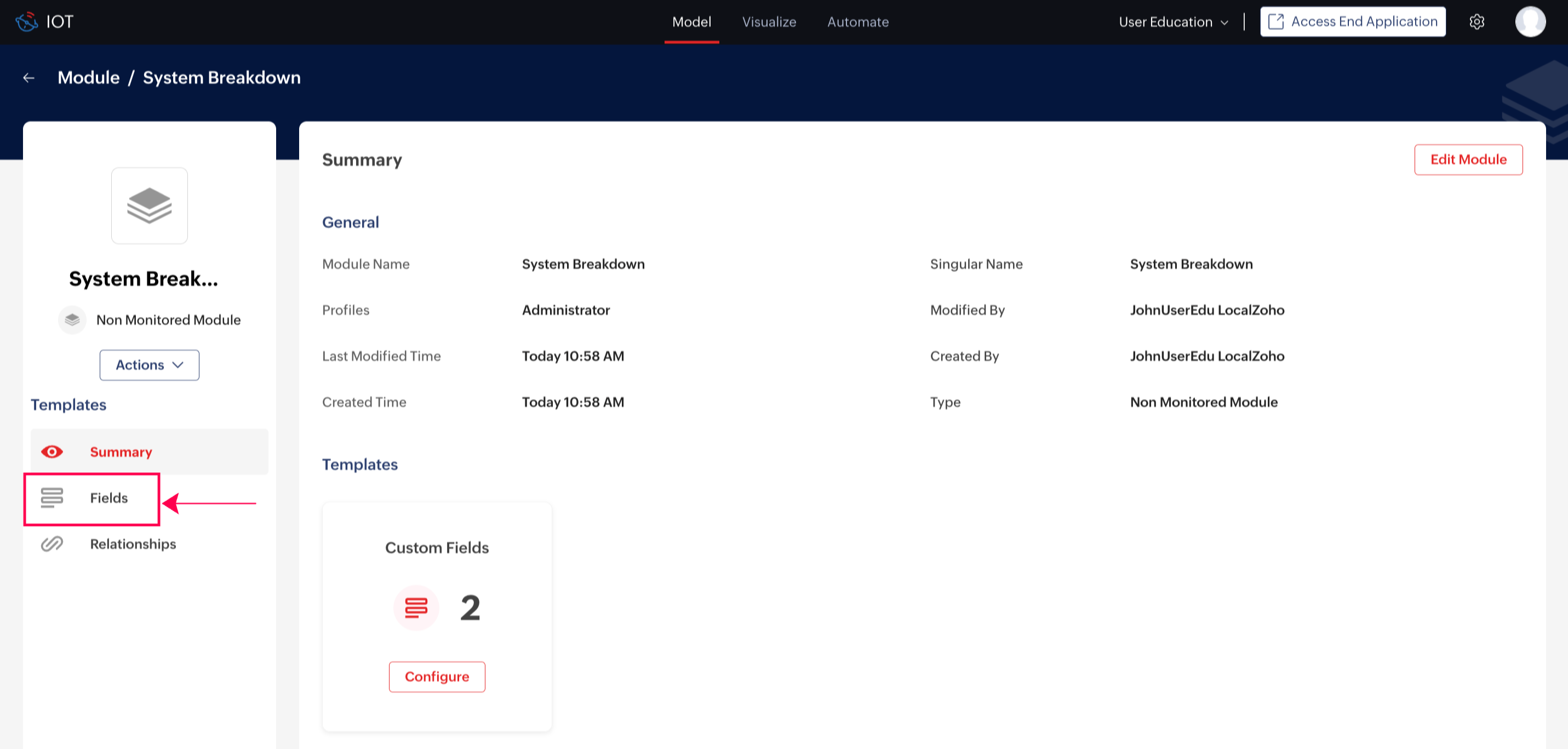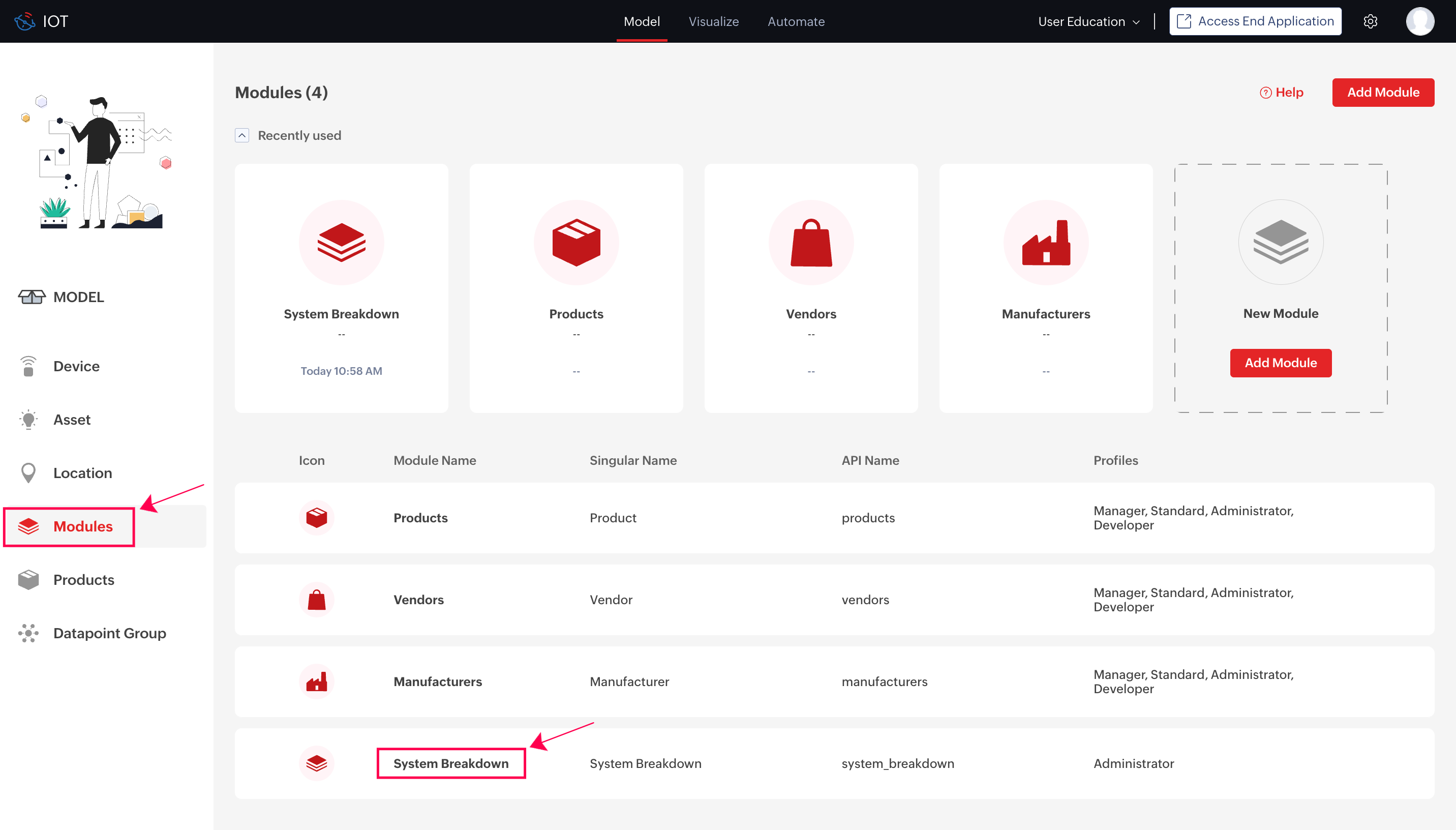 2. Open the information page of the required device model, asset model, location model, or custom module.