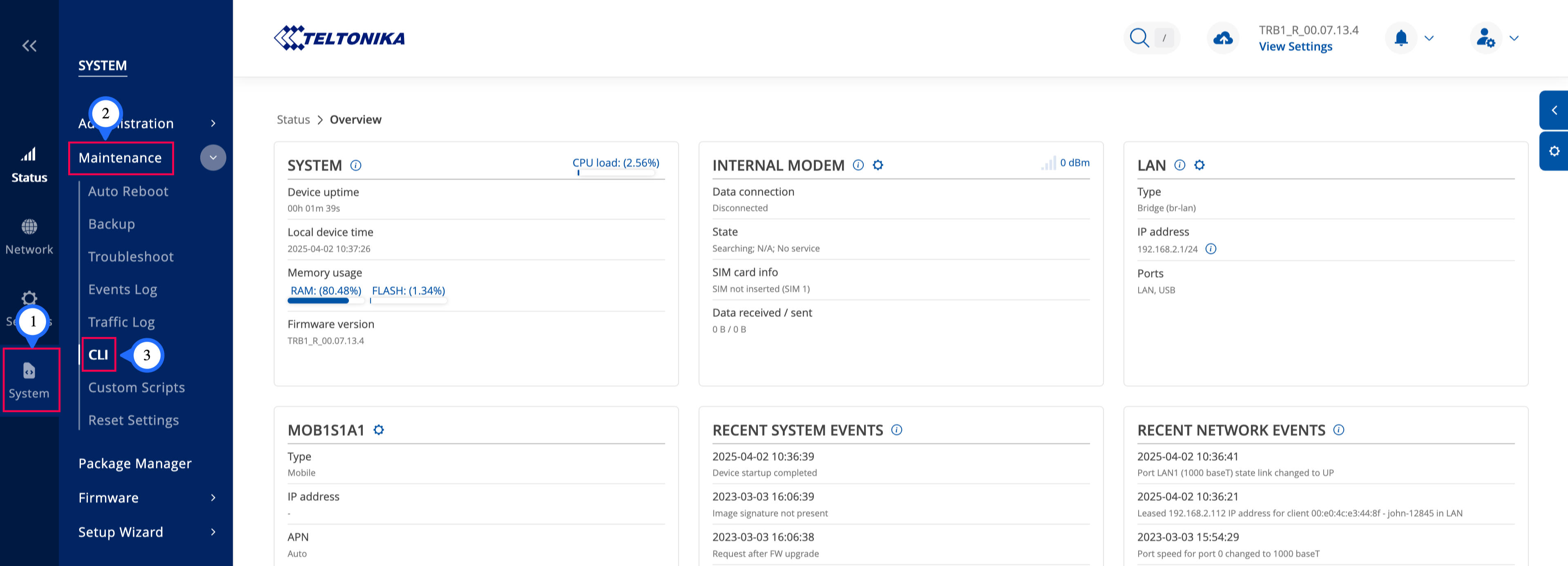 Zoho IoT provides an agent for the TRB245 device. Installing this agent enables seamless connection between your device and the Zoho IoT platform, allowing you to configure and manage your TRB245 remotely. Prerequisites Make sure you have the ...