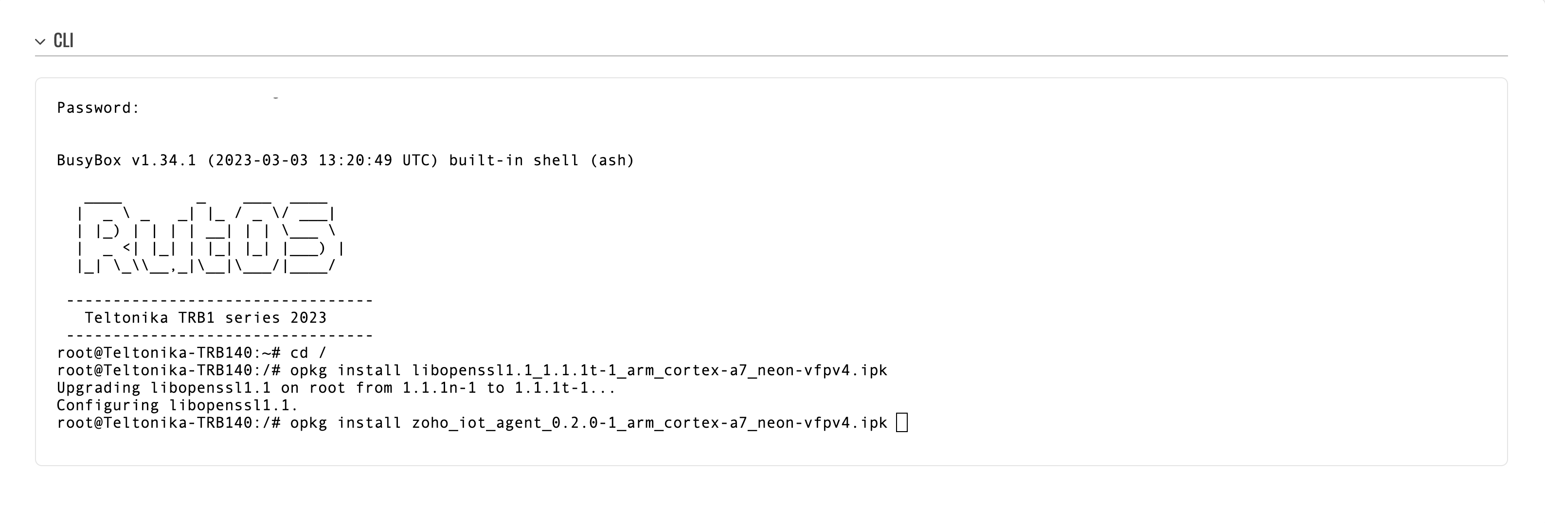 Zoho IoT provides an agent for the TRB140 device. Installing this agent enables seamless connection between your device and the Zoho IoT platform, allowing you to configure and manage your TRB140 remotely.