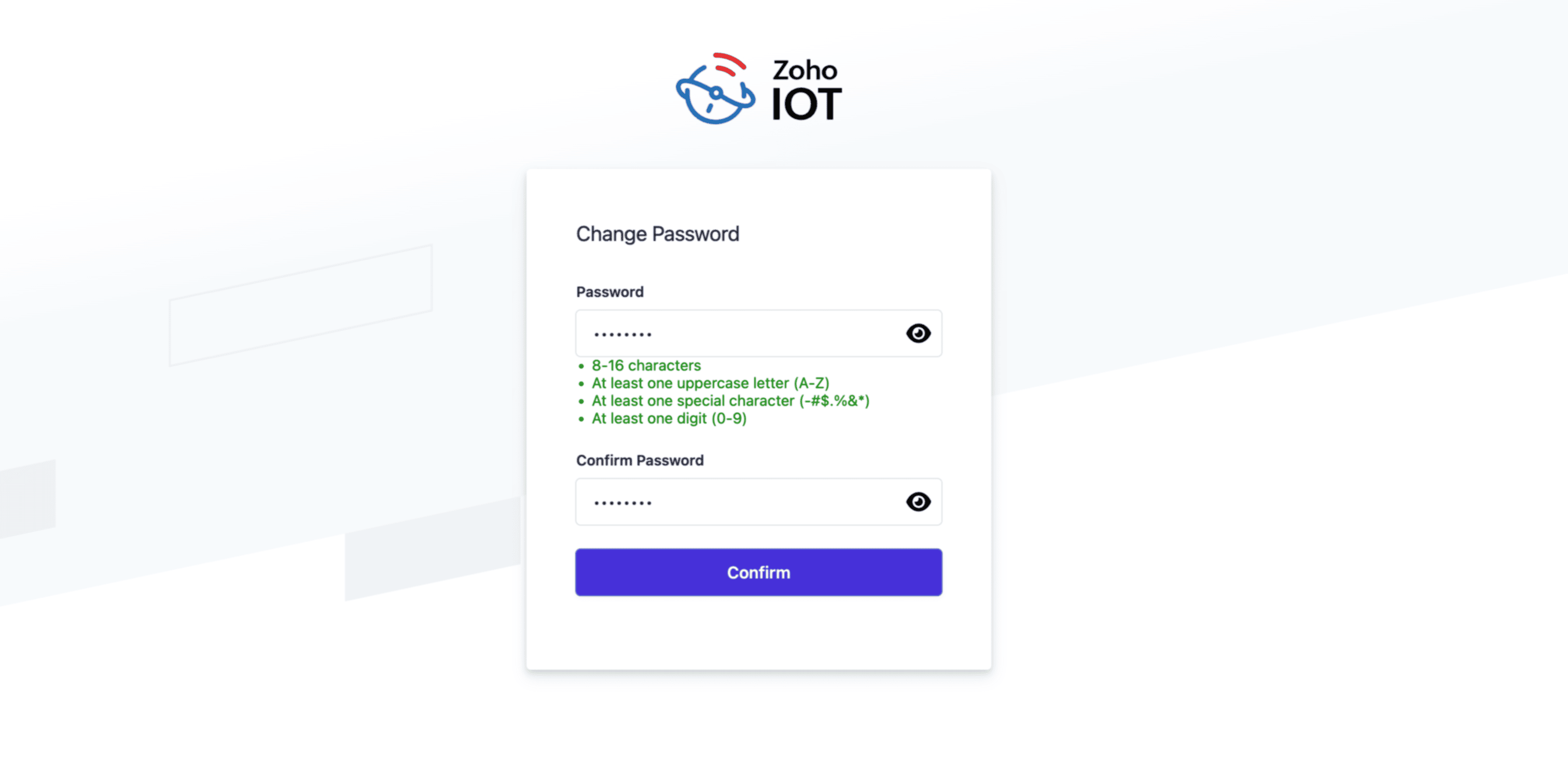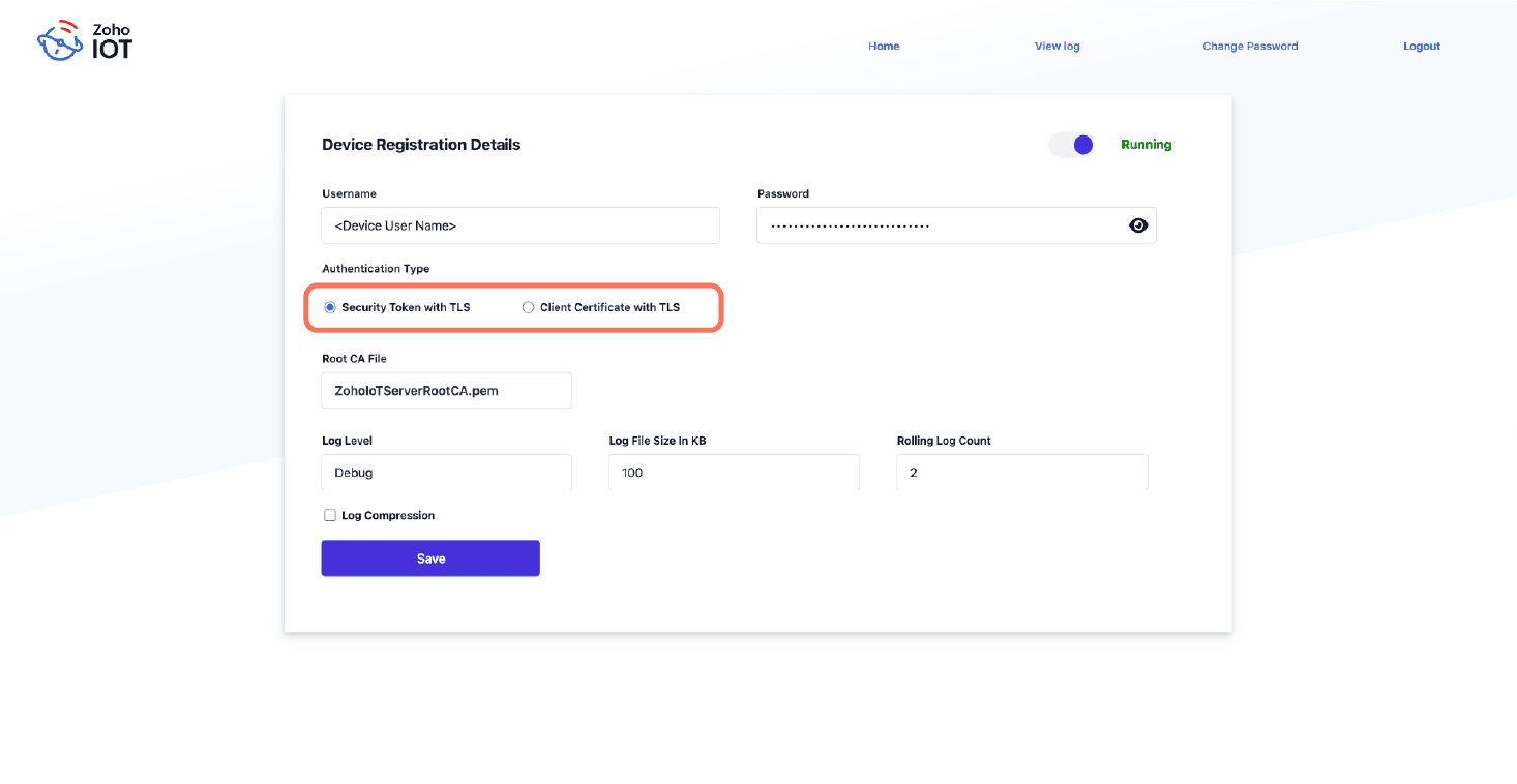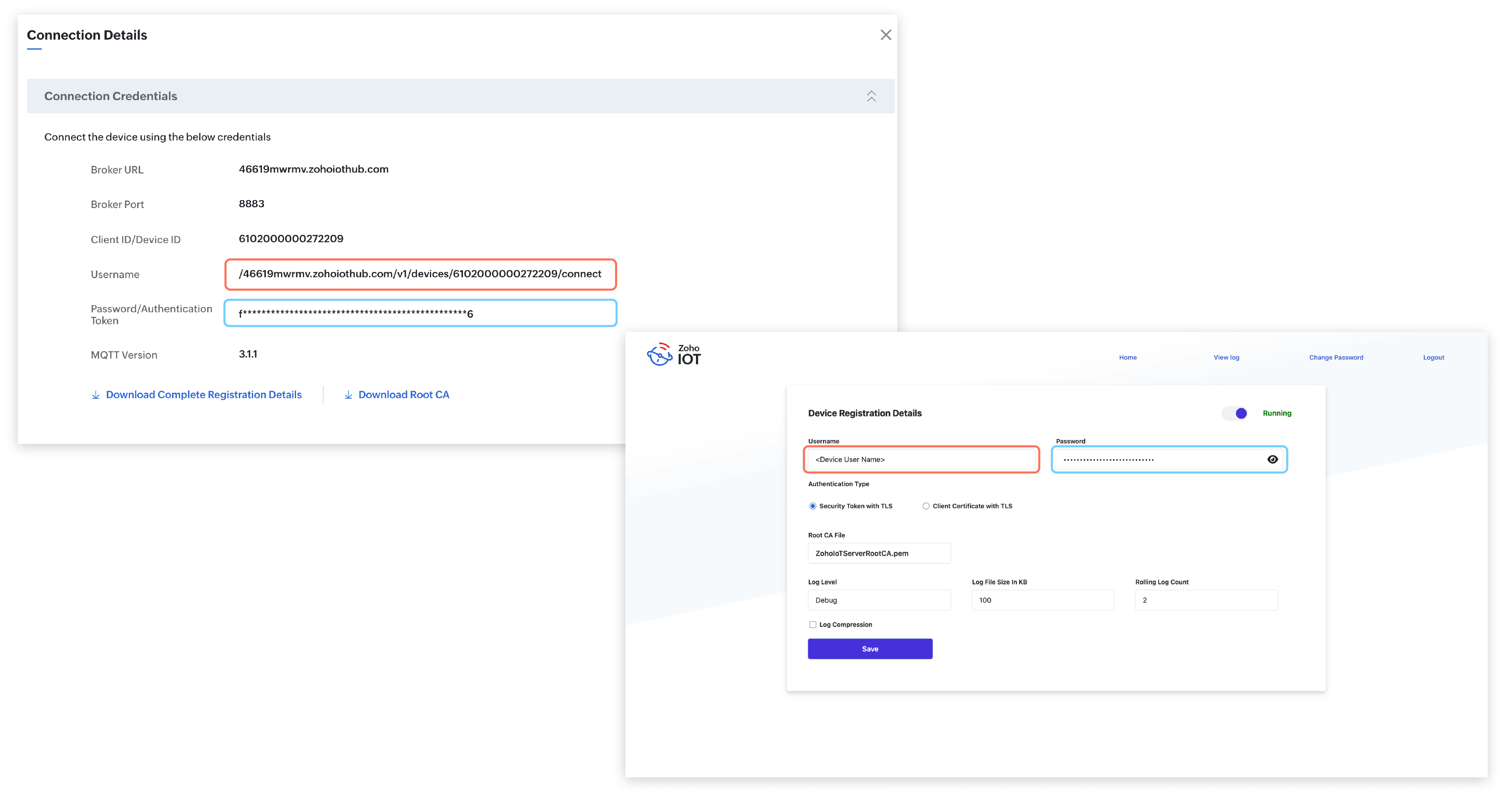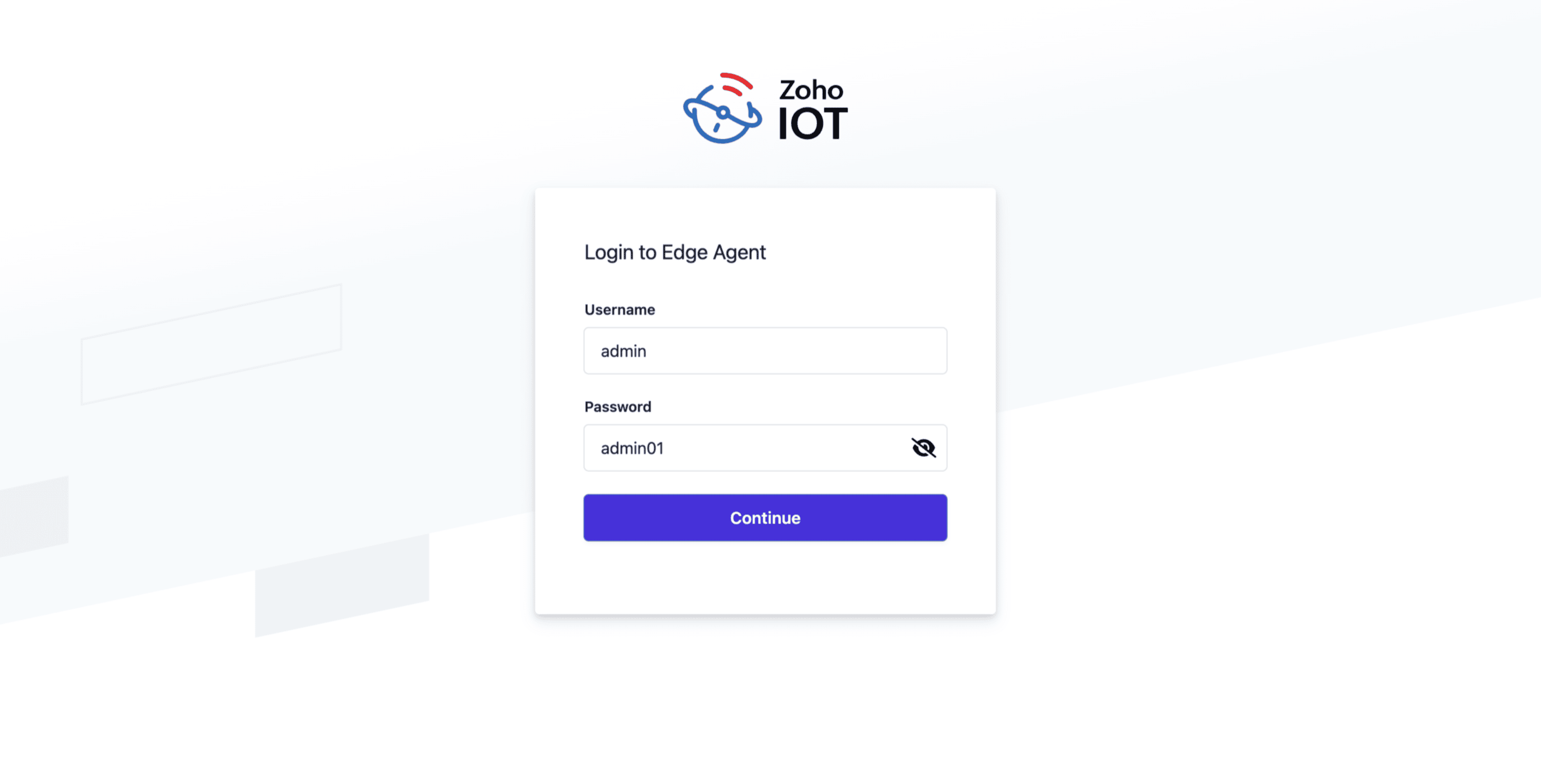 5. Enter the Zoho IoT Device credentials (username and password of the device you've added on the Zoho IoT application).