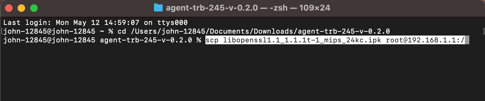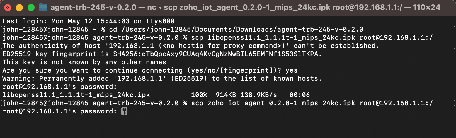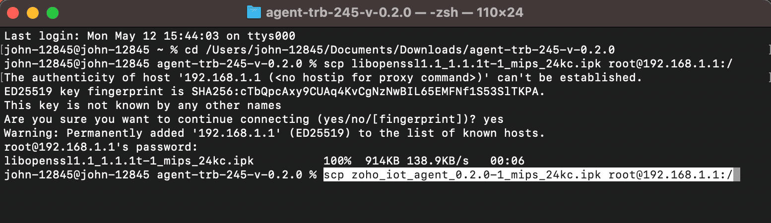 scp zoho_iot_agent_0.2.0-1_mips_24kc.ipk root@192.168.1.1:/tmp