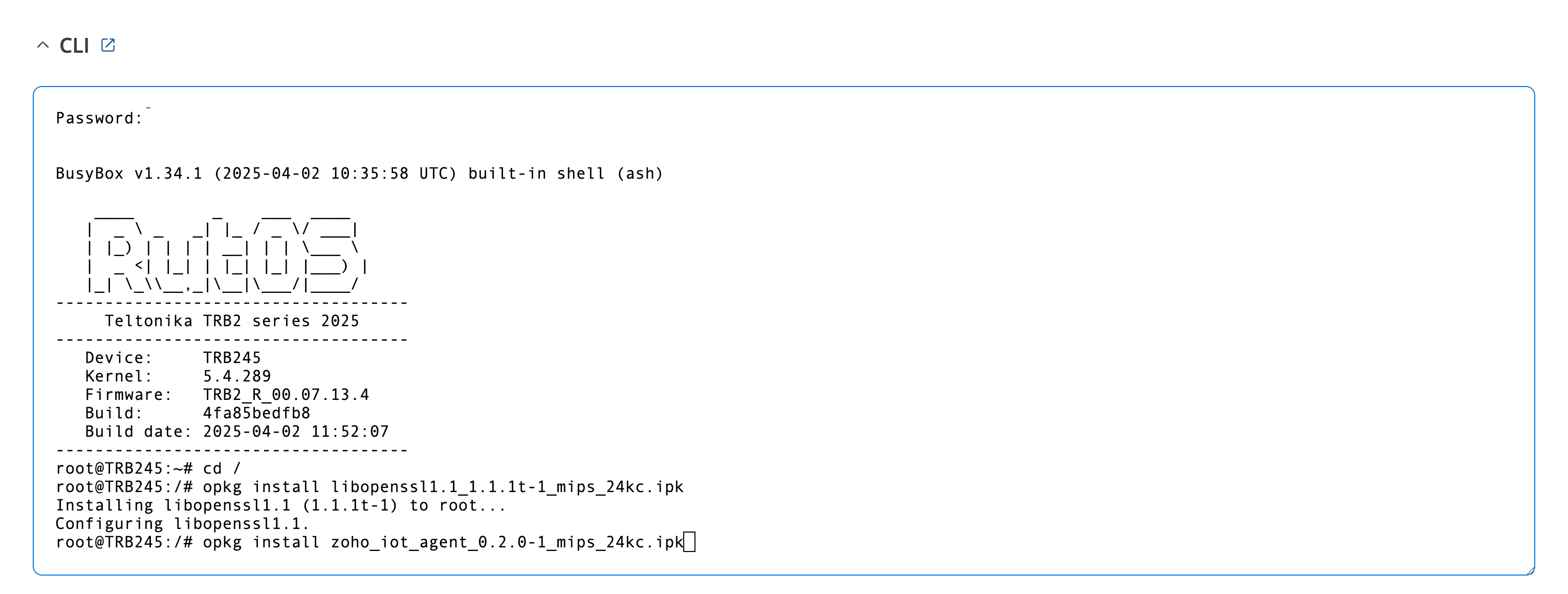 Zoho IoT provides an agent for the TRB245 device. Installing this agent enables seamless connection between your device and the Zoho IoT platform, allowing you to configure and manage your TRB245 remotely.