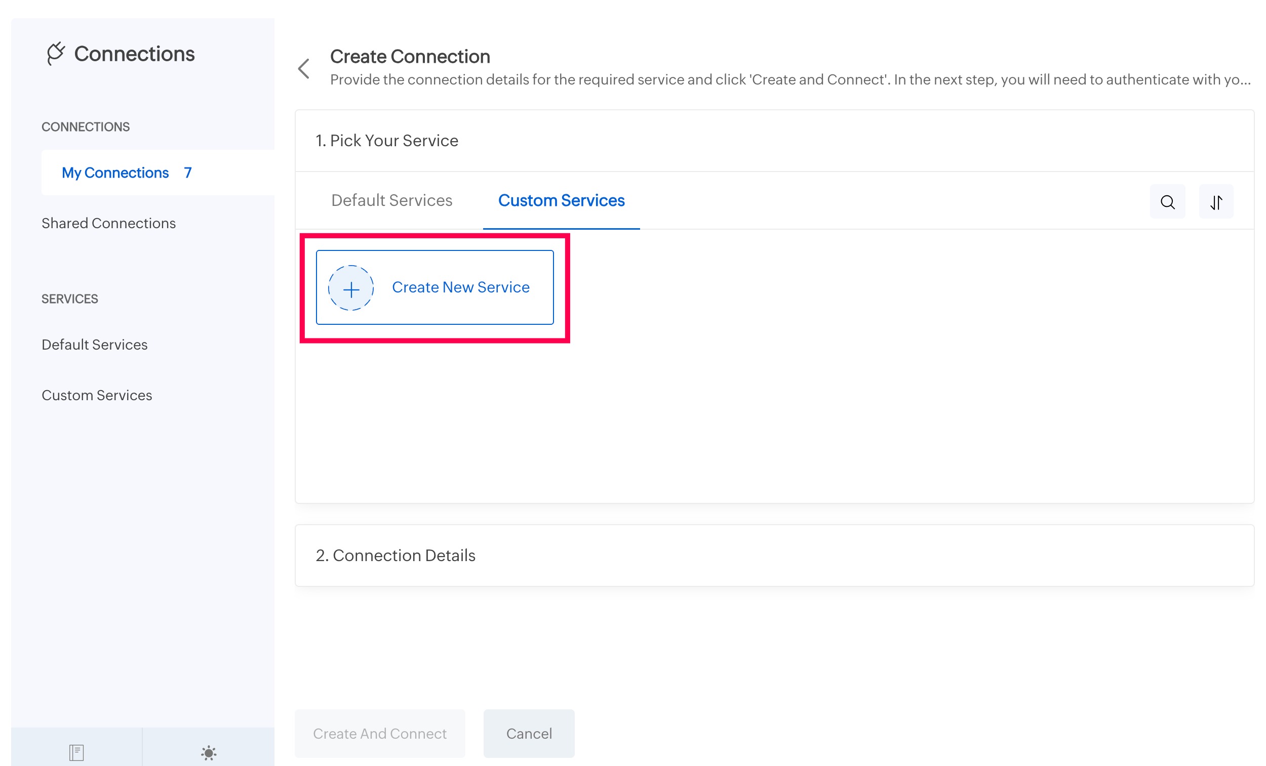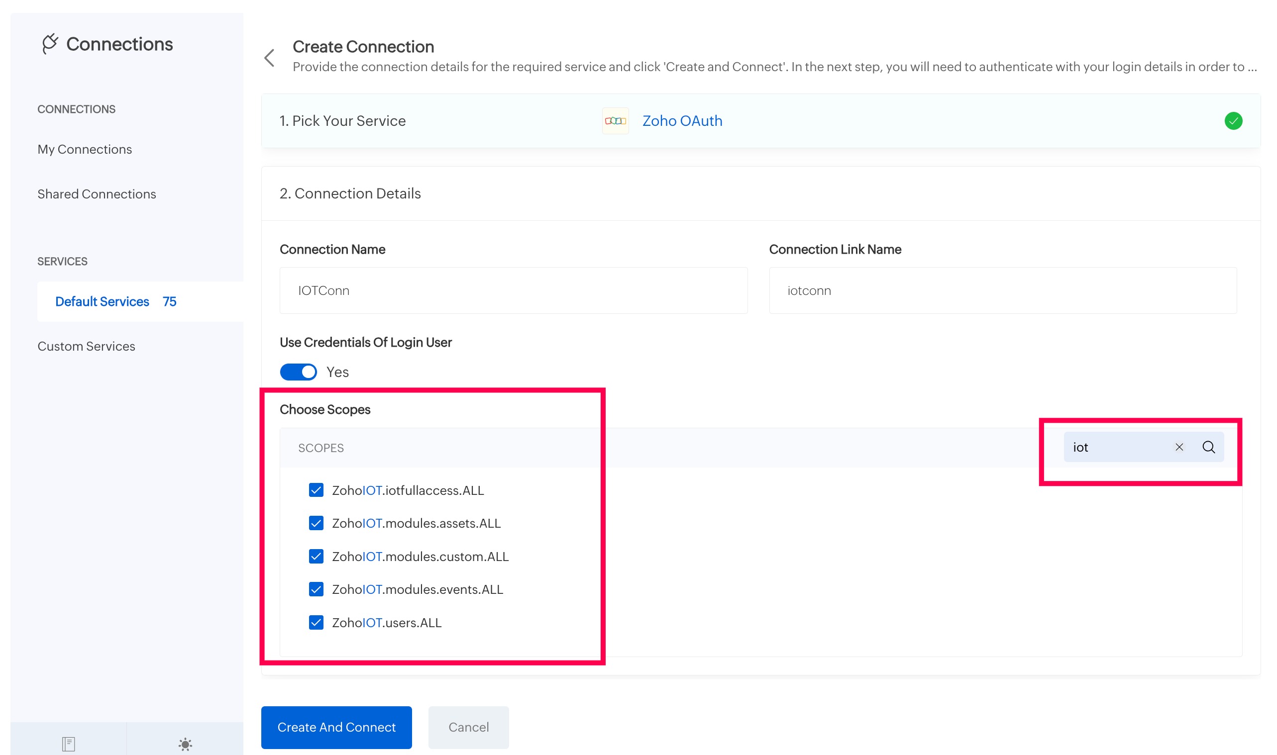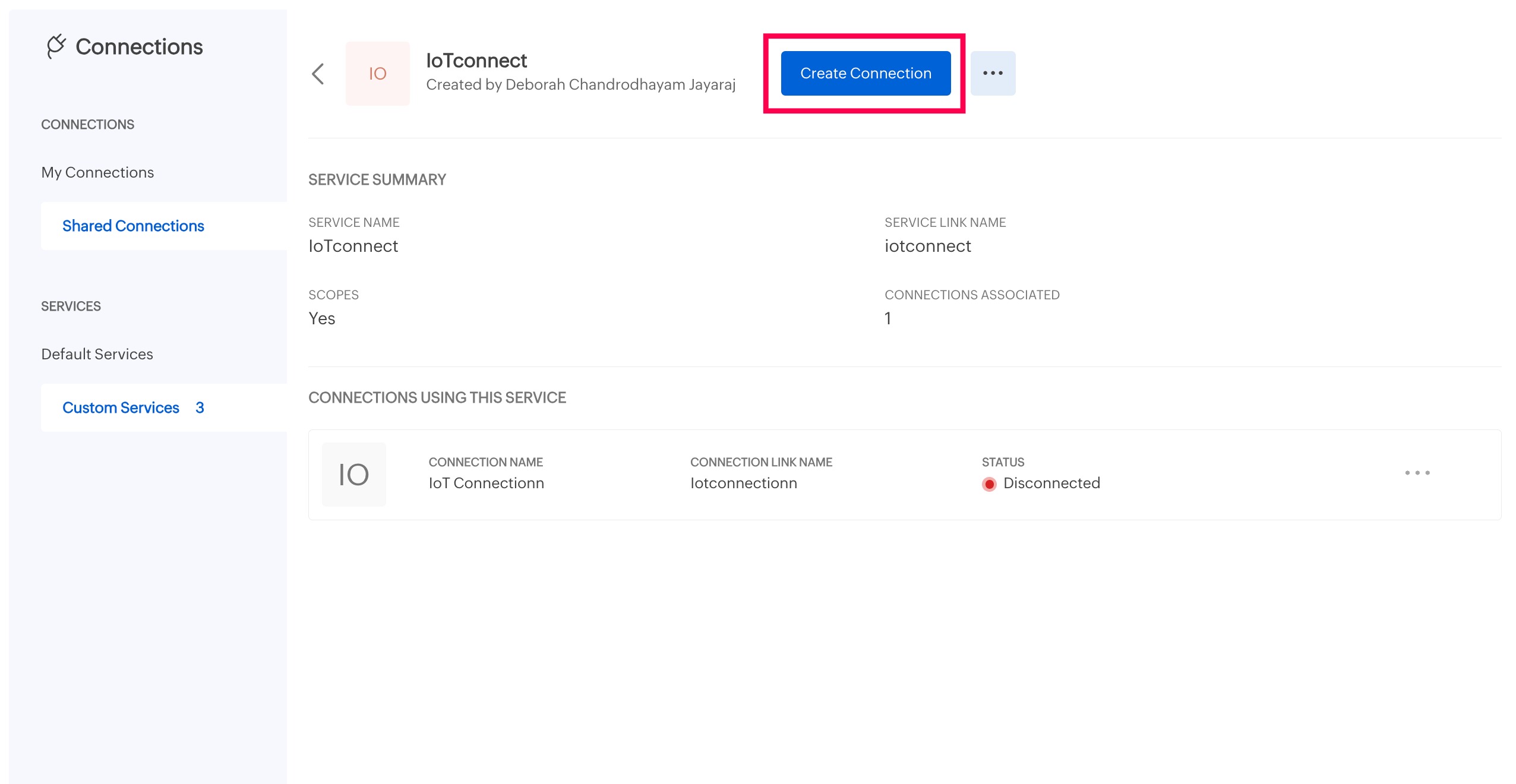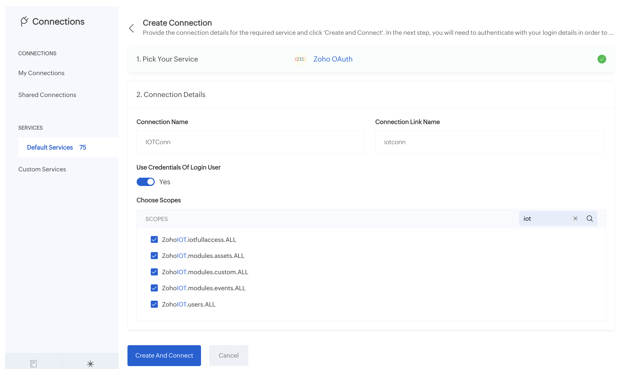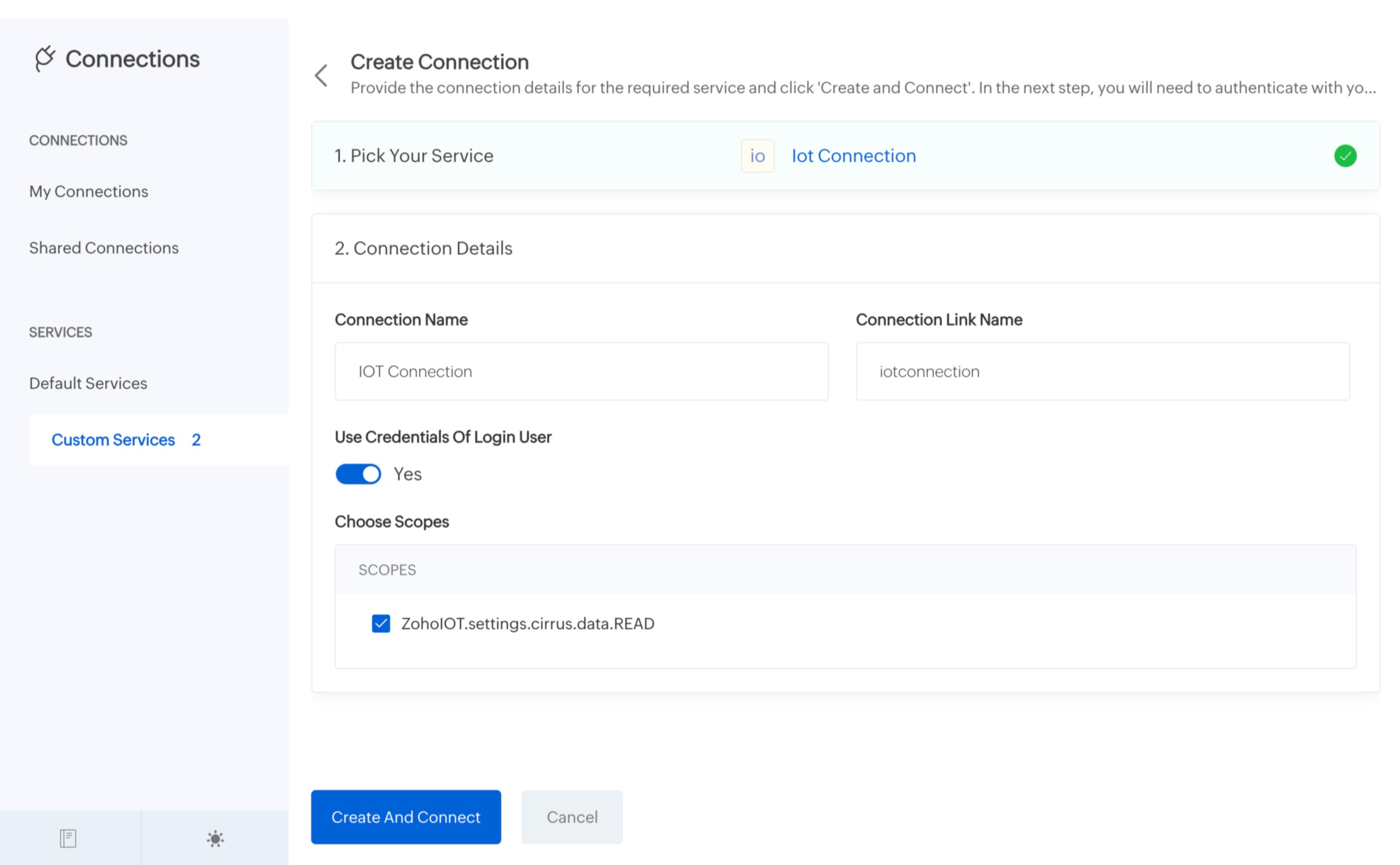 IMPORTANT: We are currently working on including Zoho IoT as a default service. Once available, you can directly choose Zoho IoT service. All Zoho IoT scopes will be available for selection in this service.5. Click Create Connection.6. Enter the connection name. The connection link name will be auto filled and displayed.