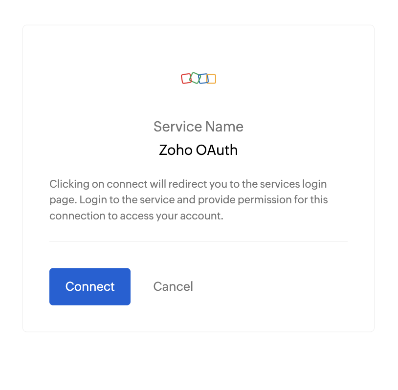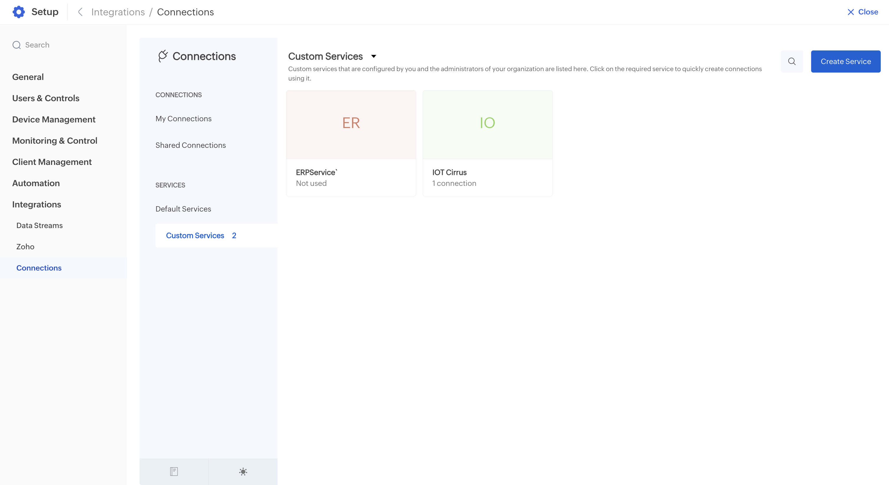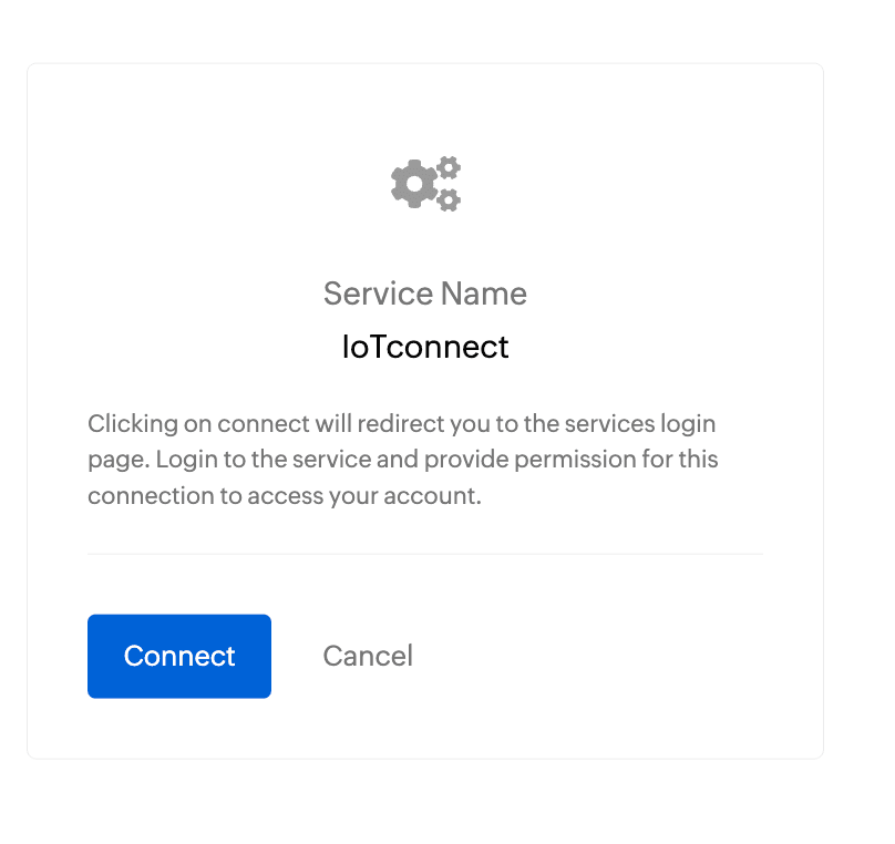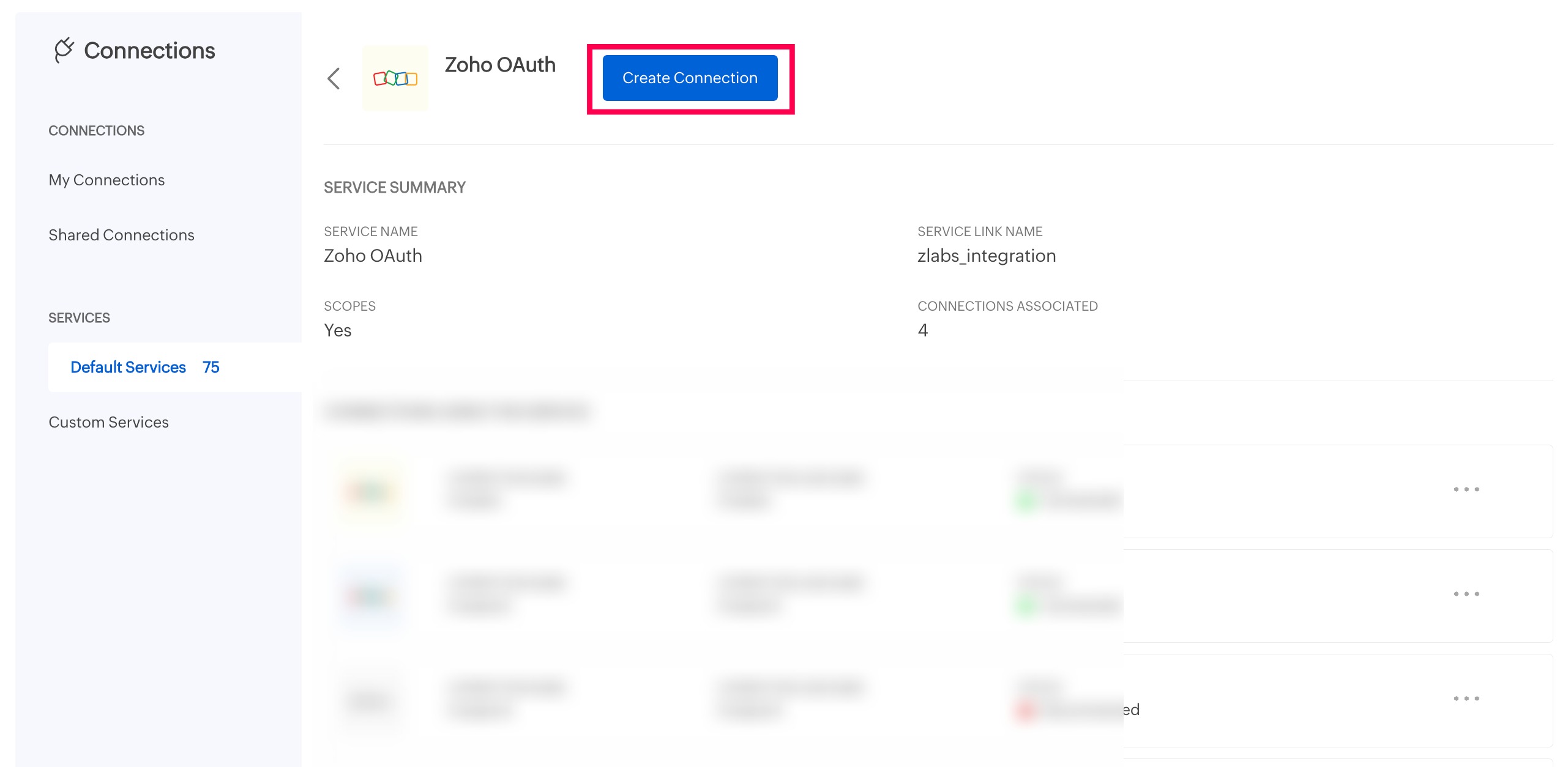 To know more about the fields including mandatory fields to be provided in this screen, refer to the Creating Custom Services document for the possible values.Note: The Oauth details such as Client ID and Client Secret can be obtained by registering the client.Note: The scope ZohoIOT.settings.cirrus.data.READ is provided in the above example as the connection is created to fetch data from the Zoho IoT application. You can configure any scope you require in the Scope and Scope Display Name textboxes.9. Click Create Service. Once the service is created, you can use the same to create the connection. The authentication details provided in this service will be used for the connections created using this service.10. Click Create Connection in the resultant screen.