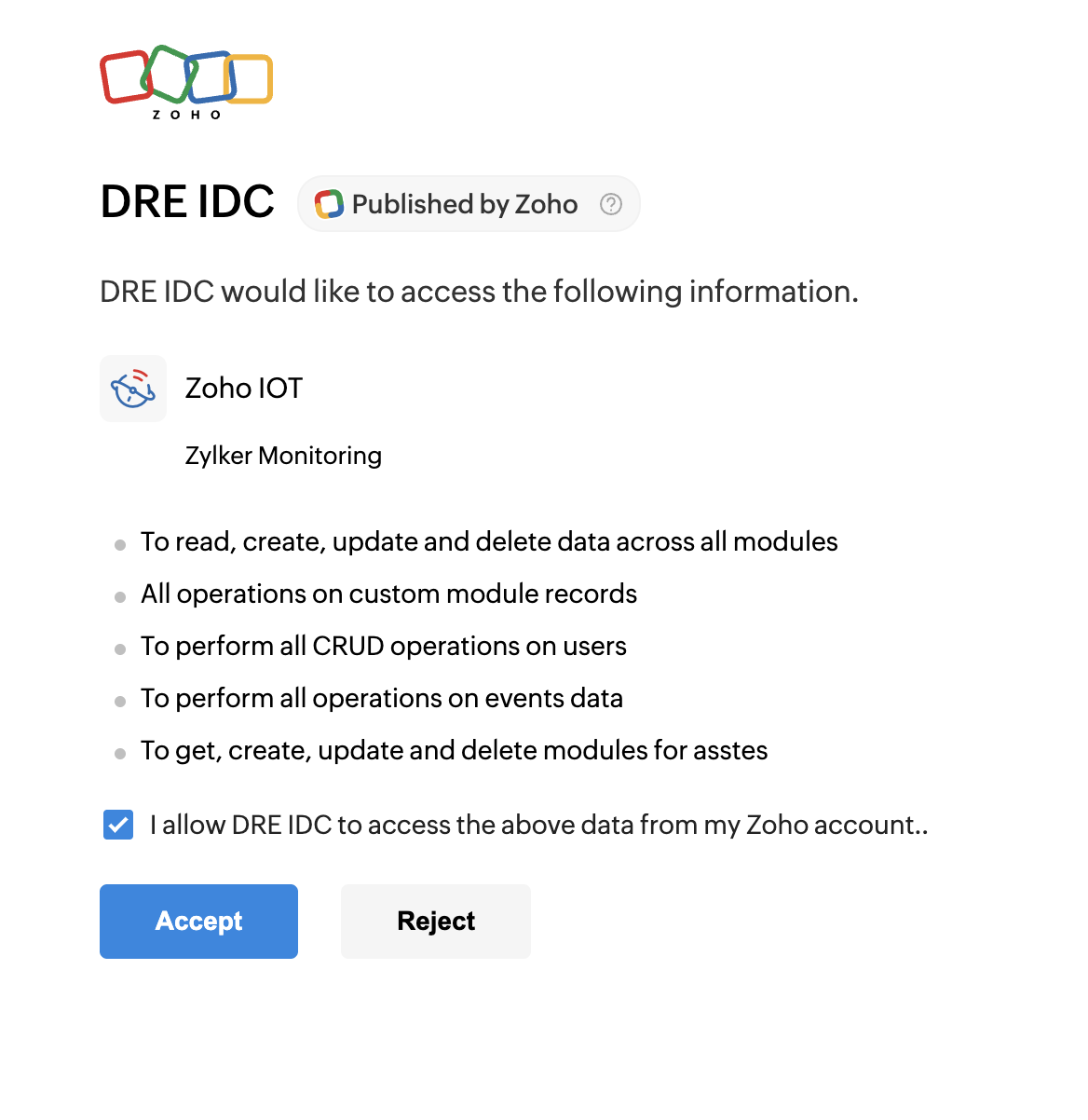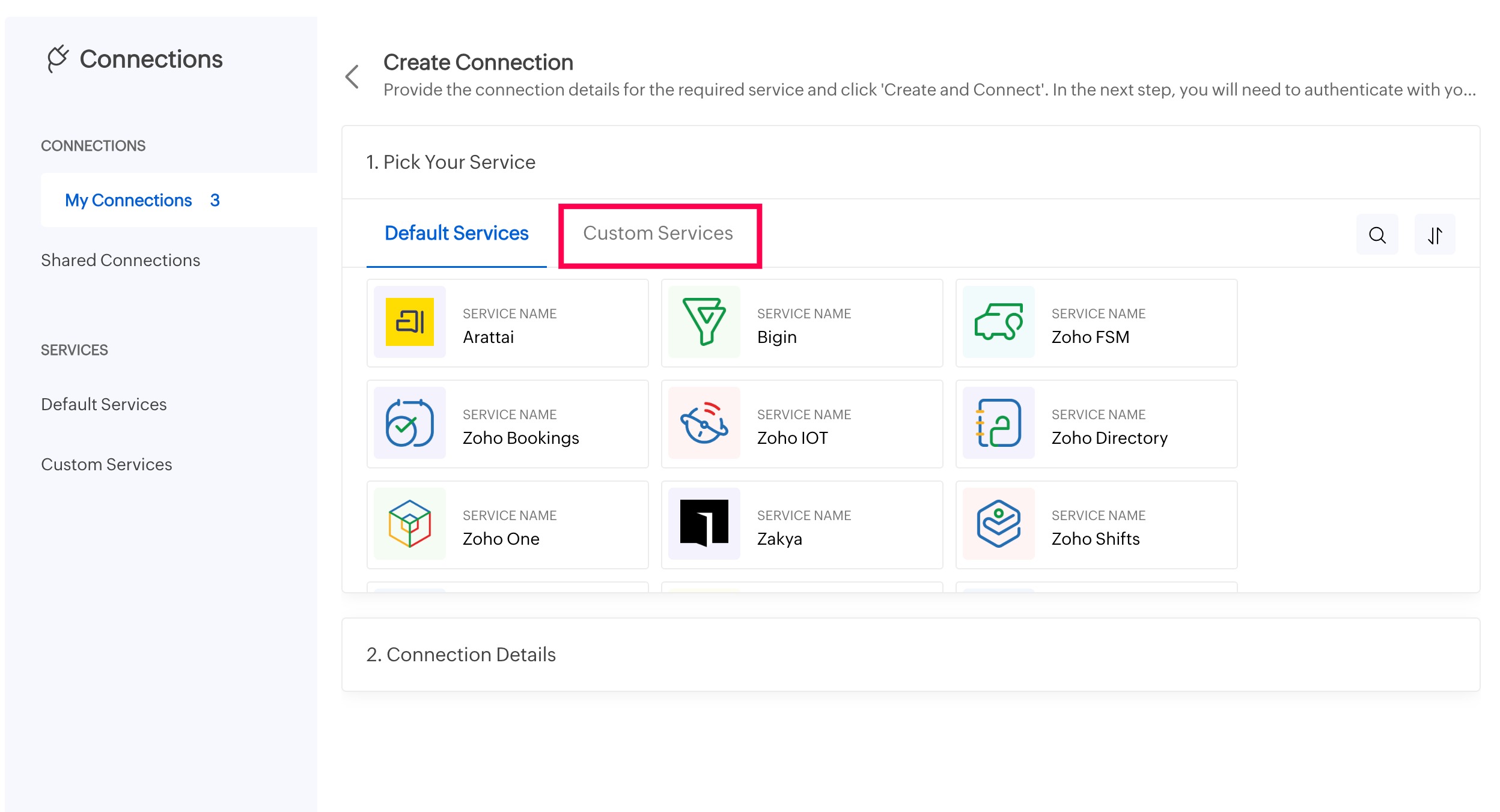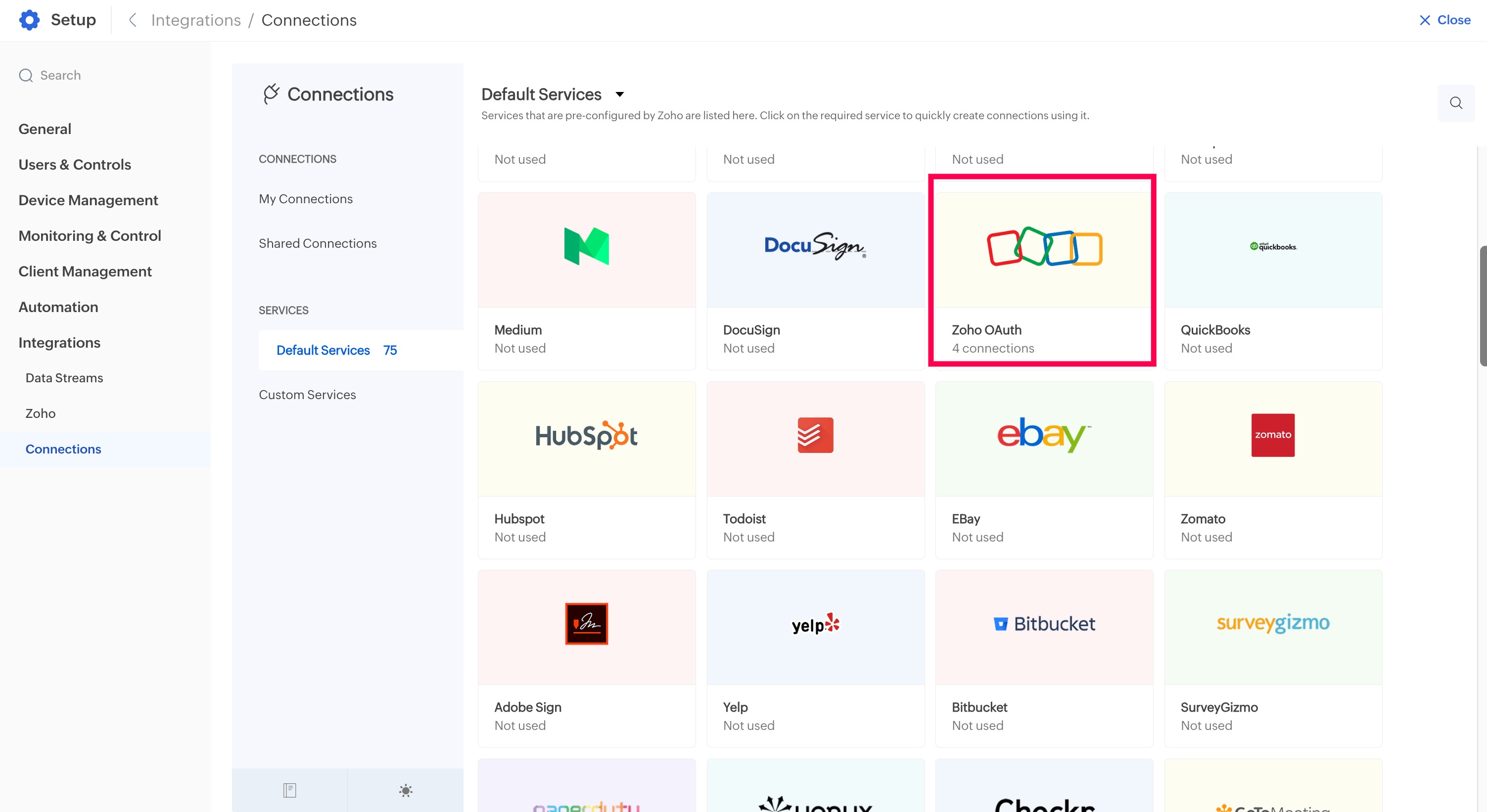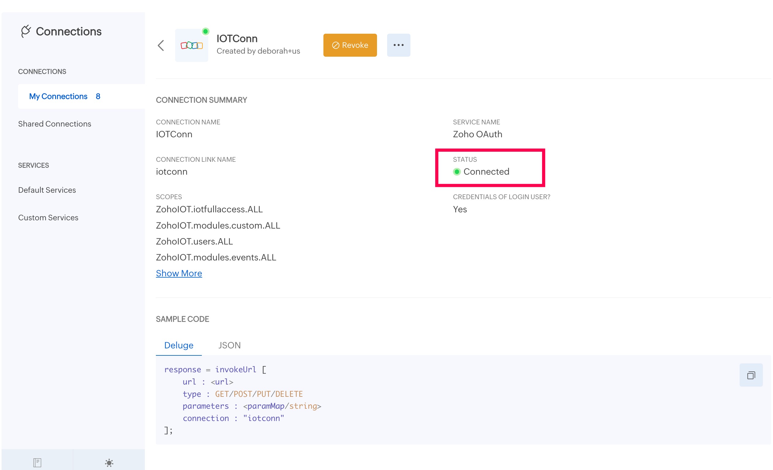 Note: For existing default services, when certain scopes are not listed we can add connections for those scopes also via custom service like accessing time series data in Zoho IoT.