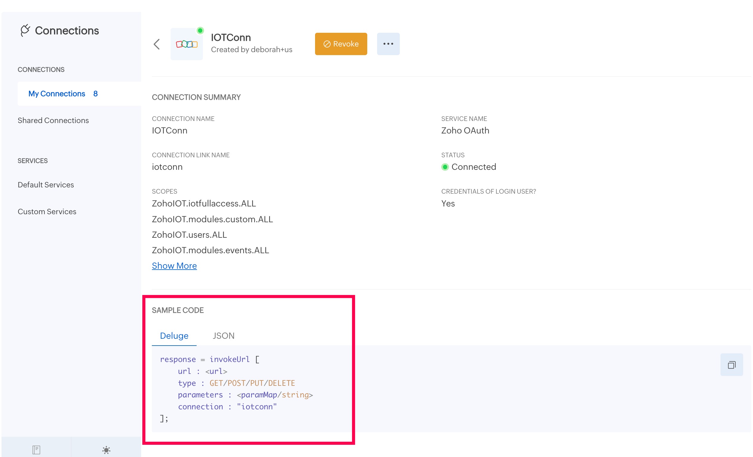 Note: The Deluge and JSon sample code will be displayed in the respective tabs below the Connection Summary. The entries in the codes such as url, type, parameters, and connection can be used inside the Deluge Script (in custom function) to establish the connection.