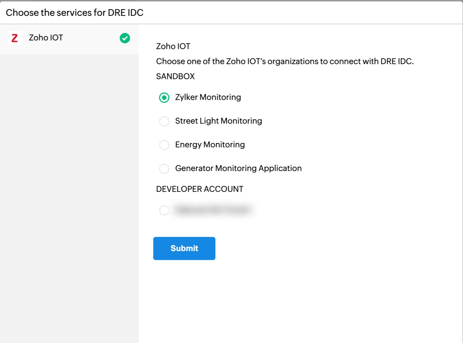 11. In the case of multiple applications, select the Application for which you want to associate the newly created connection.12. Click Submit. The DRE IDC screen with the selected service and scope is displayed. This is required for providing access to data.