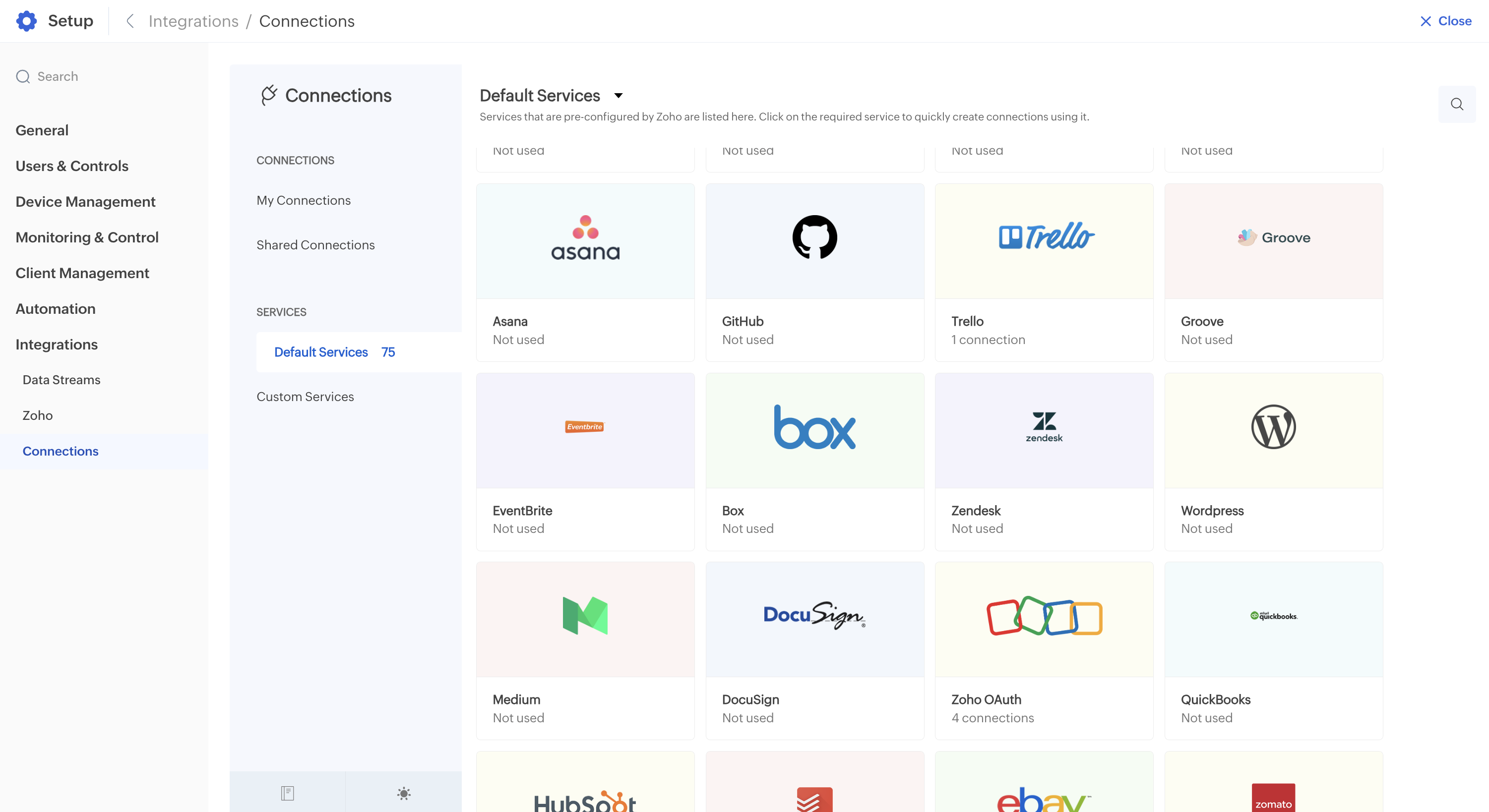 These are pre-configured services available in Zoho IoT. You can easily create a connection for any of the default services listed and authenticate it using your credentials.These default services are provided to simplify and speed up integration between Zoho IoT and other Zoho applications such as Creator, CRM, Books, Contacts, Mail, and others that organizations commonly use. Each of these pre-configured services includes the necessary OAuth scopes, endpoints, and authentication settings, so you don’t have to manually configure them.