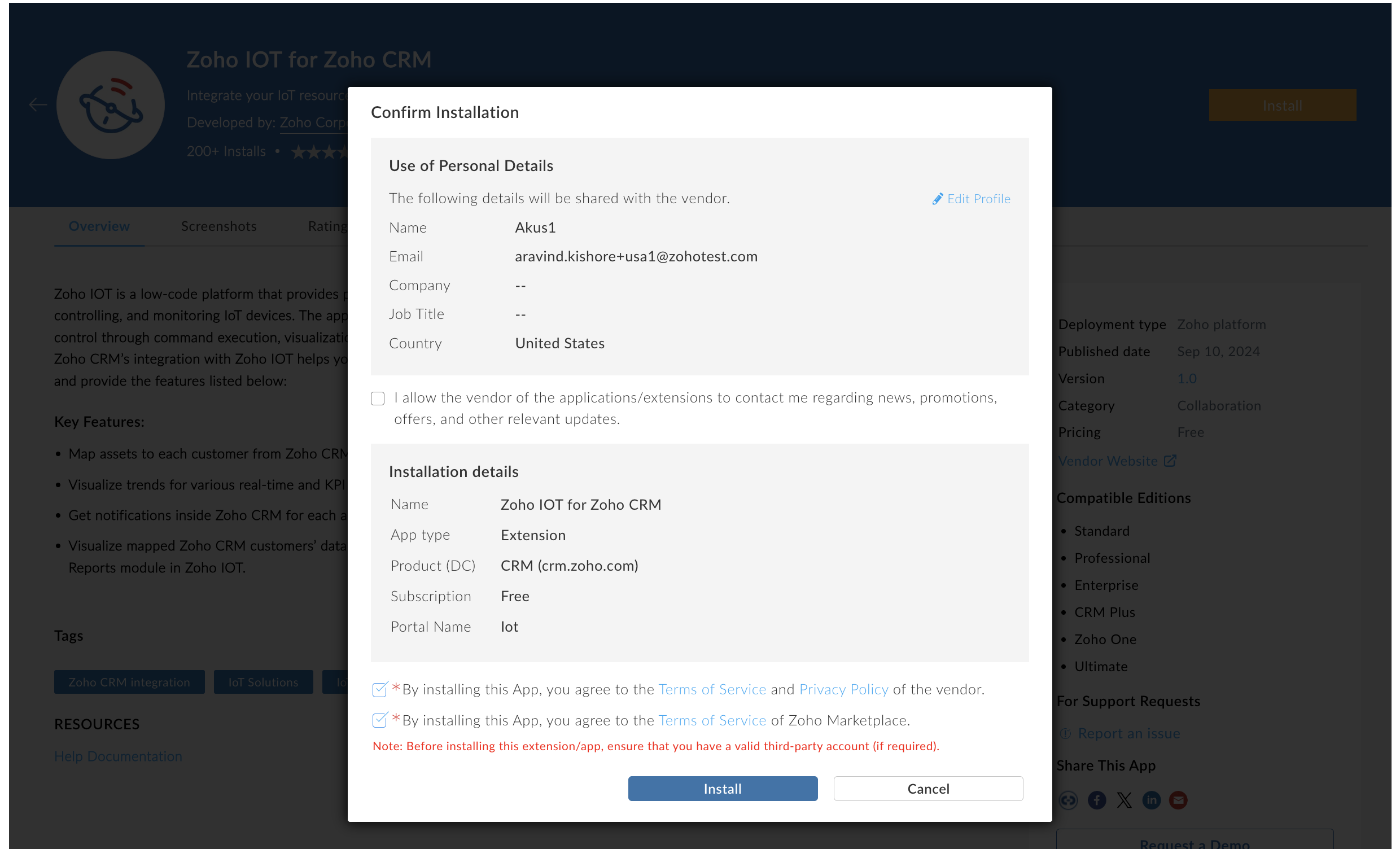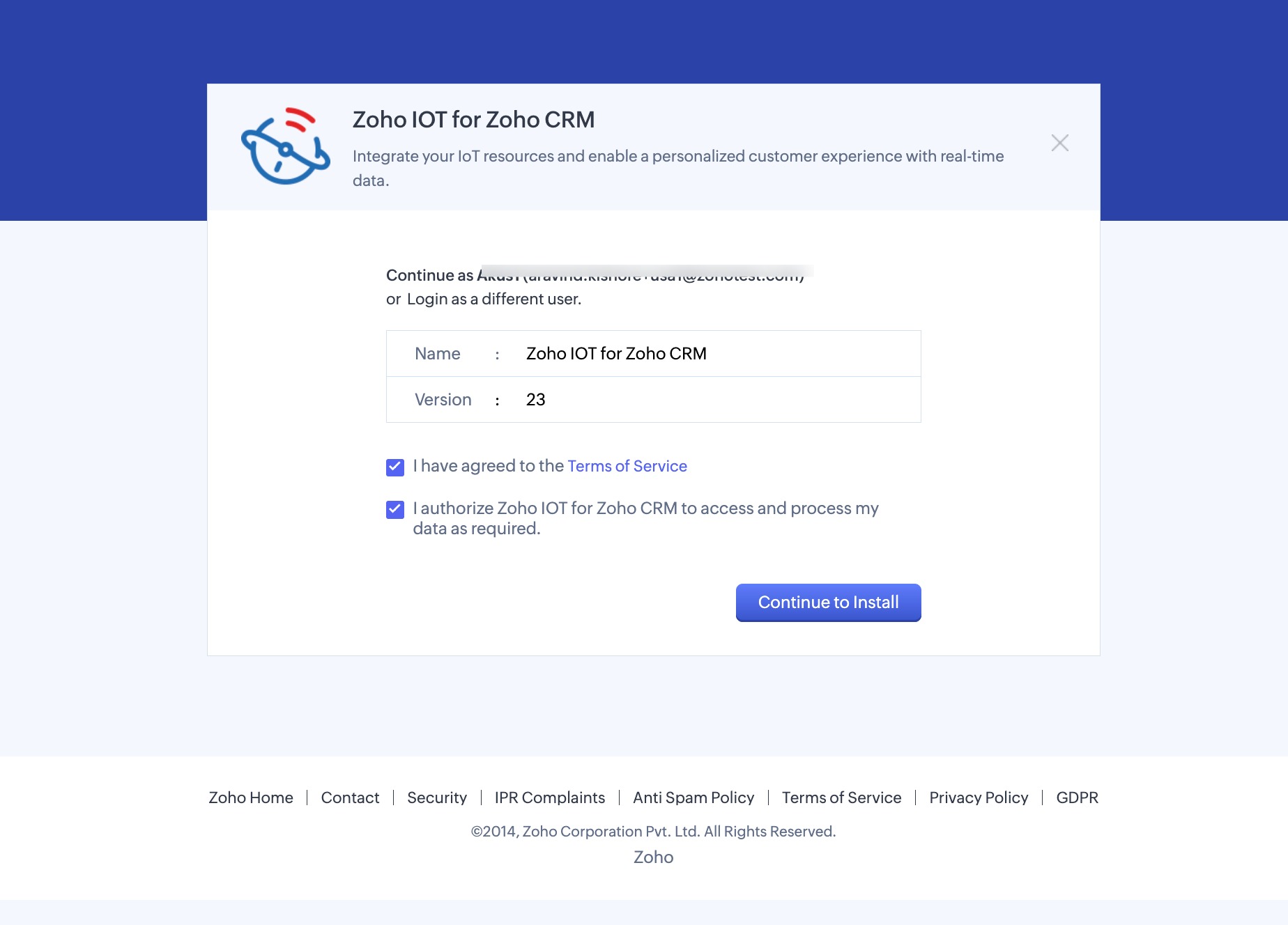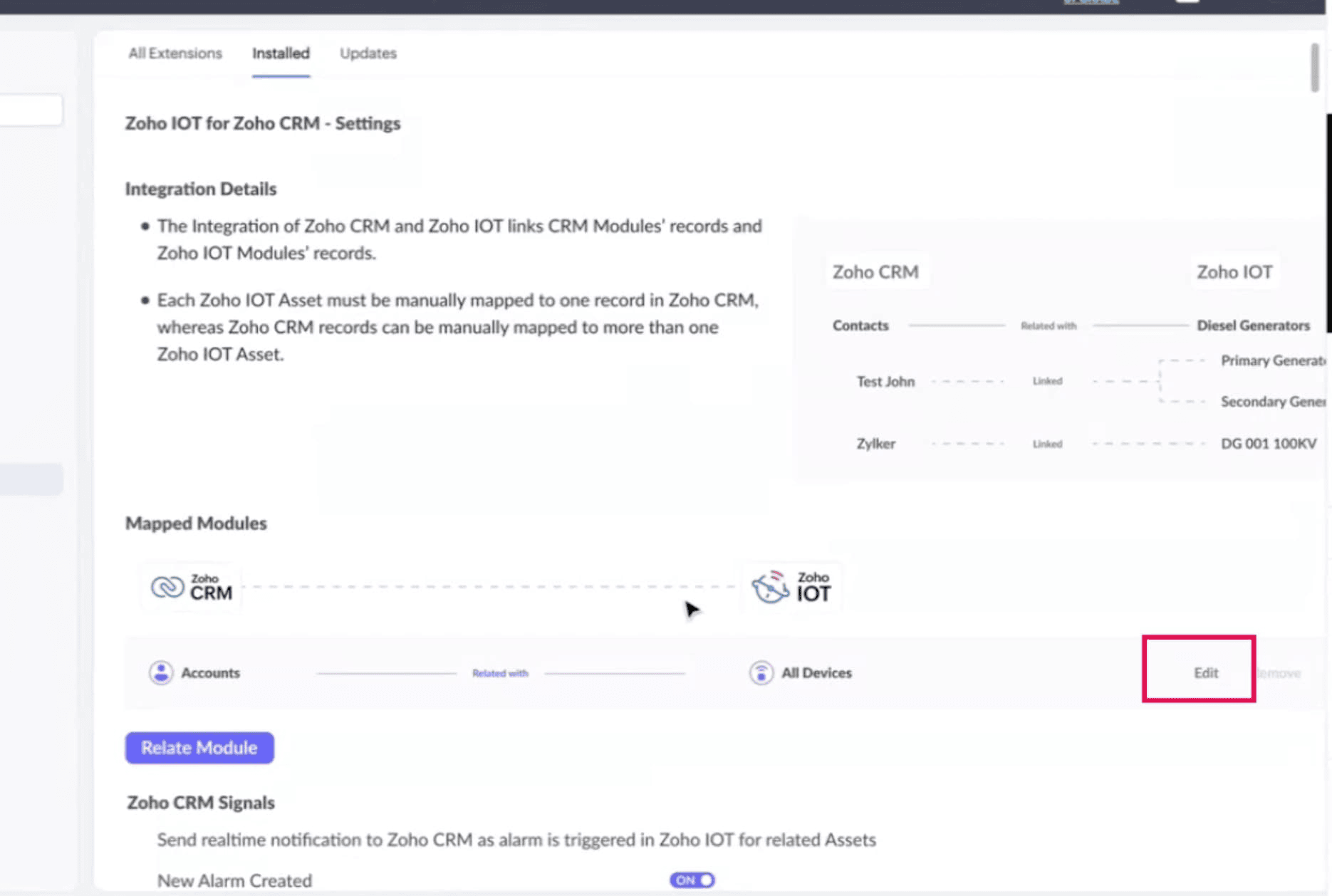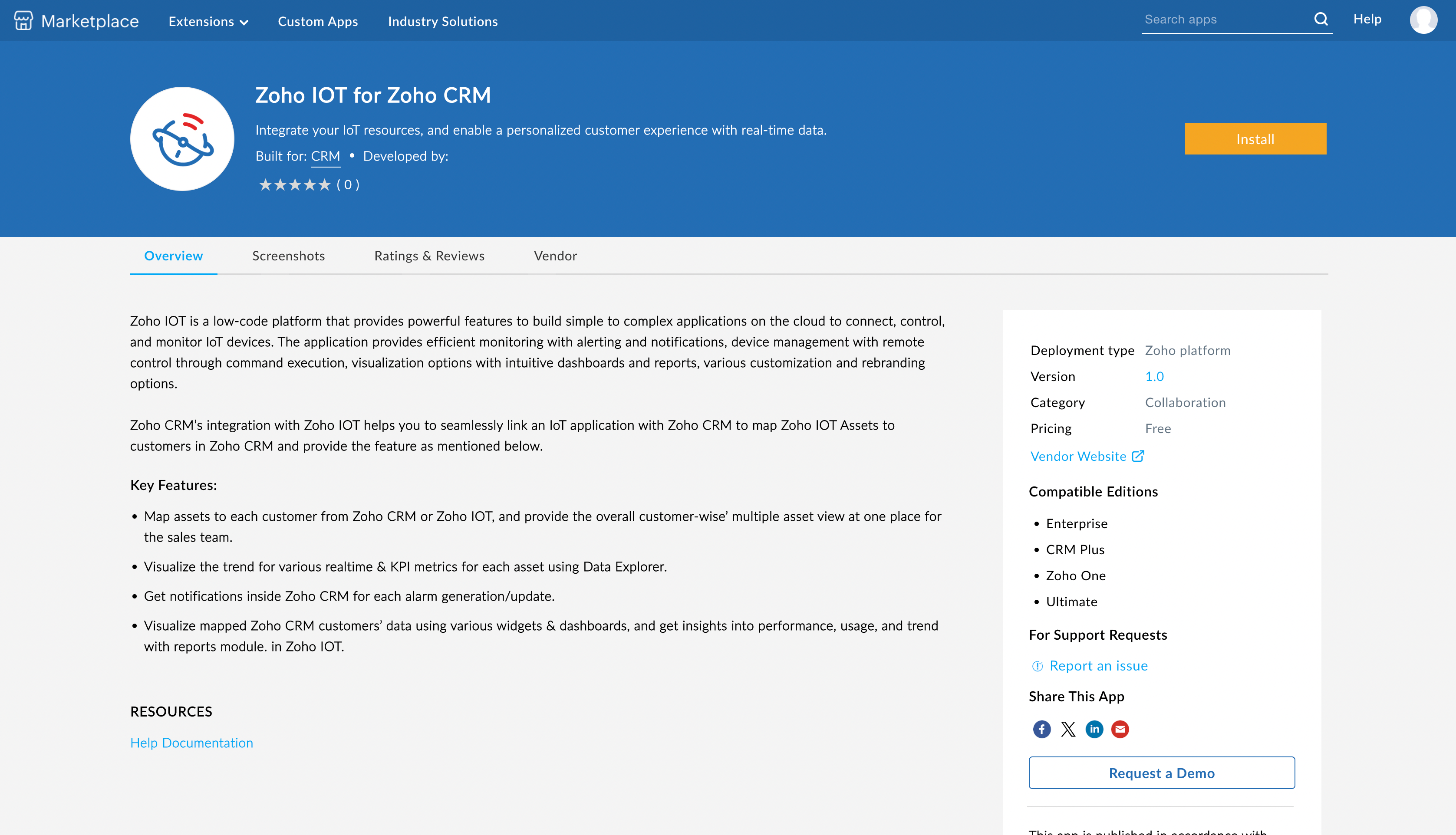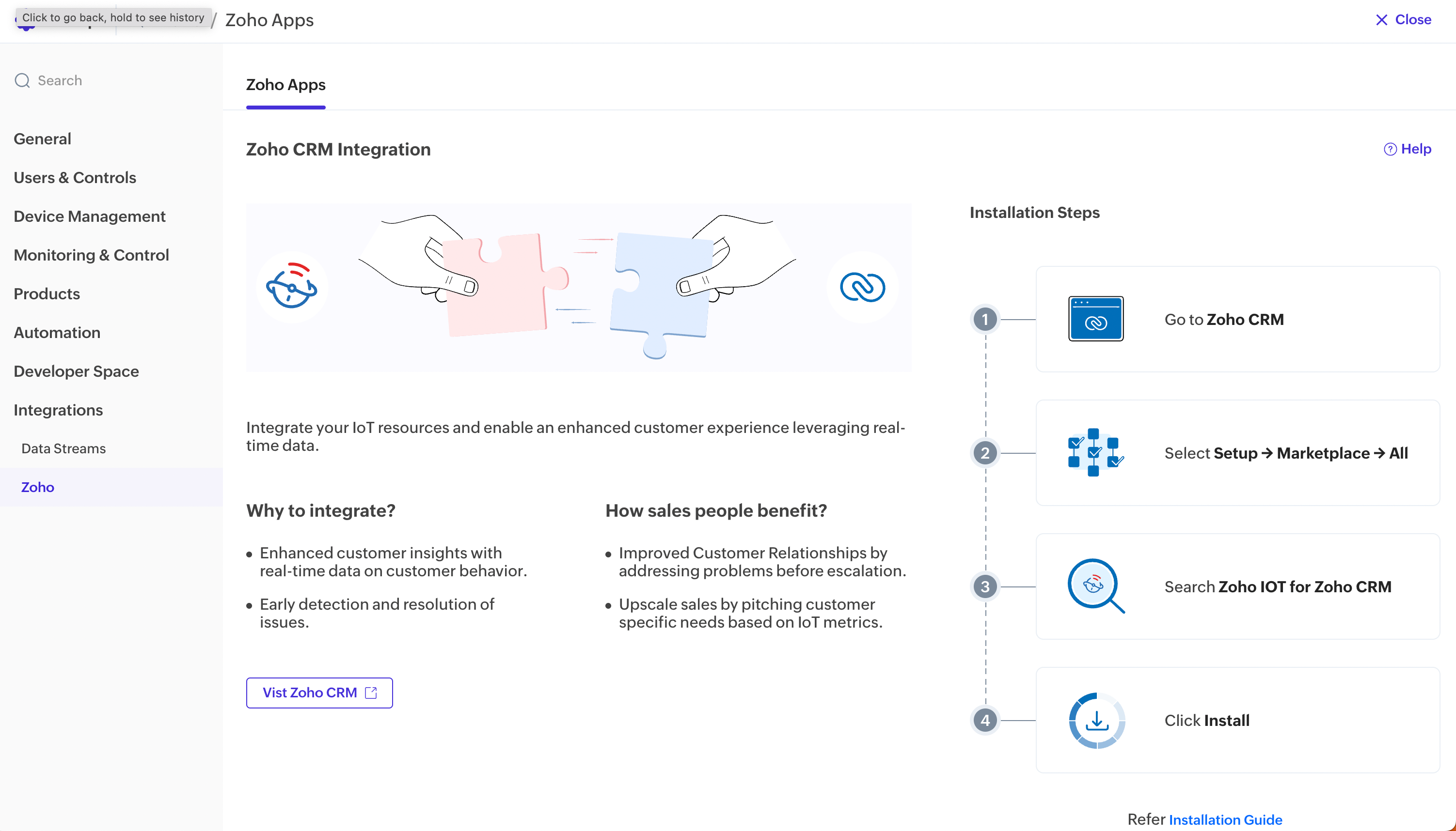 Installing Zoho IoT inside Zoho CRM is the first step towards integration. You can install Zoho IoT for Zoho CRM either from
