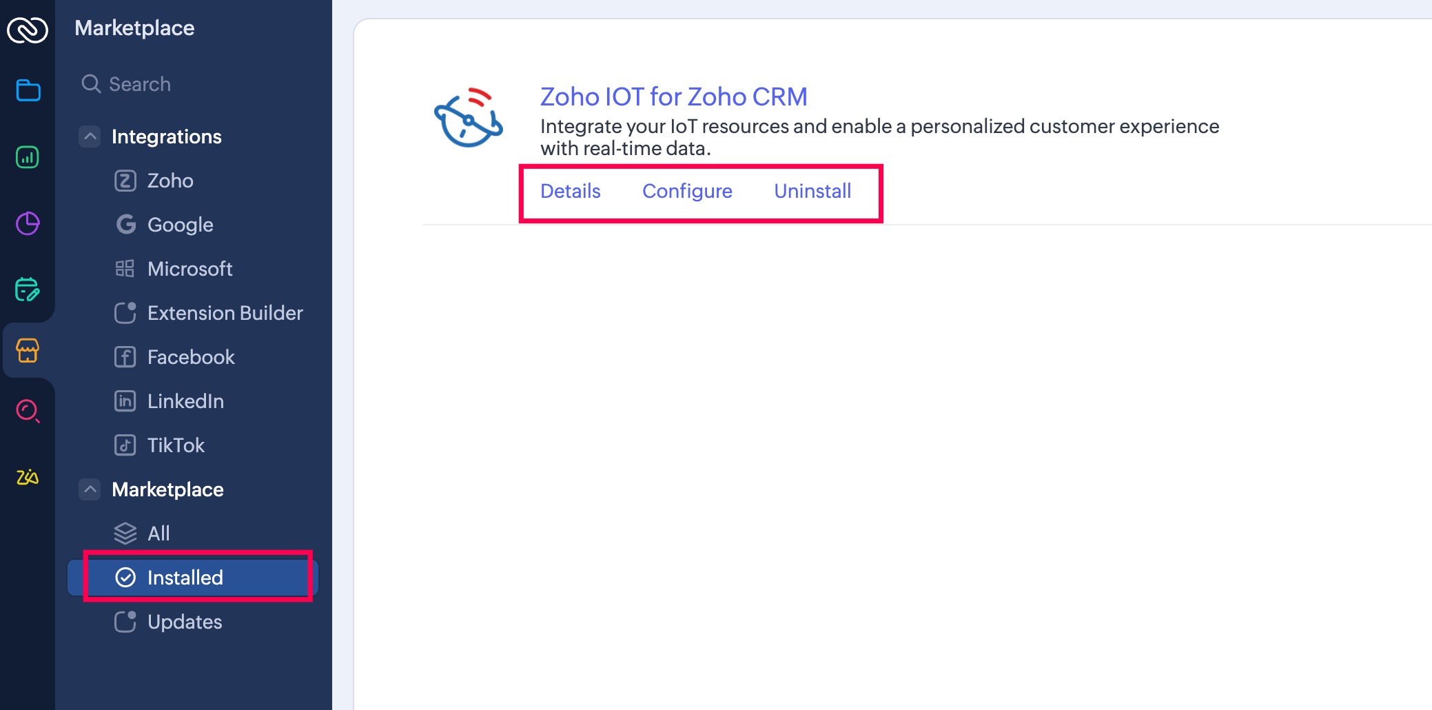 After integrating the application successfully, you can view the details, configure the modules and other settings, and uninstall the application from the Installed tab under Zoho CRM Marketplace.