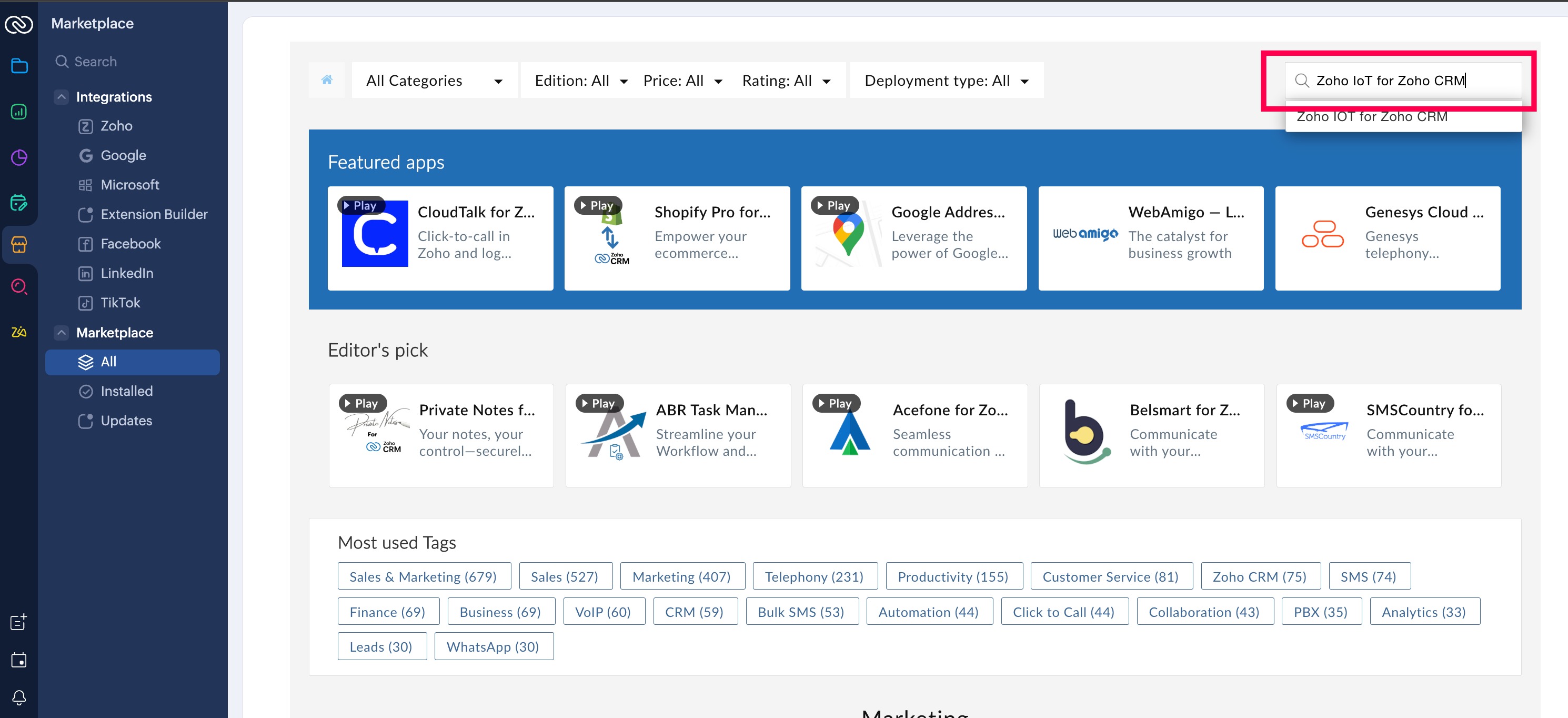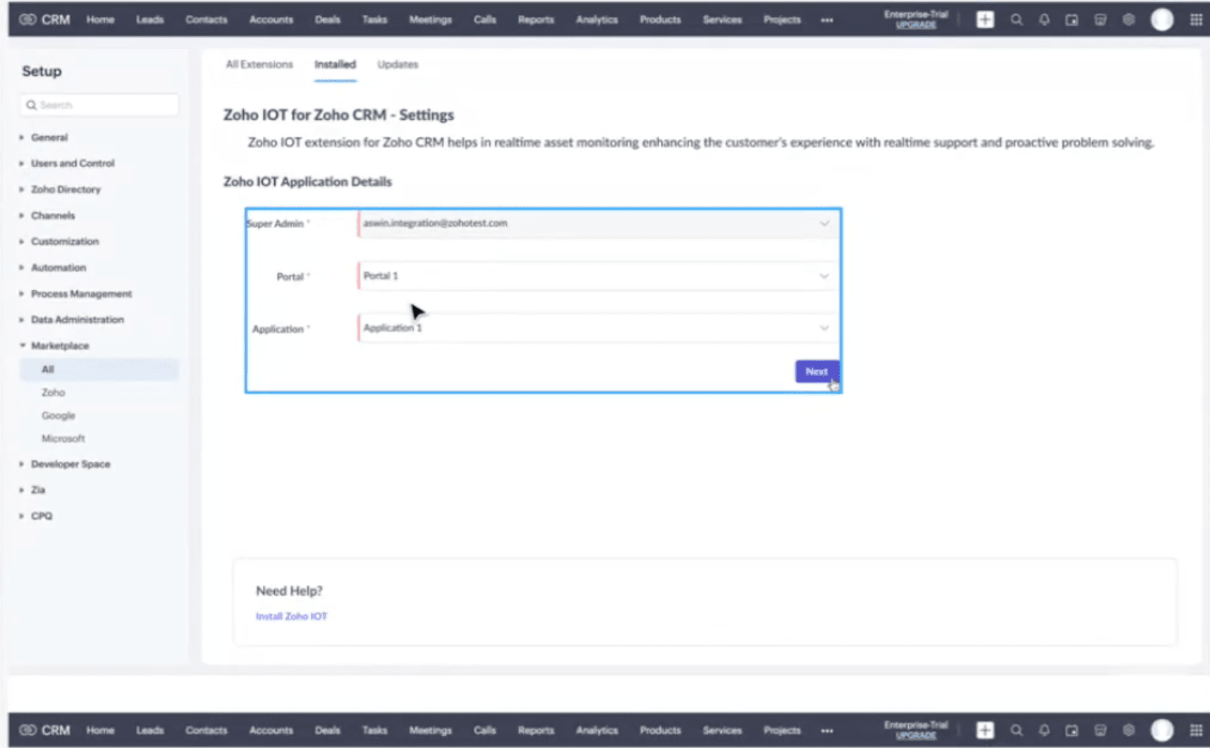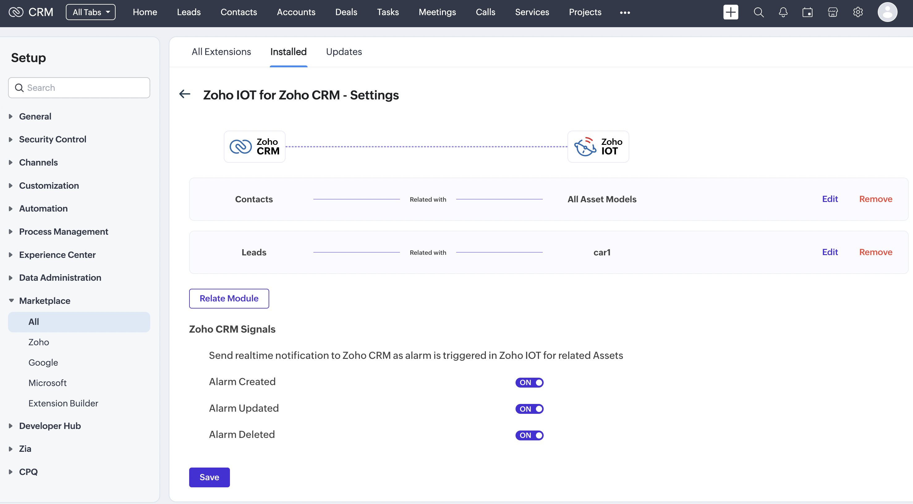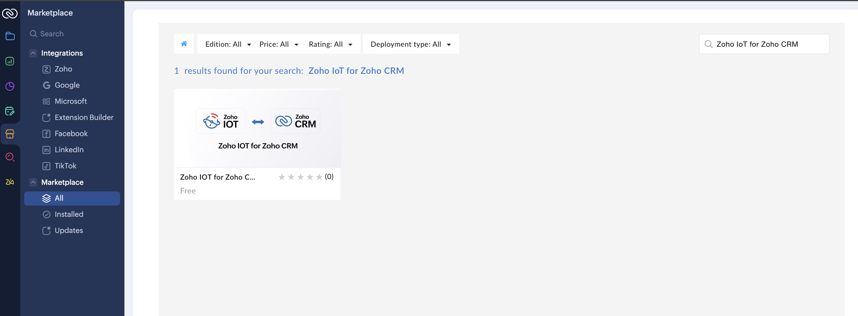 There are two ways to install the Zoho CRM extension: Direct from your Zoho IoT or from your Zoho CRM account via Market Place.