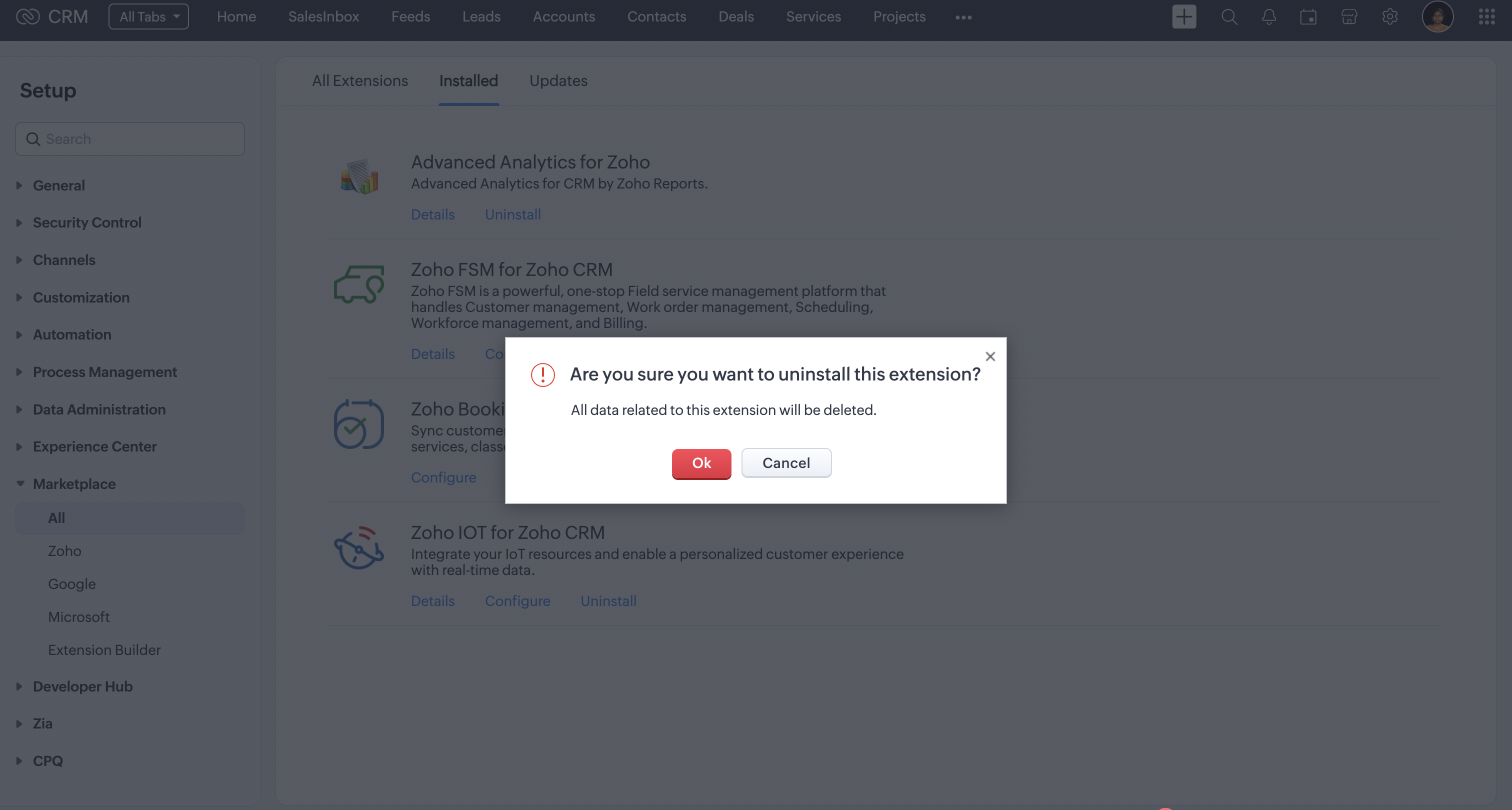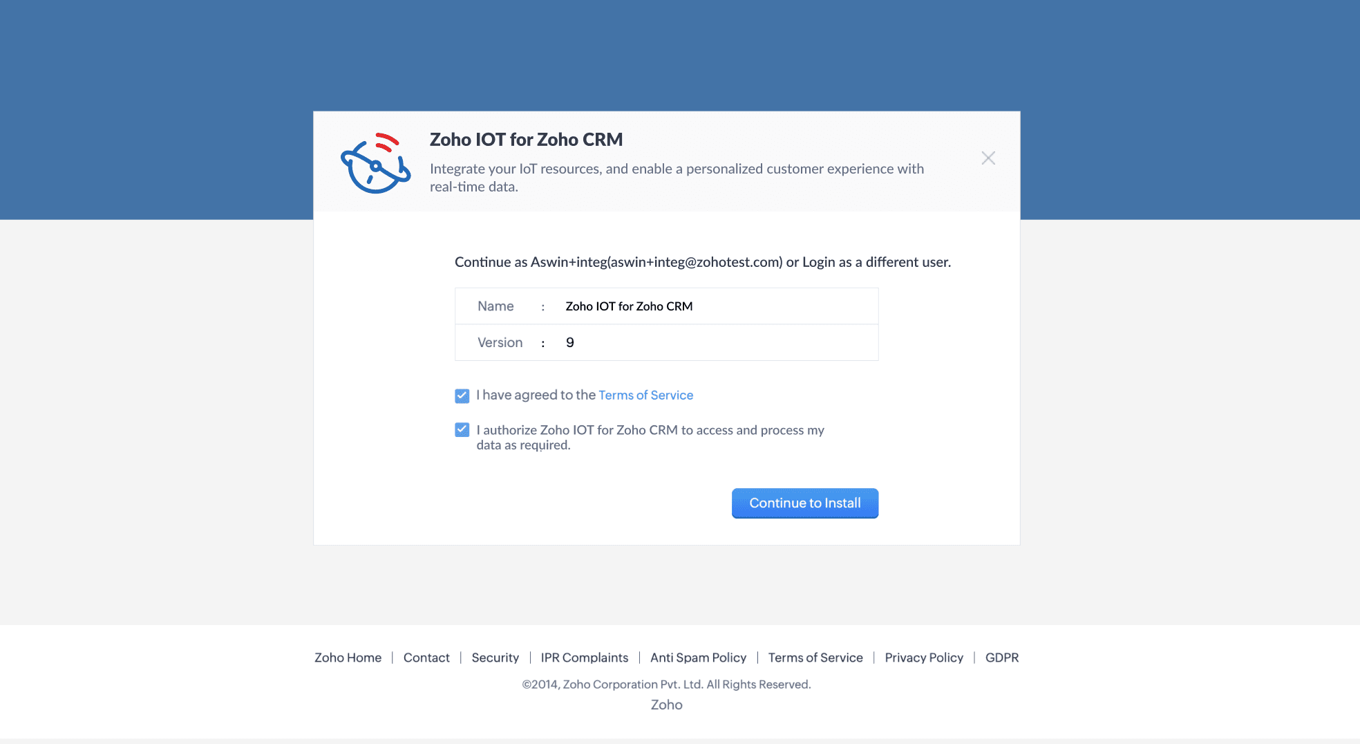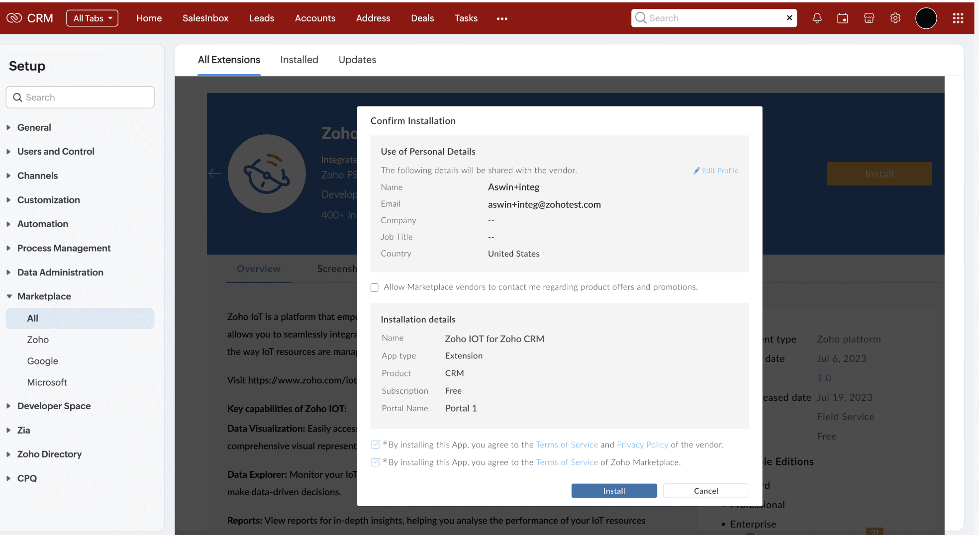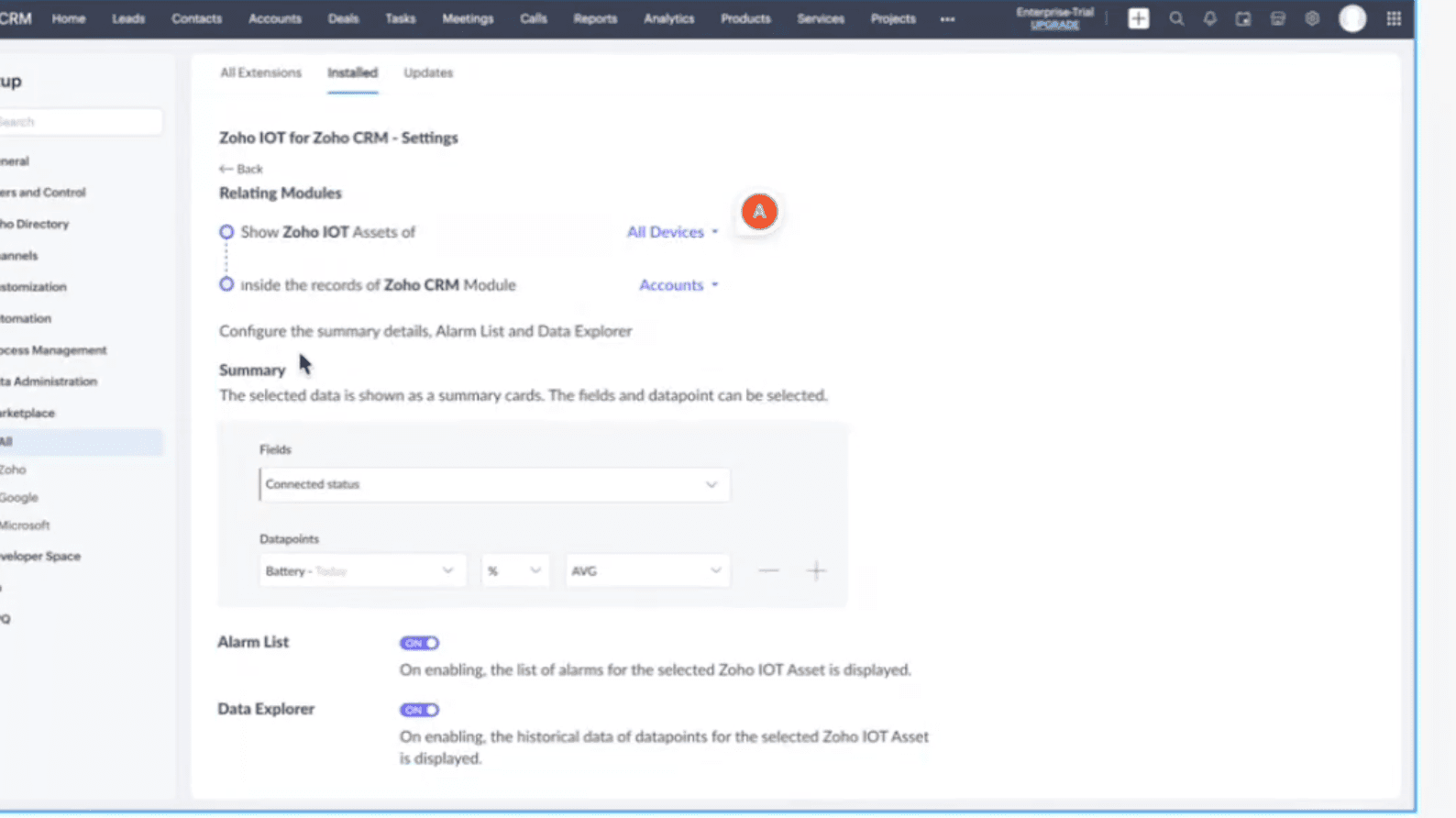 There are two ways to install the Zoho CRM extension: Direct from your Zoho IoT or from your Zoho CRM account via Market Place.