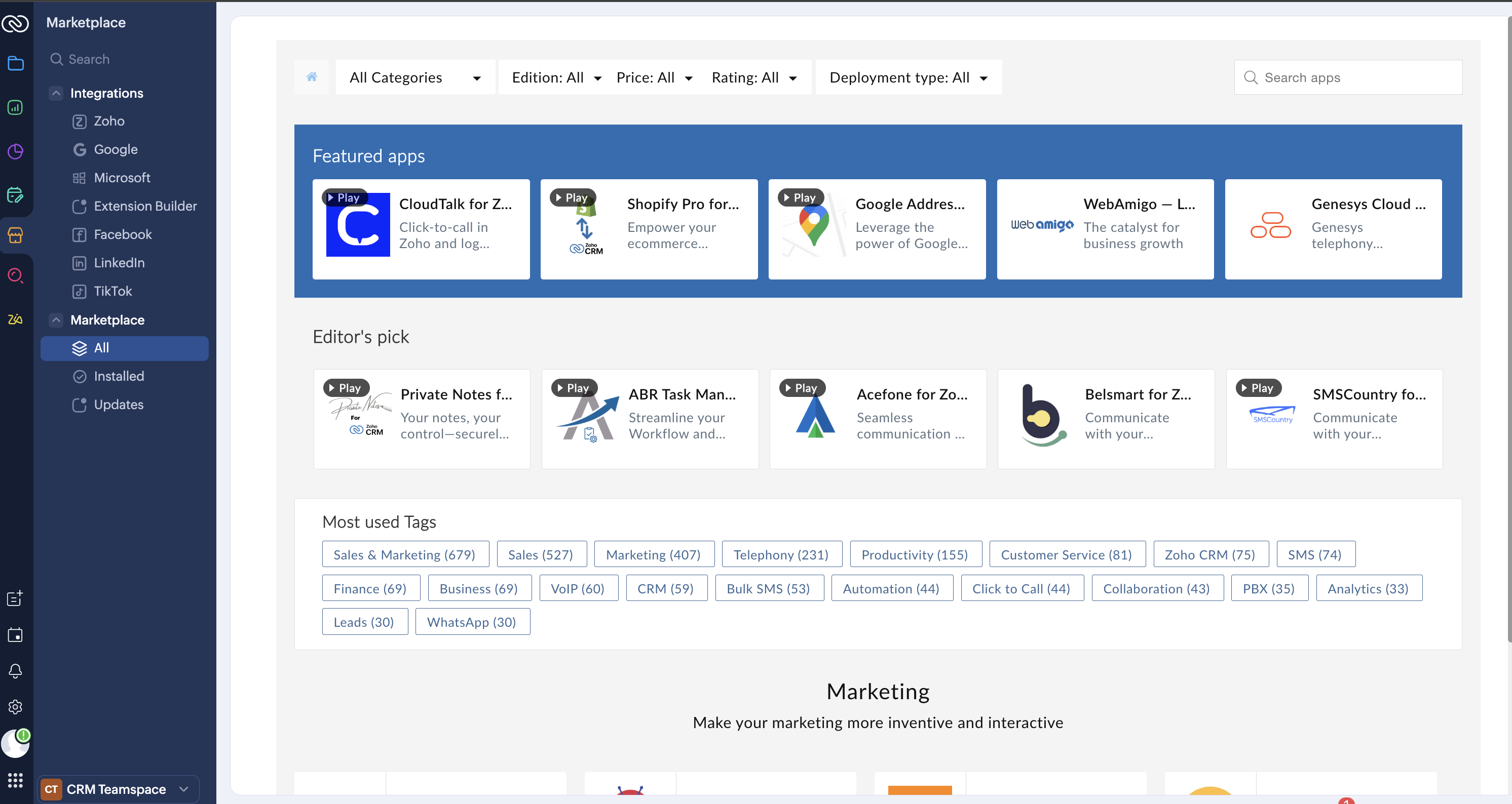 v. Click Visit Zoho CRM. The CRM Market Place page is displayed.