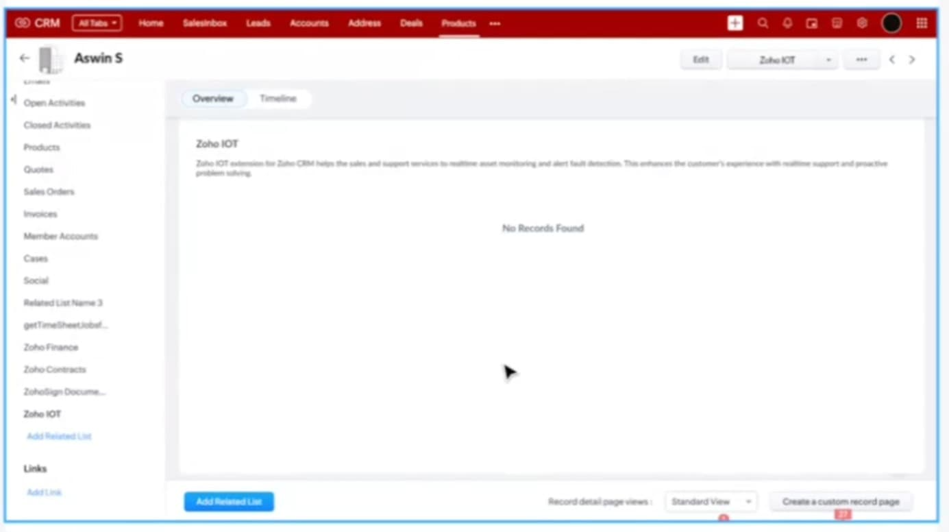 After integrating Zoho CRM with Zoho IoT, the collected data can be used in the CRM application to enhance the company solarK's various operations, such as customer service, streamline operations, and including service, as given below.