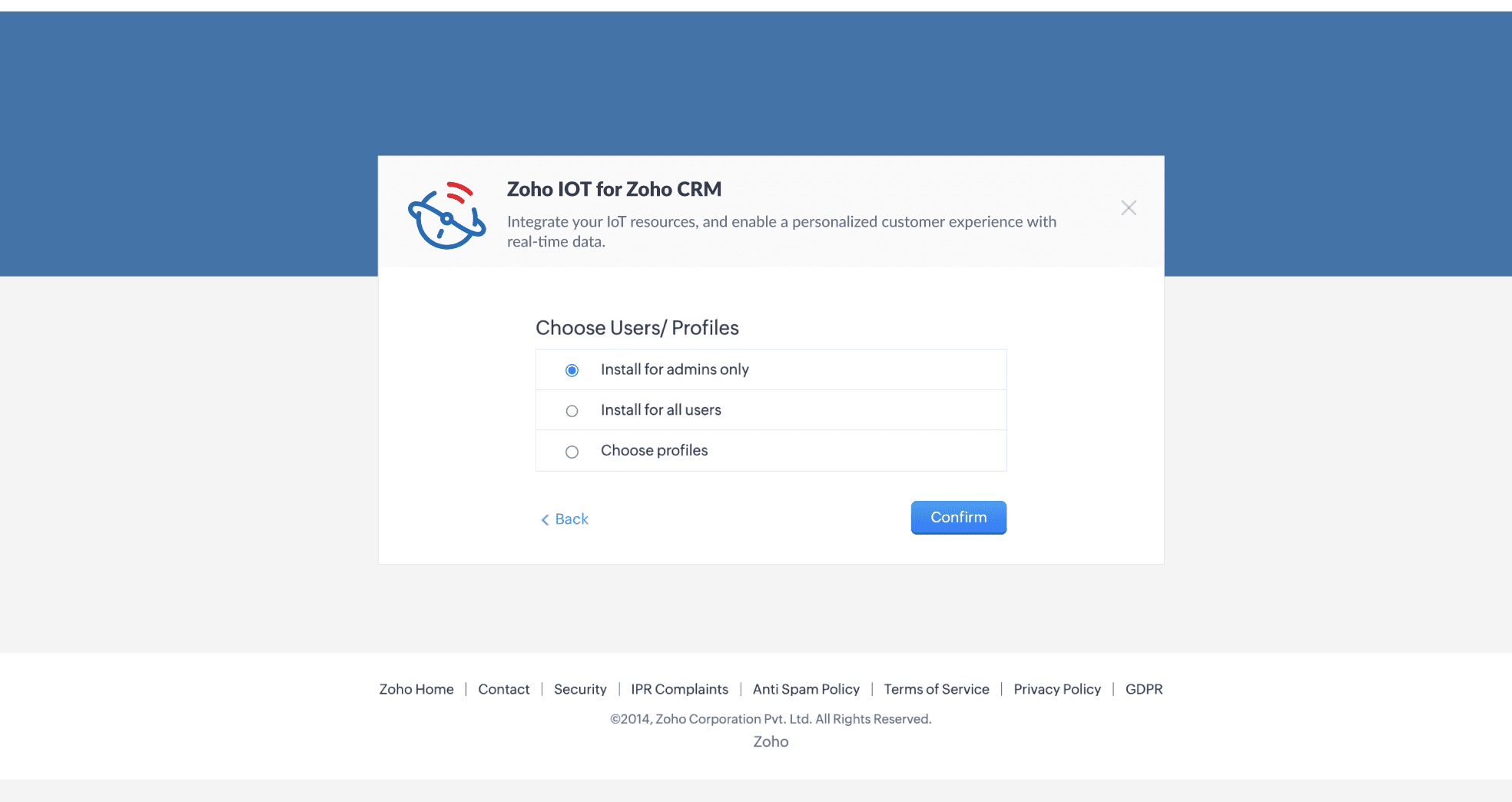 To provide access to this extension to users in your Zoho CRM account, choose one of the following and click Confirm: