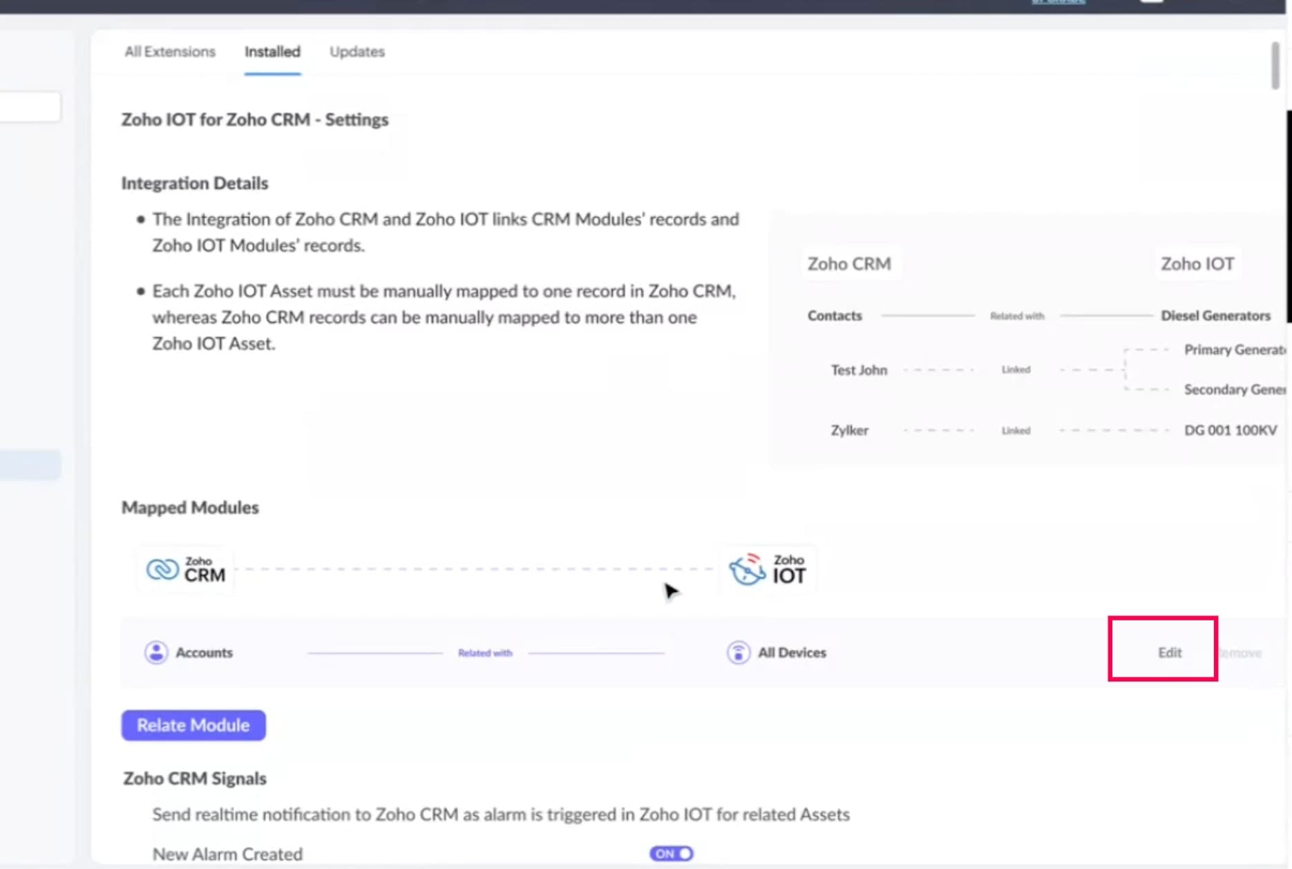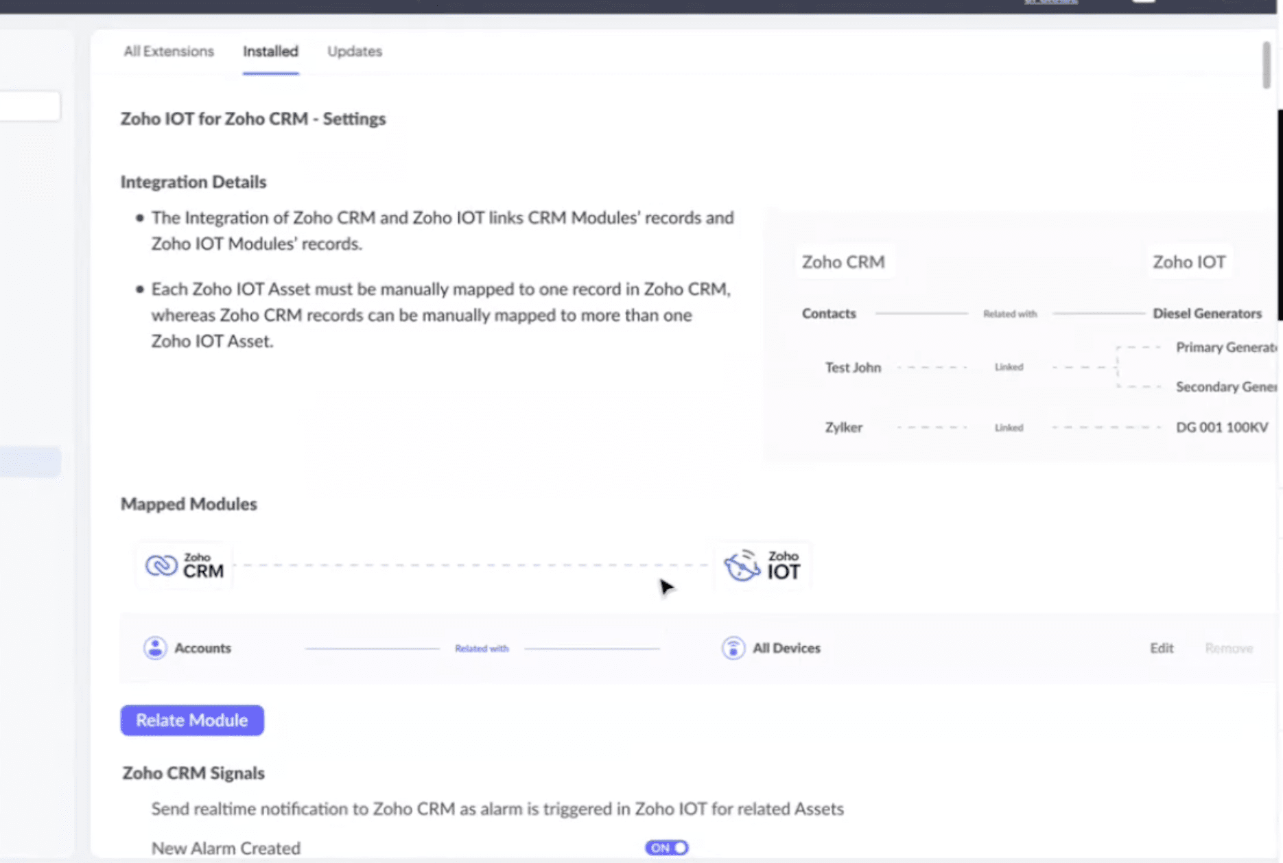 * Association/disassociation of Zoho IoT and Zoho CRM data.
