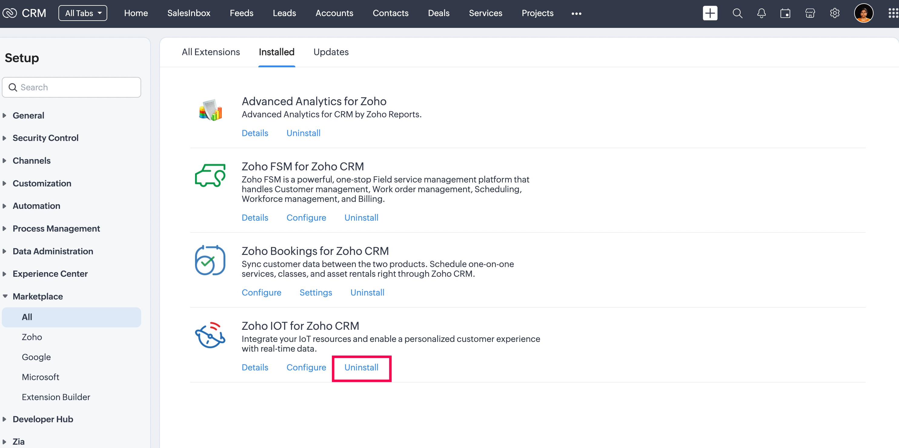 2. Click the Installed tab, and click Uninstall for Zoho IoT.