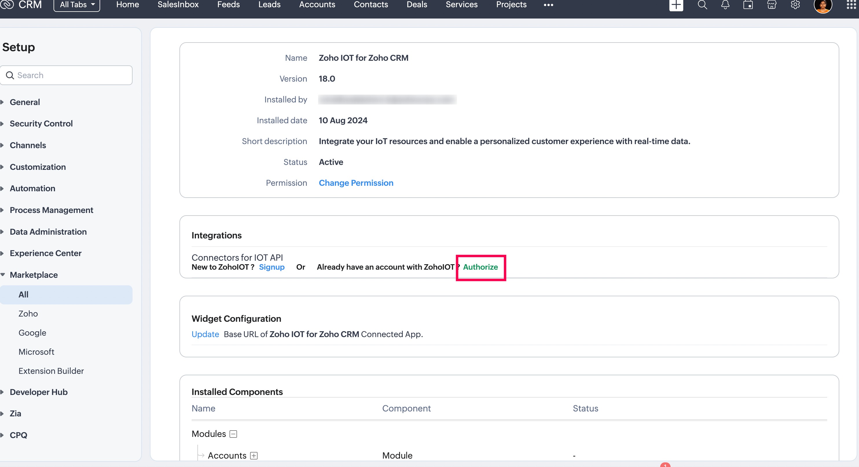 3. Click Authorize in the Details page of Zoho CRM installation. This connector will be used for authorization during uninstalling process to remove the mapping of IoT data with CRM.