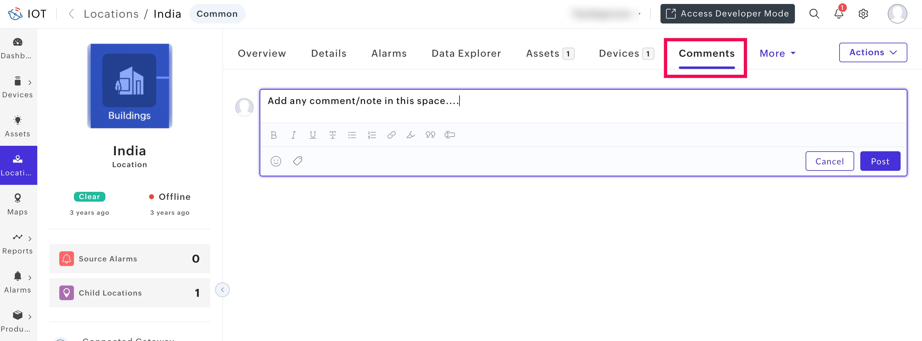 1. Click the Comments tab, and Click Add Comments button.The Comments feature is currently in its beta stage with further enhancements planned in the product roadmap. Contact support@zohoiot.com to enable the feature in your application.