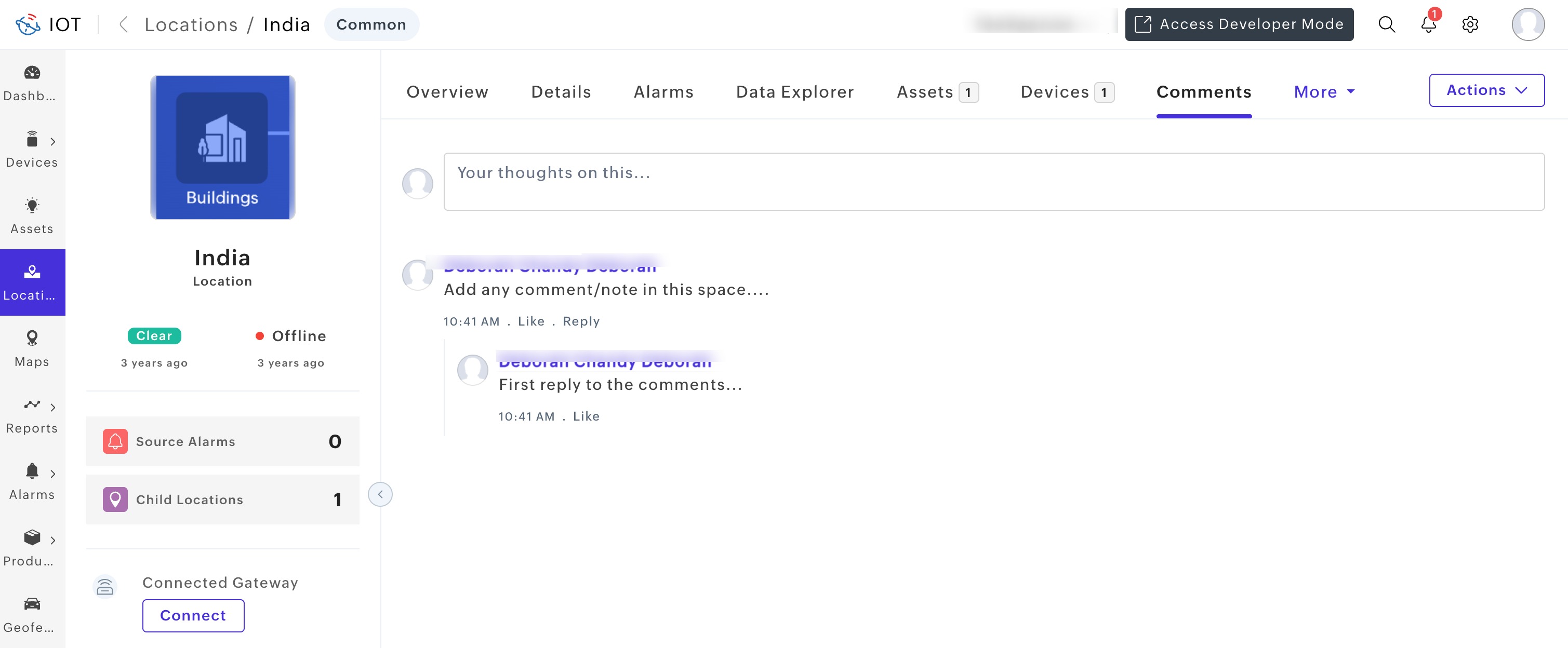 Using any of the above option, the asset will be associated to the location under which the device is created. Follow the instructions provided in the Device Creation document for details on adding a device.