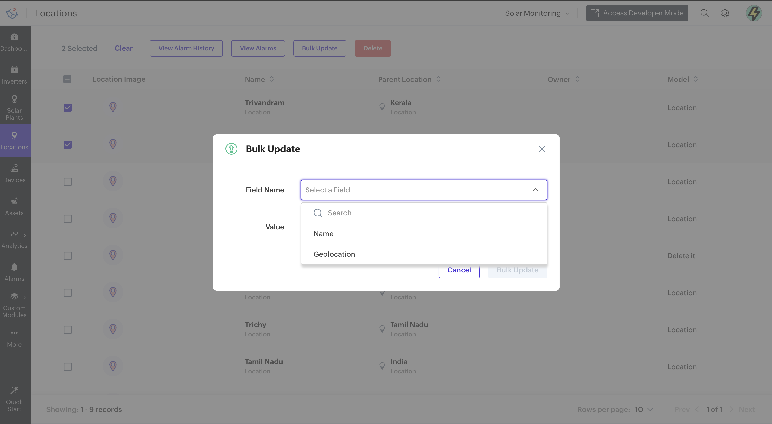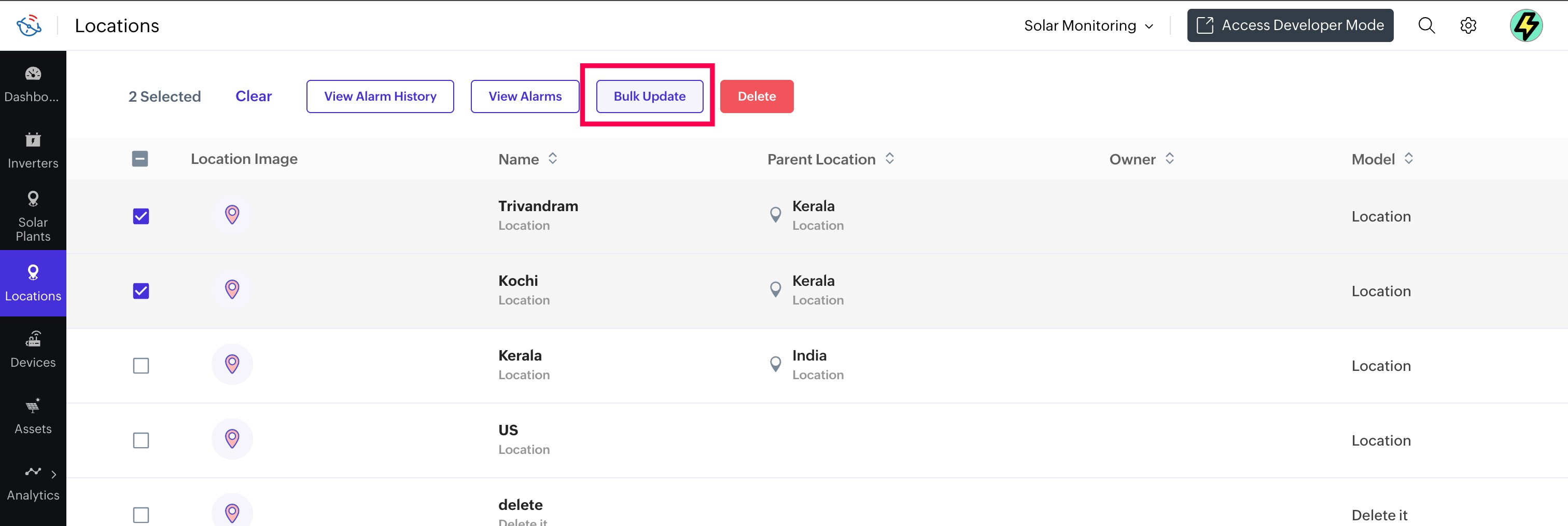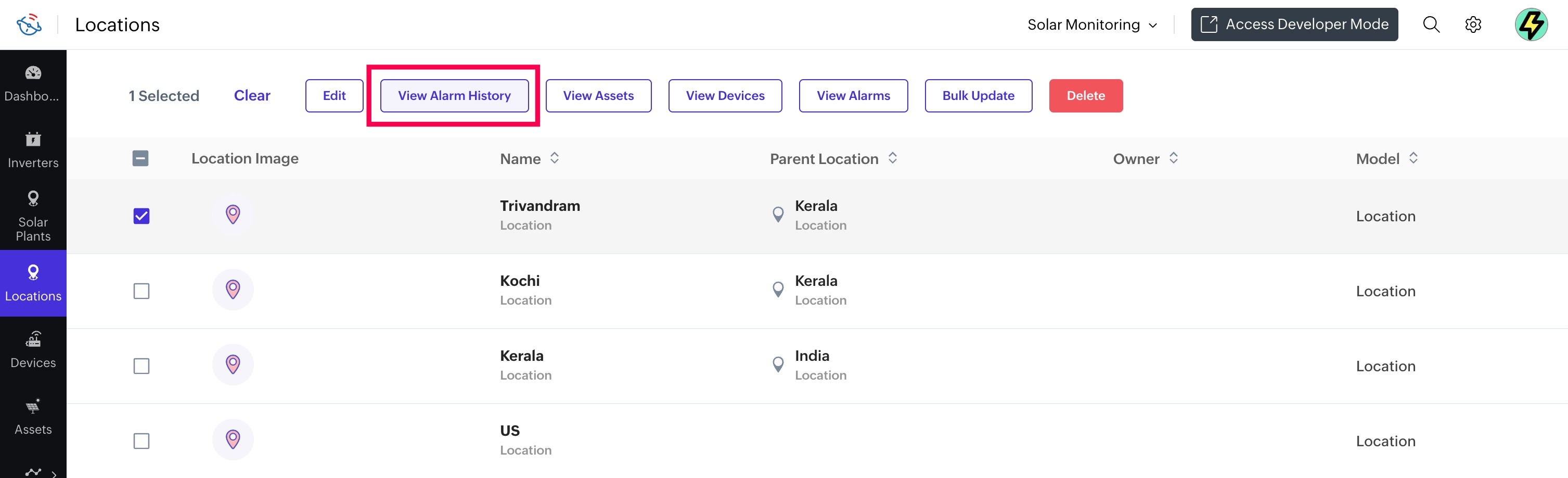 All locations present in the application is displayed in a table in the location's list view. Operations such as viewing assets, viewing devices, viewing alarms, viewing alarms history, and bulk update can be performed from the list view.View Associated Assets, Devices, and Alarms